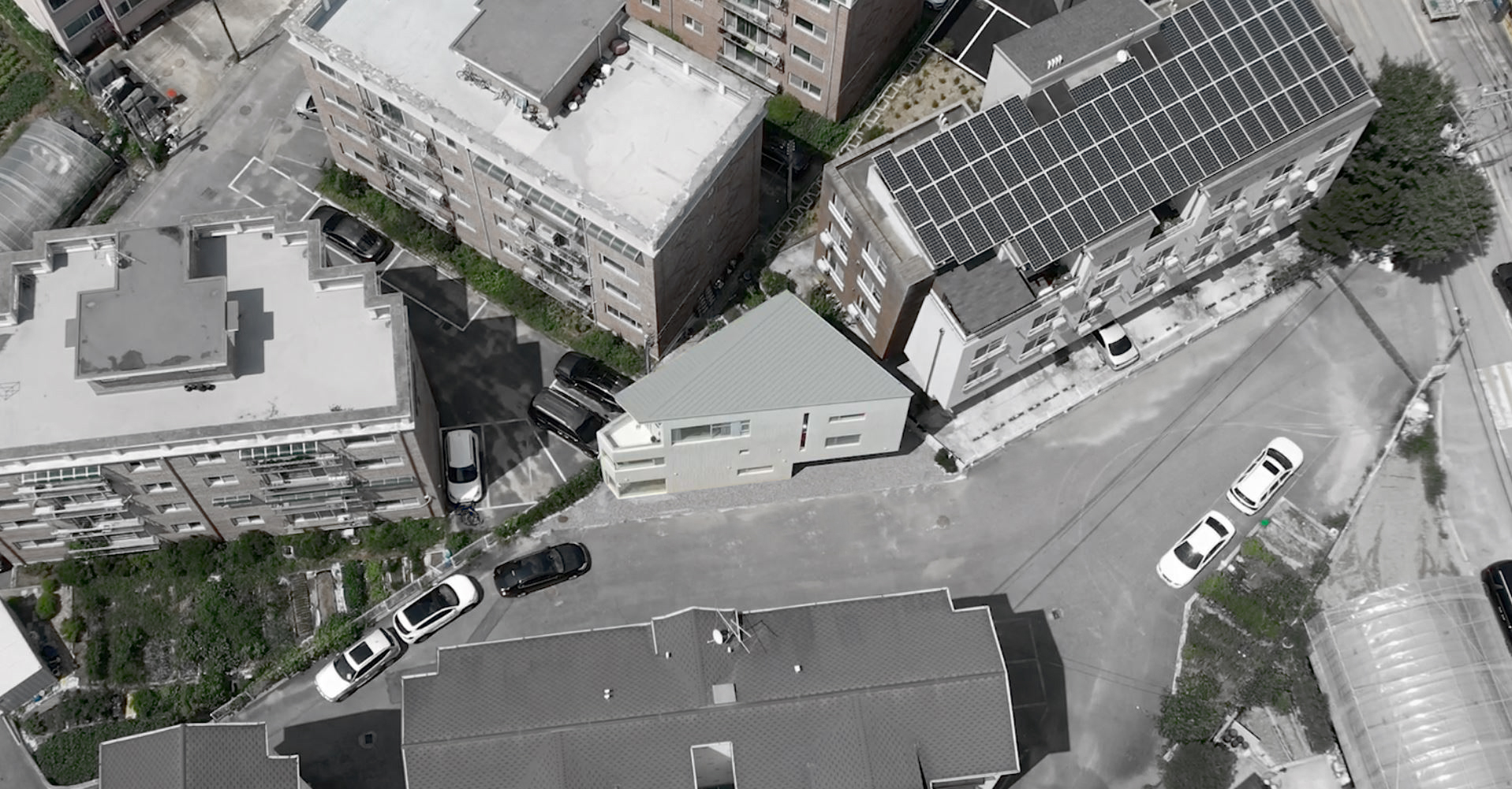 모노롱브릭 타일을 세로로 시공하여 마감된 외벽이 건축물을 규모에 비해 길고 높아 보이도록 만든다. 모든 벽면과 처마는 같은 마감재로 통일하여 온전한 매스로 느껴지도록 되어 있다. 1층의 홈오피스 공간은 원목 간살 슬라이딩 도어가 공간을 구분한다. 하나의 넓은 공간으로 사용하기도 하고 때로는 룸으로 구분하여 게스트룸 공간으로 이용할 수도 있다. 2층에는 안방과 욕실, 옷방과 세탁실이 있다. 욕실과 세탁실을 지나면 남쪽으로 부부의 침실이 배치되어 있다. 침실의 남측 창문으로는 사시사철 푸른 소나무가 보이고 하루종일 자연광이 들어온다. 주 생활 공간인 거실과 주방은 3층에 있다. 이는 1층의 홈오피스와 거리를 두어 일과 일상의 경계를 명확하게 구분한다. 건축가는 추후 1층을 근린생활시설로 용도변경 할 수 있도록 별도 출입구도 마련하고 수도, 전기 등 설비도 2, 3층과 분리했다.