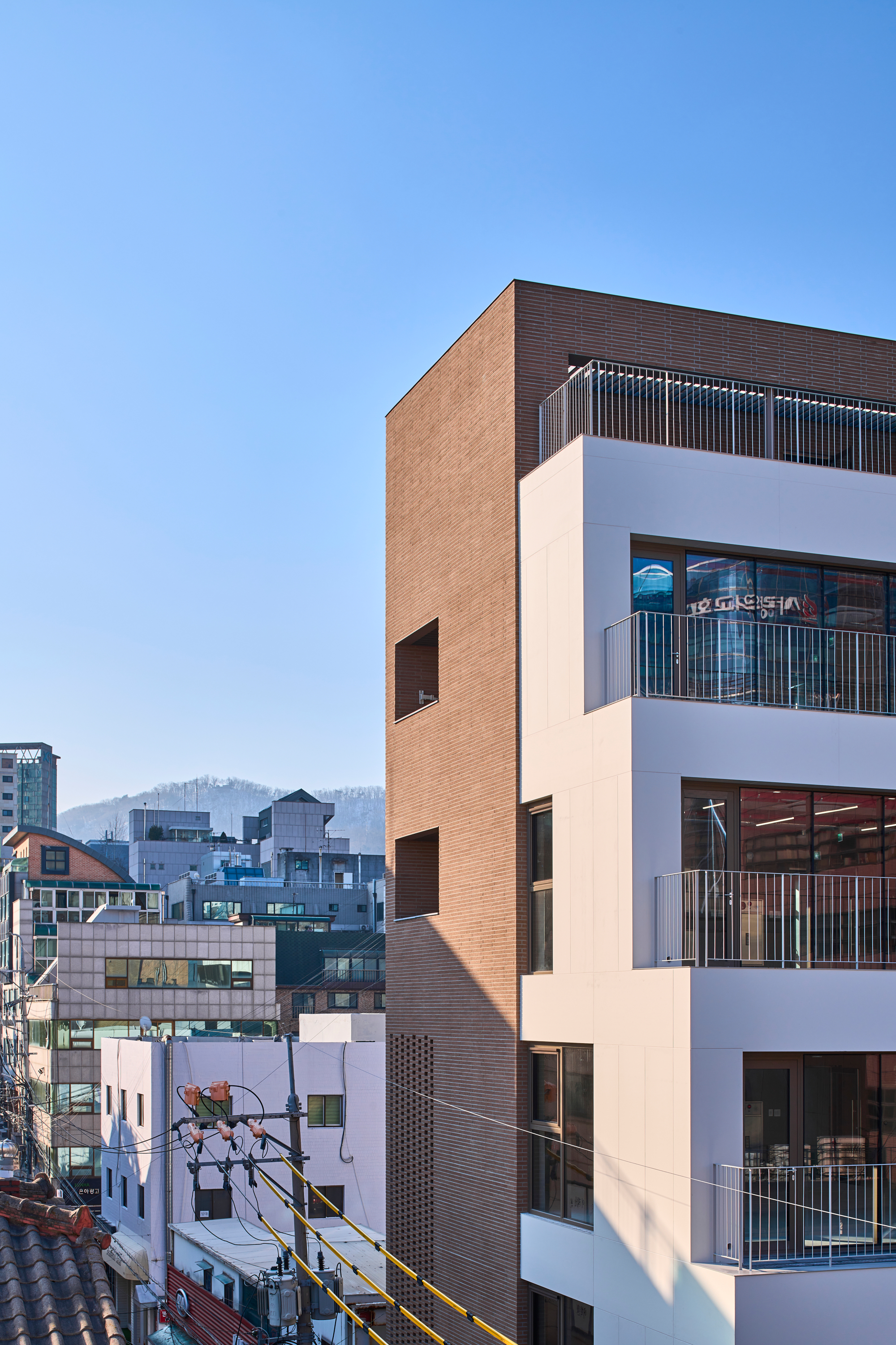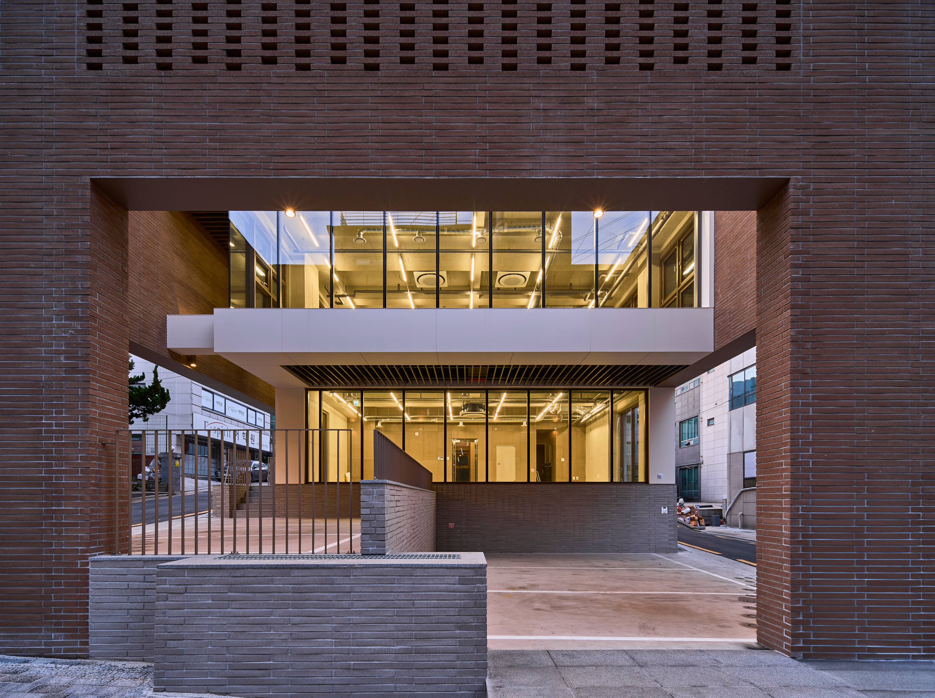 저층부와 코어를 둘러싼 벽돌 외벽은 외부의 번잡한 환경을 한번 걸러주며 1층과 2층의 상업 공간에 독특한 분위기를 조성한다. 묵직하고 견고한 외벽은 건물의 내외부를 명확히 구분하고 동시에 건물의 볼륨감을 강조한다. 주차장과 도로 사이에 별다른 펜스 없이도 자연스러운 경계를 형성한다. 벽돌 외벽은 강인한 이미지와 안정감을 주고, 도시적 맥락 속에서 건물의 존재감을 부각한다. 이와 대조적으로 밝고 부드러운 세라믹 박판 패널과 개방감 있는 유리는 조화롭고 섬세한 느낌을 준다. 지하층과 지상 1층, 2층은 상업시설로 활용되며, 공간 건축물에 효율성과 접근성을 높이기 위해 설계된 공간이다. 저층부는 벽돌의 외벽이 대지 안과 밖을 구분하는 것과 동시에 진입로의 역할을 한다. 진입로의 외부 조명은 저층부 상가의 활성화를 도모하고 방문객의 접근성을 높이는 용도다.