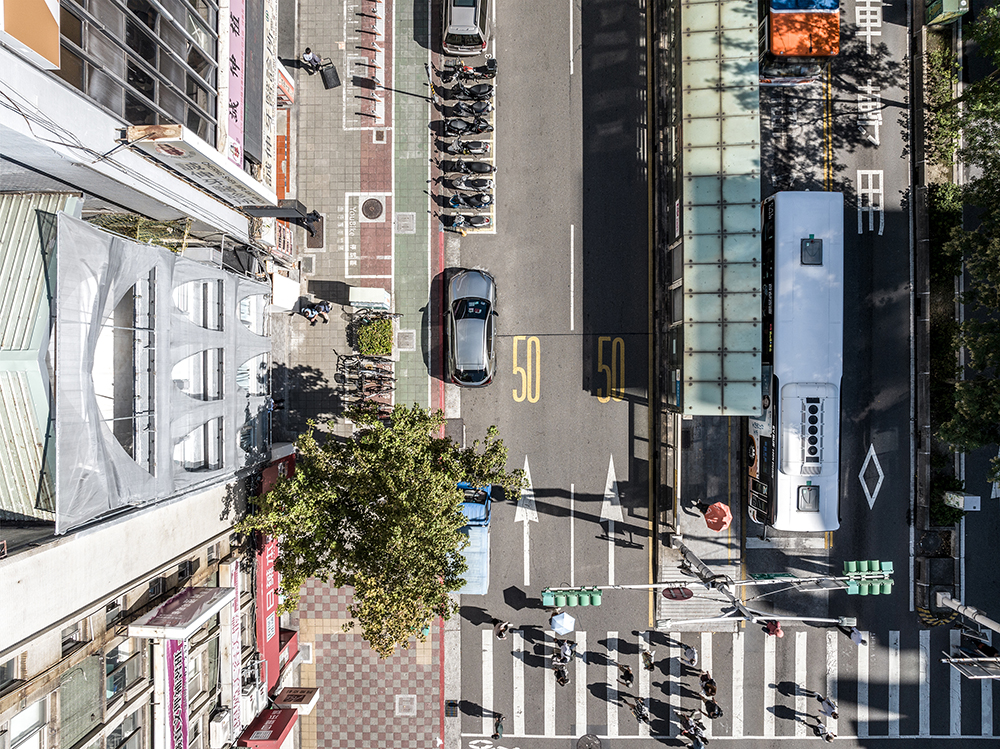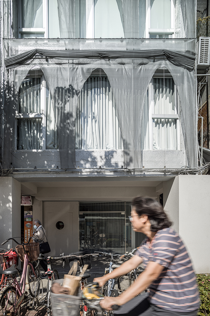 From the inside out: The exterior mesh resolves the privacy issue of large floor-to-ceiling windows. Standing in front of these windows, the mesh acts like a filter for the urban streetscape. Simultaneously, the freely controllable mesh can adjust the outdoor lighting, turning every wind, rain, and beam of light into a painting.