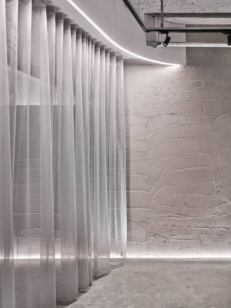 We use a thin, translucent material to gently separate the interior and exterior of the building, creating two viewing perspectives.