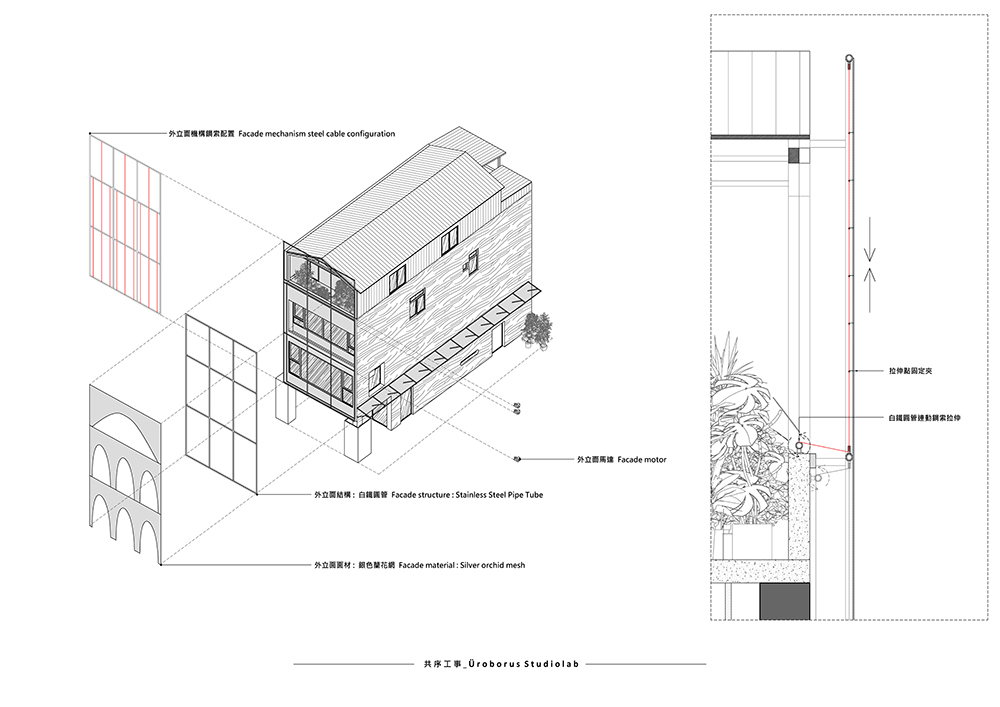 In discussions between the design team and the owner, the concept of a "training ground" was adopted to respond to the design idea of chefs and technology being "integrated." By deconstructing and re-integrating common materials used by the public, and incorporating contemporary design elements and the surrounding environmental conditions, we articulated a building design distinct from the surrounding noise. On the exterior facade of the building, we redesigned the commonly seen orchid dustproof net used in agriculture. This redesign allows for free dynamic opening and closing, creating a new building facade and urban expression. We aimed to strengthen Shennong's innovation in a non-intrusive manner, transforming the laboratory from just a laboratory into a space that can engage with its surroundings and create a new type of urban experimental architecture.