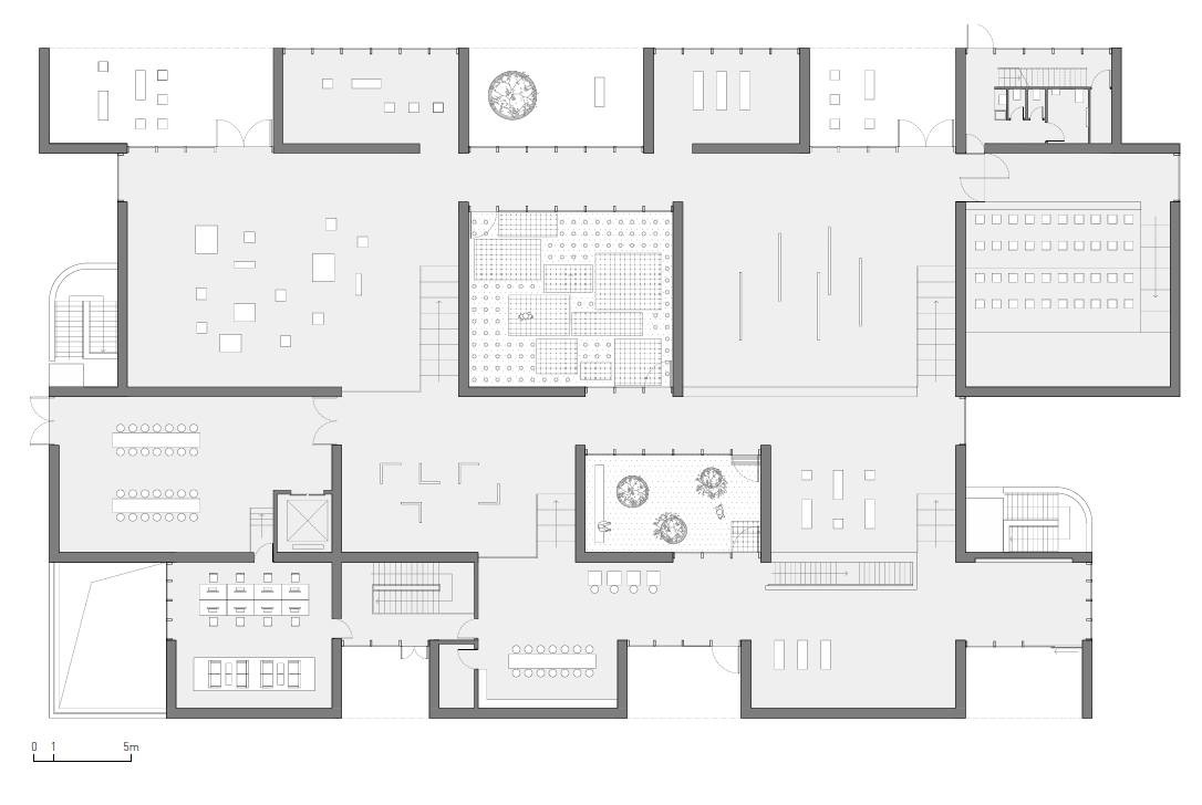 긴코 갤러리는 유동적인 공간을 지닌 평면 계획을 선보였다. 관람객들은 작은 마을을 탐험하는 것처럼 갤러리 내 다양한 구역을 자신이 원하는 방식으로 관람할 수 있다. 긴코 갤러리의 공간은 규모가 다른 정교한 공간 네트워크를 갖추고 있다. 방문객은 일반적인 미술관처럼 안내된 동선에 따라 감상할 수도 있고, 관람을 위한 동선을 직접 탐색하고 선택할 수도 있다. 박물관 홀은 큐레이터의 의도에 따라 전시관을 연결하거나 분리하며 다양한 방식으로 이야기를 전달할 수 있다.