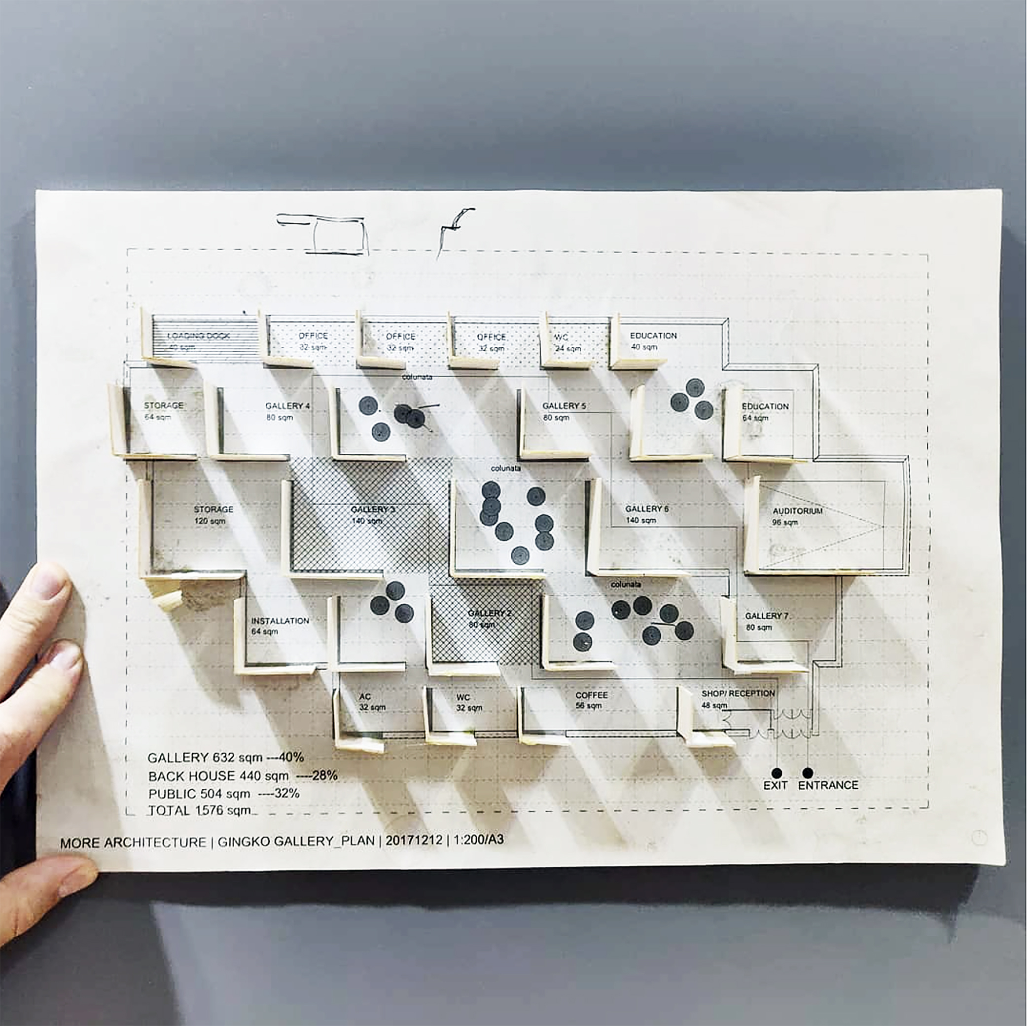긴코 갤러리는 유동적인 공간을 지닌 평면 계획을 선보였다. 관람객들은 작은 마을을 탐험하는 것처럼 갤러리 내 다양한 구역을 자신이 원하는 방식으로 관람할 수 있다. 긴코 갤러리의 공간은 규모가 다른 정교한 공간 네트워크를 갖추고 있다. 방문객은 일반적인 미술관처럼 안내된 동선에 따라 감상할 수도 있고, 관람을 위한 동선을 직접 탐색하고 선택할 수도 있다. 박물관 홀은 큐레이터의 의도에 따라 전시관을 연결하거나 분리하며 다양한 방식으로 이야기를 전달할 수 있다.