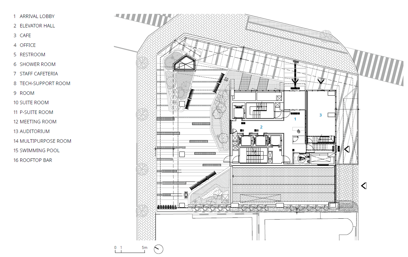 건축가는 이러한 문제점을 해결하고 보완하기 위해 기존 설계자와의 공동 작업을 진행했다. 비즈니스호텔의 사업성을 고려하여 객실 수를 최대한 확보했고, 부대시설은 필요한 프로그램을 제외하고 최소화했다. 주변 환경을 고려하여 로비는 최상층으로, 수영장은 조망이 좋은 방향으로 위치를 변경하며 루프탑 바를 추가하여 특색 있는 편의시설을 확보했다. 객실은 기둥이 포함되지 않도록 위치를 조정했다. 기준층을 3.6m에서 3.3m로 변경하고 부대시설의 층고도 시설의 기능에 따라 조정하며, 자연스럽게 구조체와 외벽 마감재를 줄일 수 있었고 전체적인 공사비를 절감하게 되었다.