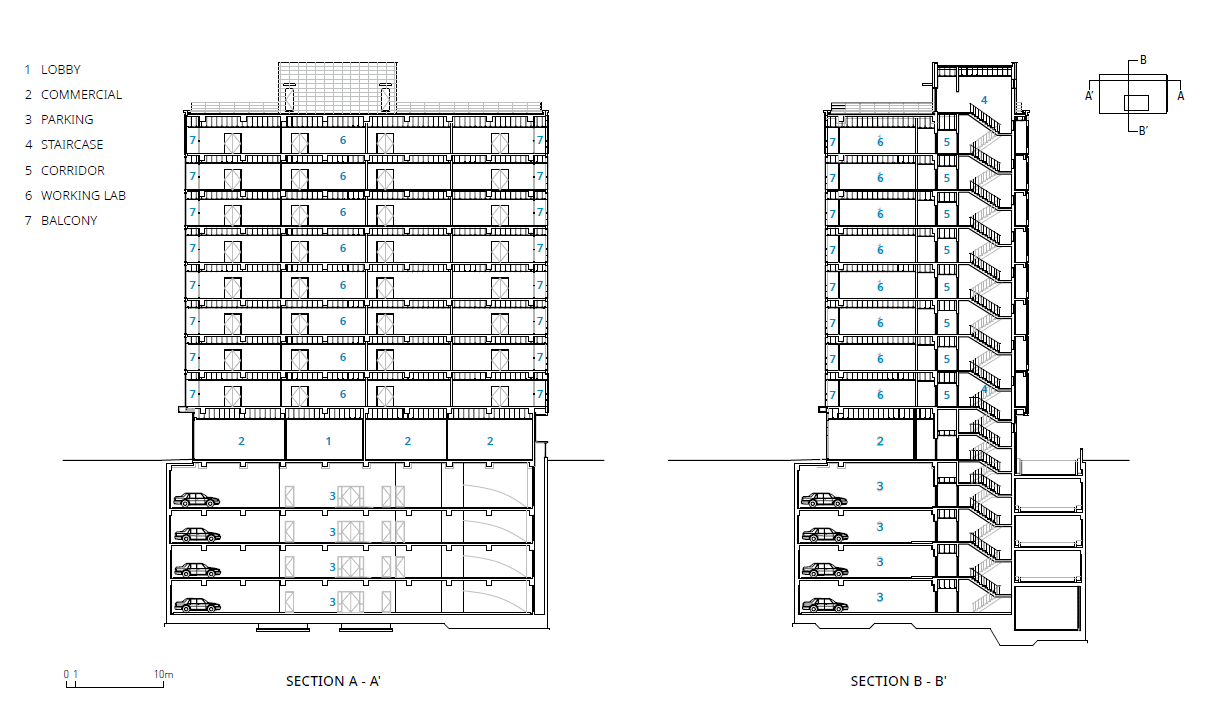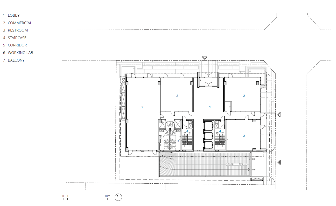 대지에 접한 두 개의 도로에서 다방향의 정면성을 확보하면서, 업무형 지식산업센터에 적합한 코어 계획을 수립했다. 장변 방향인 성수이로에 면한 보행자 주출입구와 연무장길에 계획한 주차장 출입구는 남측에 면한 사무실의 시야를 고려한 것이며 남측에 코어와 화장실을 계획하여 실내에서도 개방성을 확보했다. 또한 북측과 서측에는 외부로 열린 사무실을 배치했다. 지상 1층에는 로비와 근린생활시설, 지상 2층부터 지상 9층까지는 업무형 지식산업센터를 계획하여 임대계획에 따라 각각 1개에서 6개 실로 구별 사용이 가능한 가변성을 고려했다.