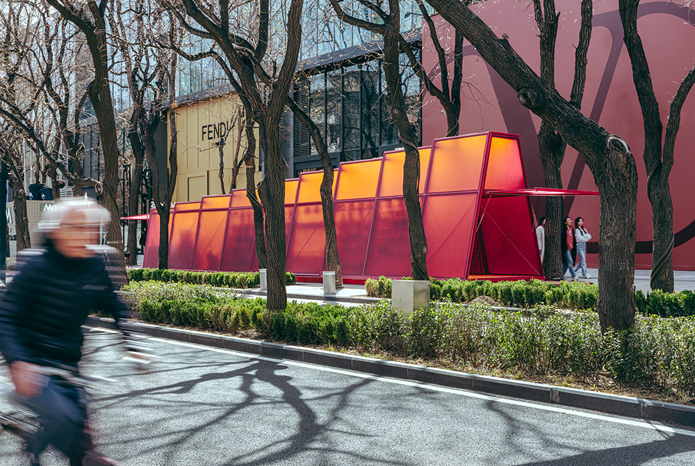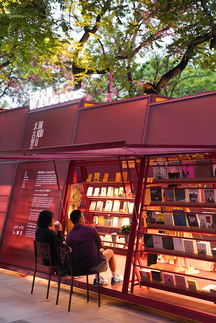 Nestled between two rows of locust trees in the Taikoo district of Sanlitun, Day and Night Park resemble a train car segment. This linear space forms a sandwich structure with street views on one side and commercial surroundings on the other.