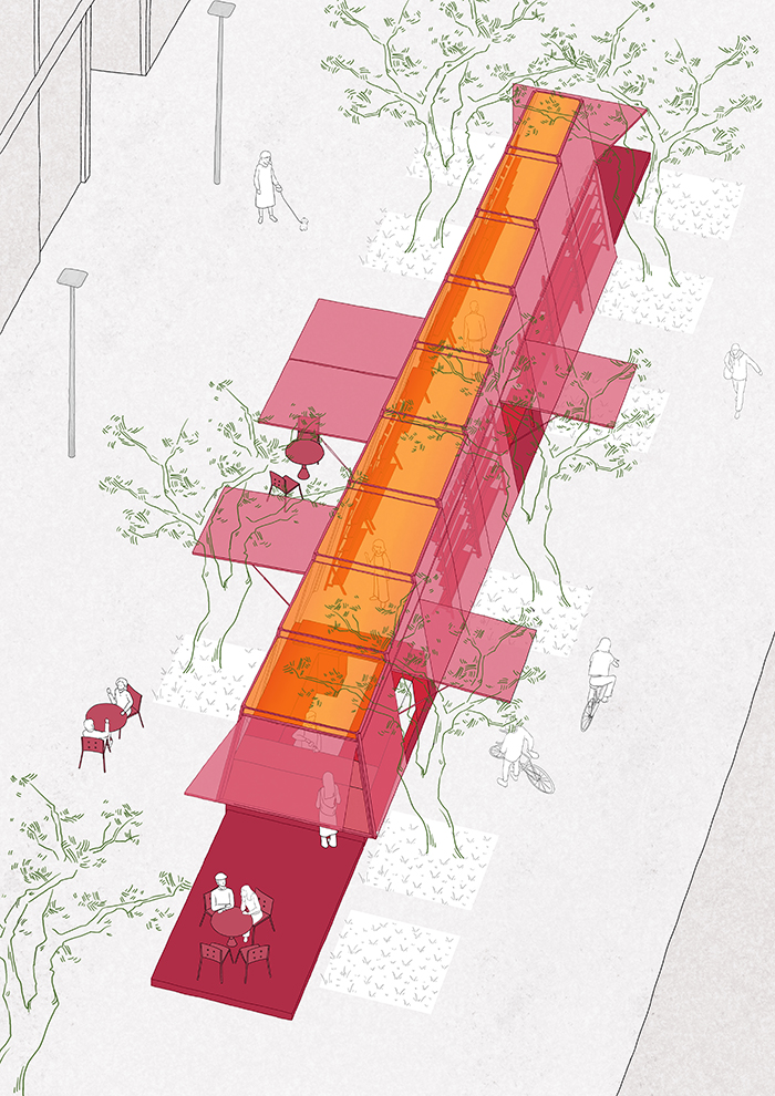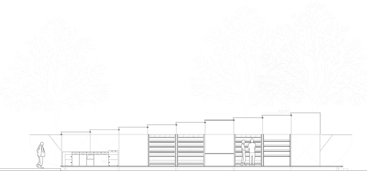 The newsstand measures 20.6 meters in length and 2.7 meters in width, inspired by the proportions of an airplane cabin. The ceiling height increases gradually from 2.15 meters to 3.4 meters, while the walls slightly rotate three degrees, creating a sense of spatial transformation. The highest point is open, inviting passersby, while the lower end extends into a public area for rest and relaxation.