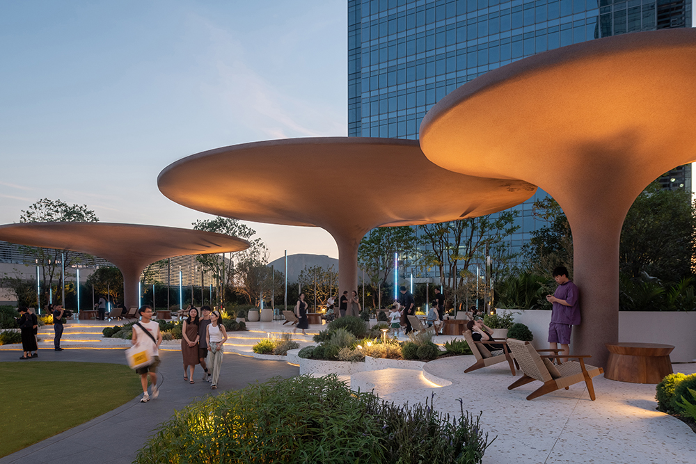 Focal pavilions in circular form rise from the ground and are materialized into giant lotus leaves, providing shelter and forming pockets of refuge. Rammed earth finishes of the pavilions create a sense of rustic surrealism.