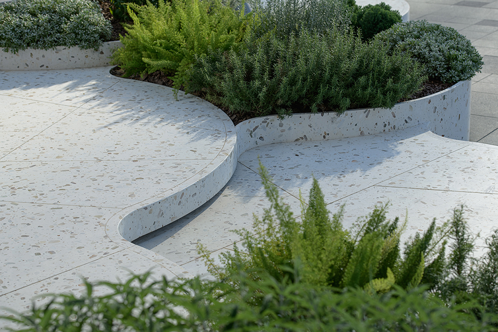 Due to structural constraints, trees must be planted in raised planters to meet soil depth requirements. The design team intentionally articulates compositions of rounded planters in different heights and sizes to optimize perception of scale from multiple angles. These clusters are an abstract depiction of lotus communities in the pond, creating three-dimensional visual interests with flourishing richness.