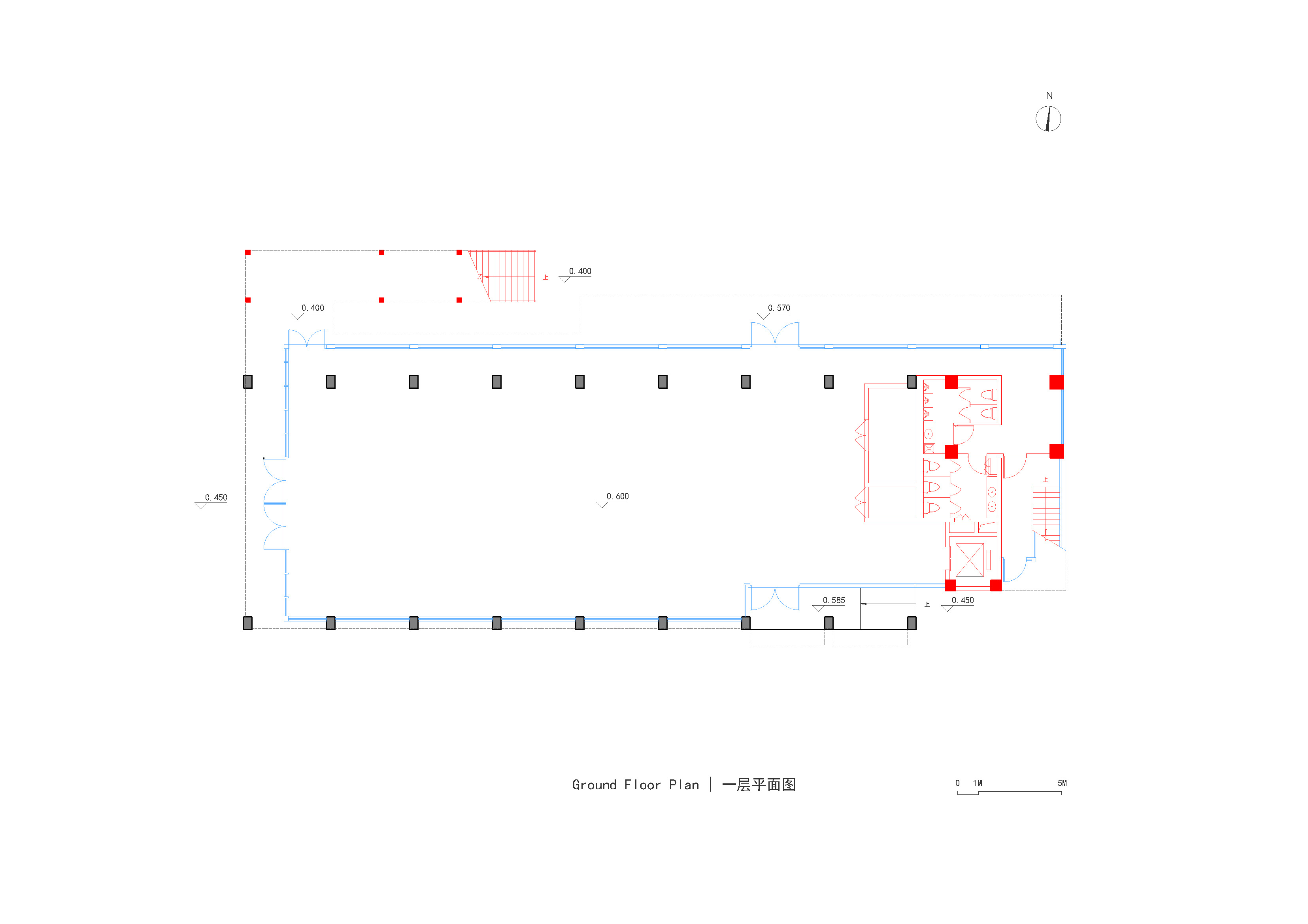 At the eastern end of the strip is a tall metal box, repurposed from the original power distribution room. It retains the oversized height and rough concrete beams of the industrial building. Corrugated galvanized steel panels rise towards the plaza, resembling an opened gift box.