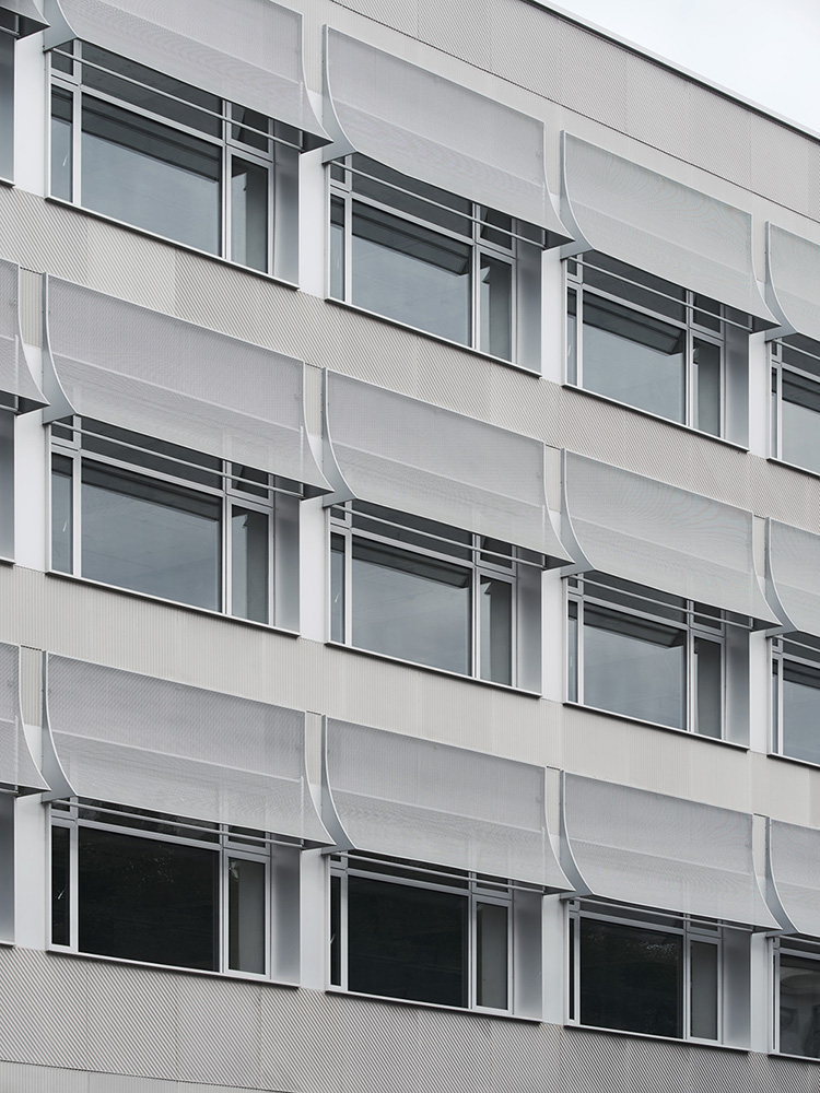 The two four-story workshops have been converted into office spaces. The one on the east emphasizes horizontality and plays with subtle texture. The façade uses grooved cement fiberboard, silver perforated long panel, and silver aluminum panels in varying orientations. The north façade features large glass windows overlooking the garden and solid aluminum windows concealing the columns. The rigid framework of industrial building is intentionally concealed behind the meticulously planned patchwork composition.