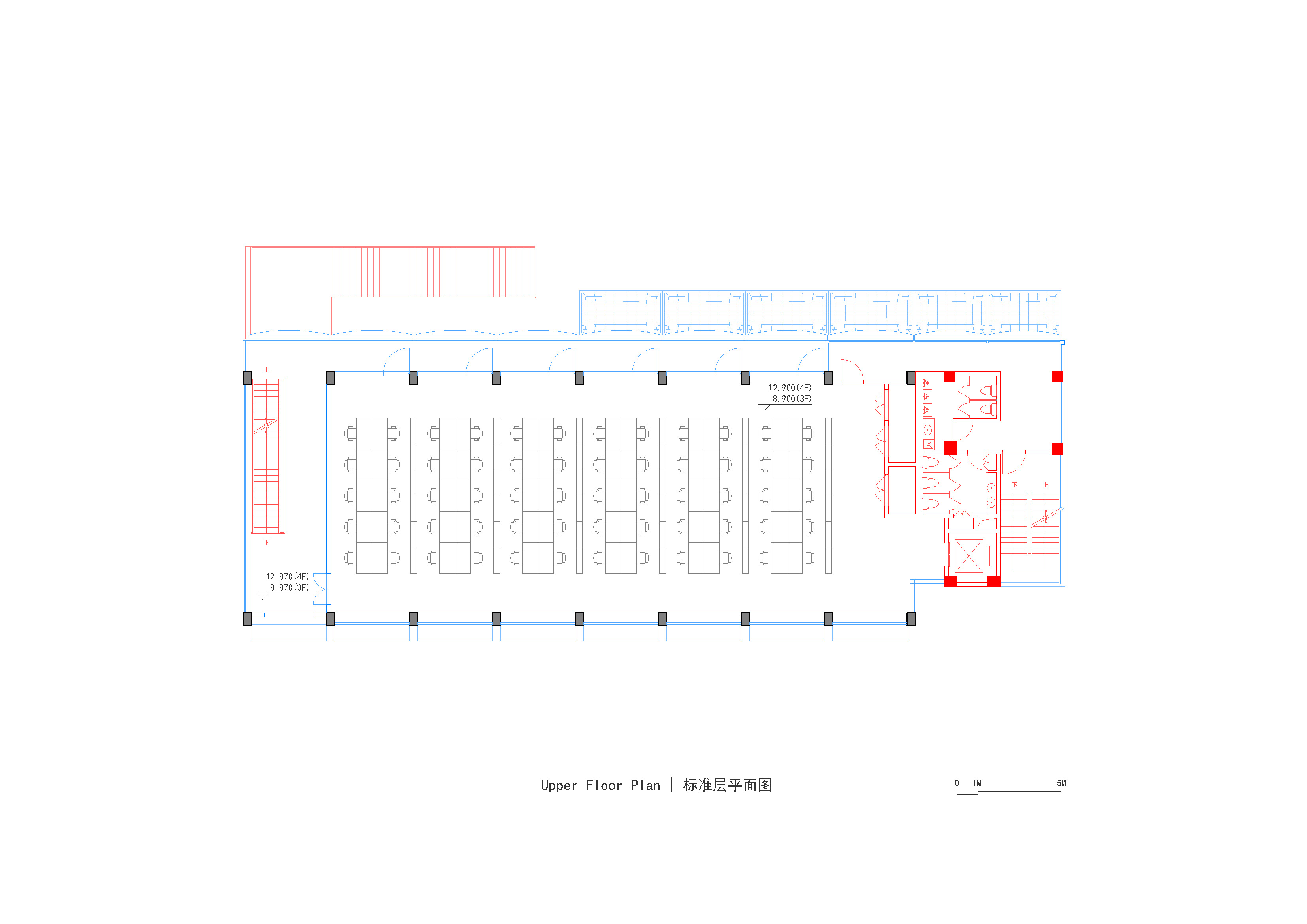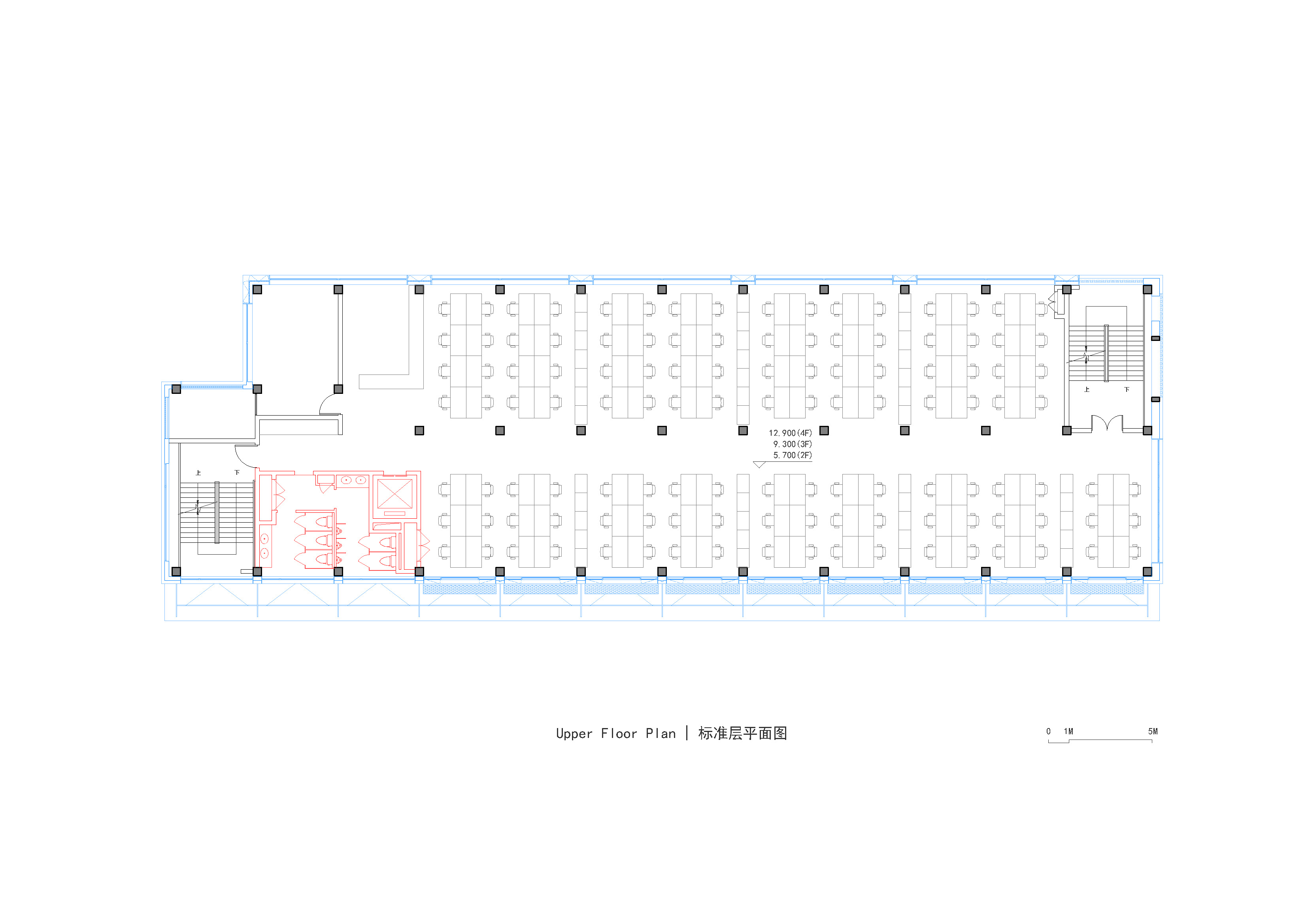The offices on the west retains more industrial characteristics of the original buildings. A steel staircase is inserted into the existing framework on the west facade to create a distinctive image facing the street. The steel staircase extends northwards, becoming a public circulation on the north touching the ground floor. The north façade and roof corridor use inflatable ETFE membrane as the rail and roof panels, to create a sci-fi atmosphere. The air cushions become lighting elements at night as a signature image facing the city.