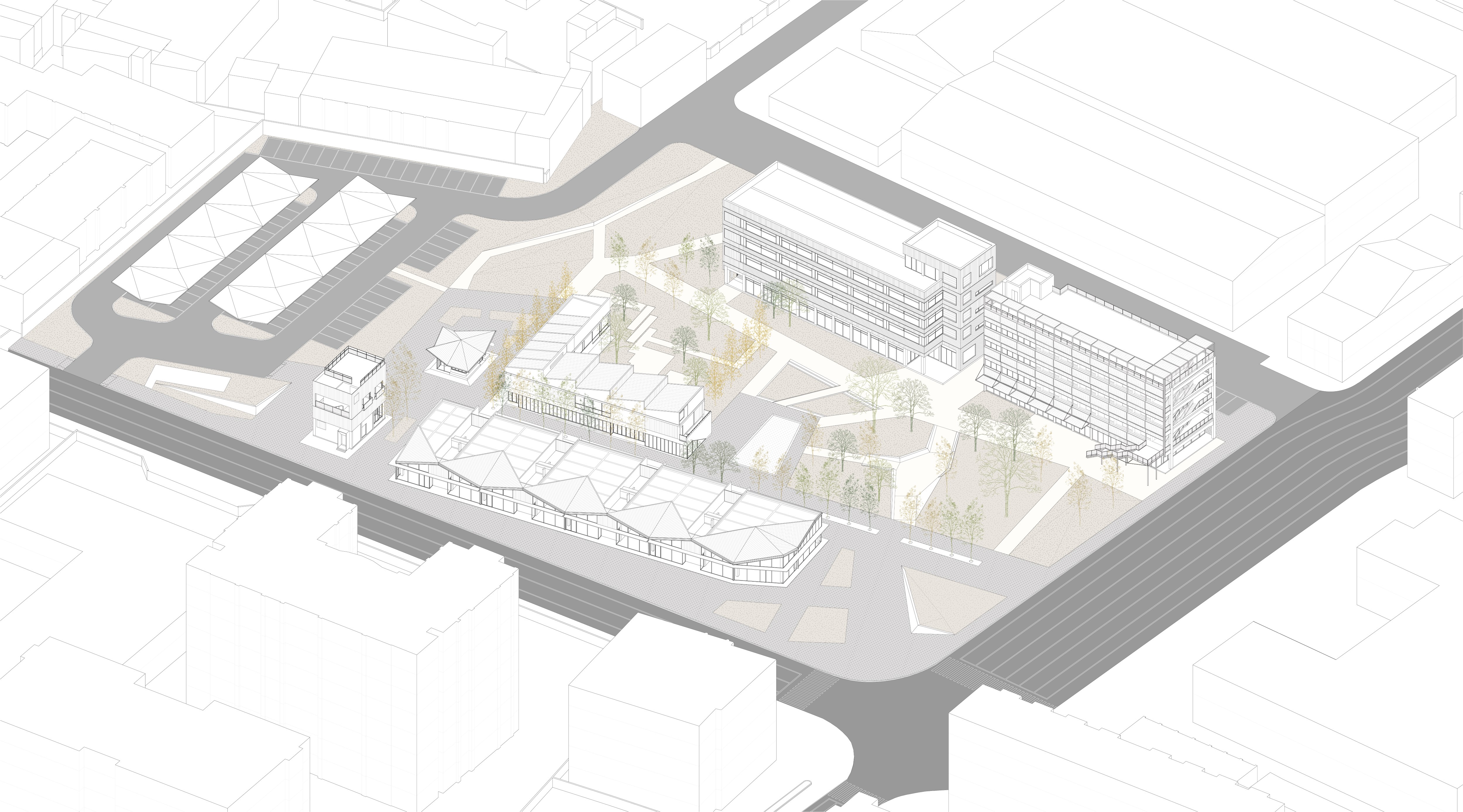 The long strip of single-story shops along the street uses undulating pitched roofs to maintained the former building height along the walkway. The volume transits to flat roofs on the side facing the inner pedestrian street. The façade features silver perforated panels and expanded mesh.
