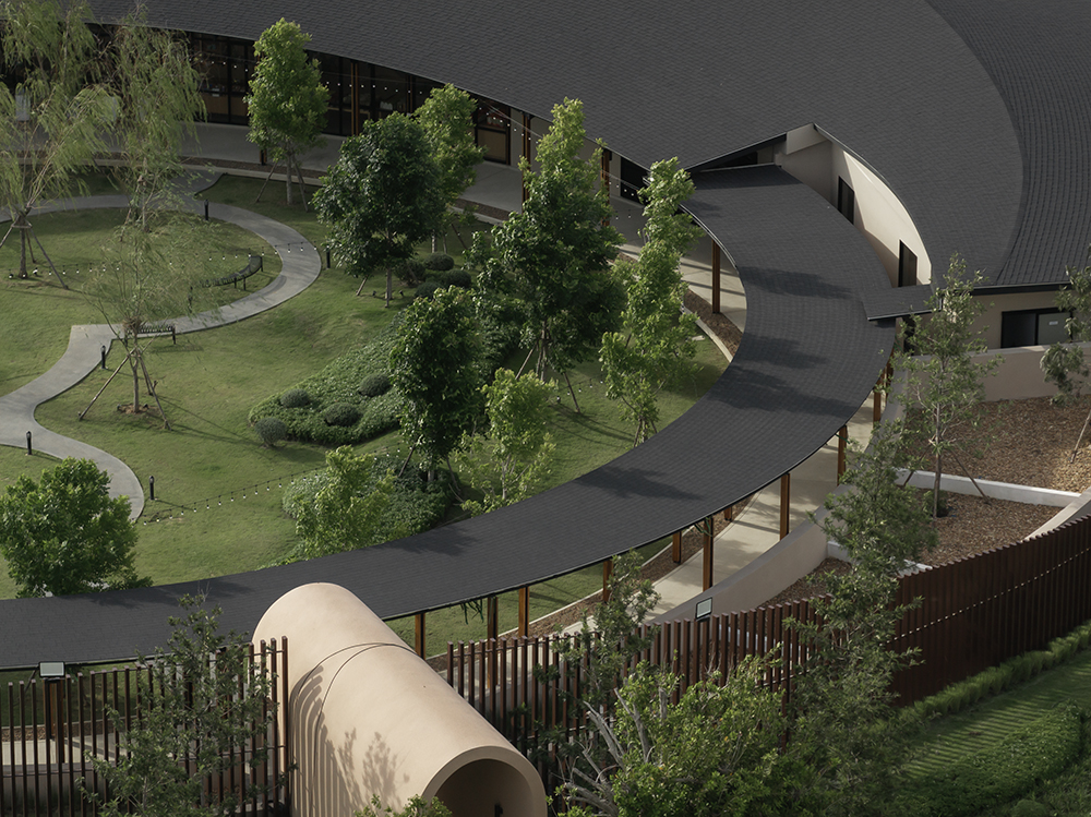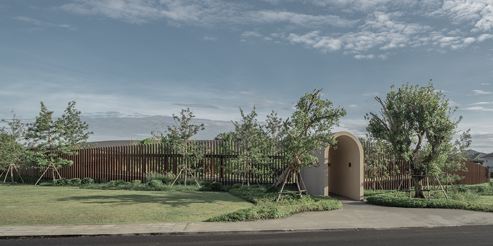 The design concept of Kaew Boutique is based on the surrounding natural environment, which is characterized by rows of typical boxy residences backdropped by scenic mountain ranges which stretch into the distance. The building has a divided courtyard space, similar to the structure of an egg yolk, to create a common area for shared activities where people can interact. The designer has also considered the sun, wind, and rain direction and designed the shape of the roof same as a mountain to open up the view of the mountain. The designer chose to use materials that blend with the surrounding natural environment, built a raised mound, and also used various types of plants to make the building look more approachable and friendly.