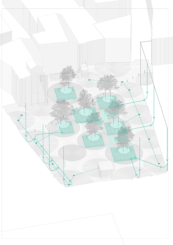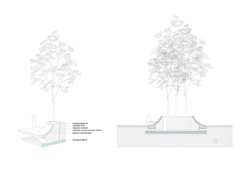 코르테베키아 광장은 기후 변화에 따른 도시 열섬 현상, 빗물 유출, 대기 오염을 완화하기 위해 플라타너스를 주요 식재로 선택했다. 플라타너스는 빠르게 성장하며 열과 가뭄을 견디는데 강하고, 높은 이산화탄소 흡수량과 오염 물질 정화 능력을 갖추고 있다. 광장 지하에는 설비, 고대 건축물의 기초, 고고학적 유물들이 존재한다. 이를 유지하기 위해 구조의 지면을 돌출되게 설계하여 유물을 보존하고 나무의 뿌리도 자랄 수 있도록 설계했다. 광장 지하에 도입한 빗물 저장 시스템은 거대한 스펀지처럼 빗물을 모아 저장하고 나무 뿌리에서 자연스럽게 활성화되는 모세관 작용을 통해 수분을 공급하는 방식으로, 별도의 에너지나 펌프가 필요 없다. 이를 통해 폭우 시 하수도 과부하를 방지하고, 가뭄 시에도