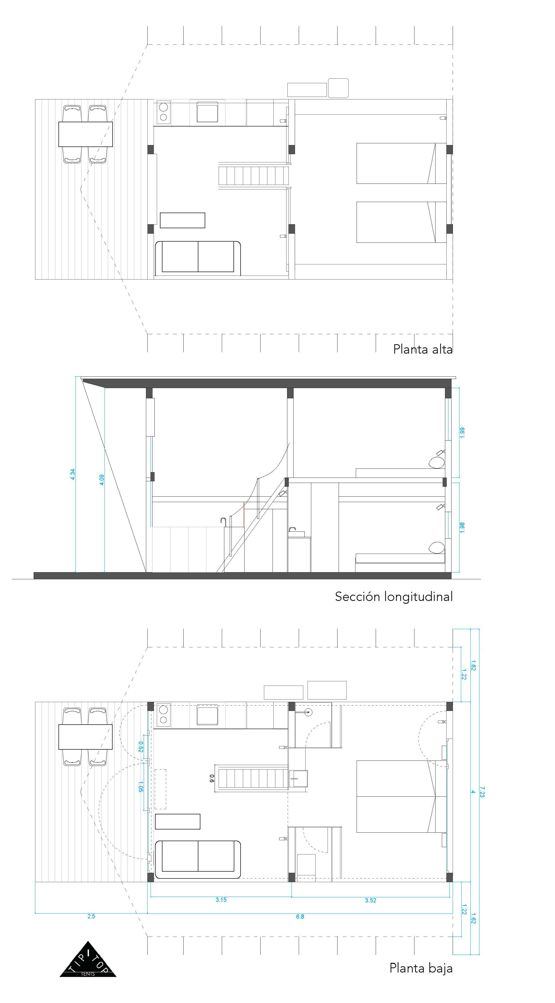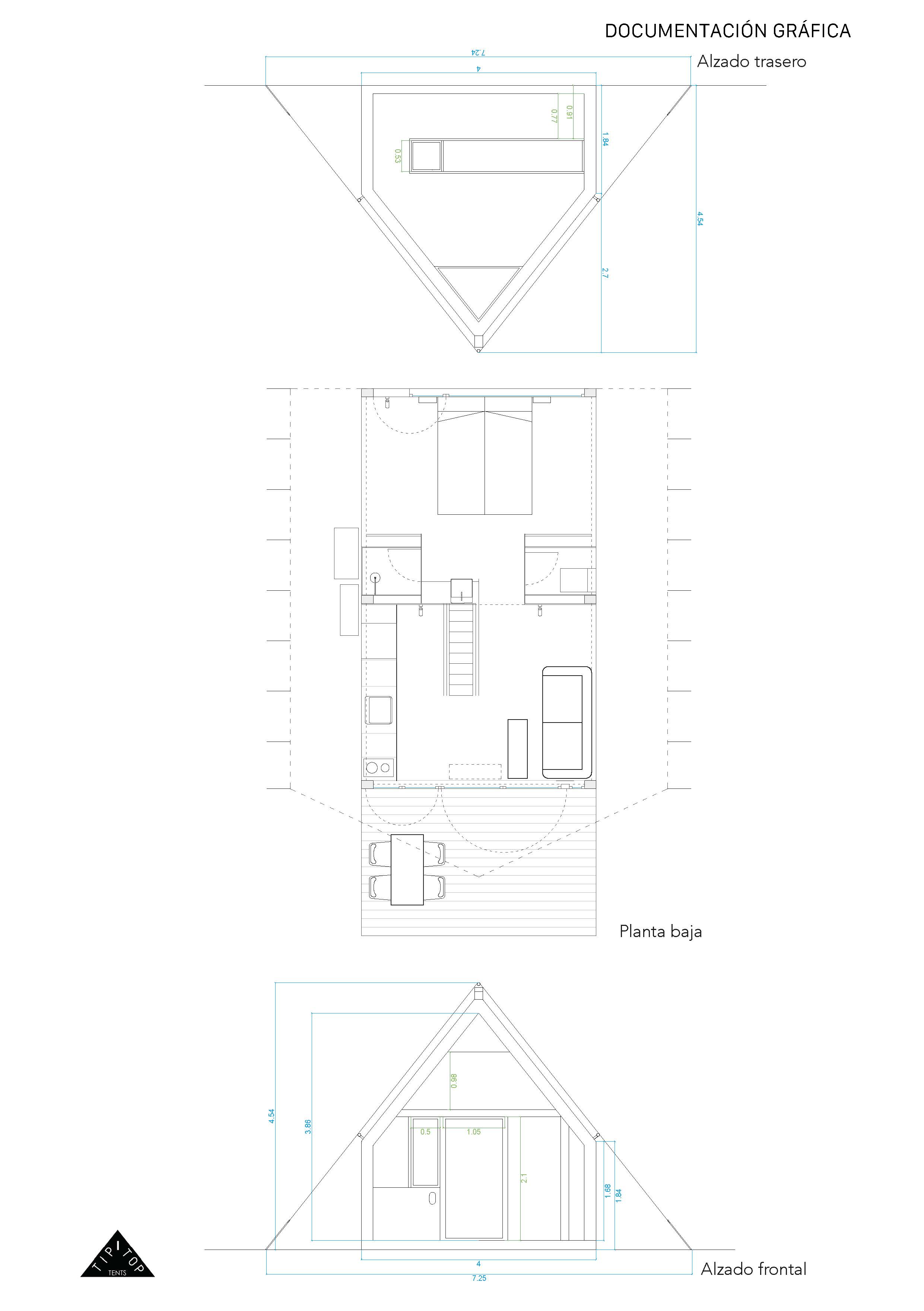 On the outside, the front and rear facades are made of sanded pine wood and glass. The side facades are closed with two separate tarpaulins between them. The inner one is made of cotton and breathable and the outer one of waterproof PVC. The combination of both and this separation, generates a climatic comfort thanks to the fact that this air cushion acts as insulation avoiding the greenhouse effect.