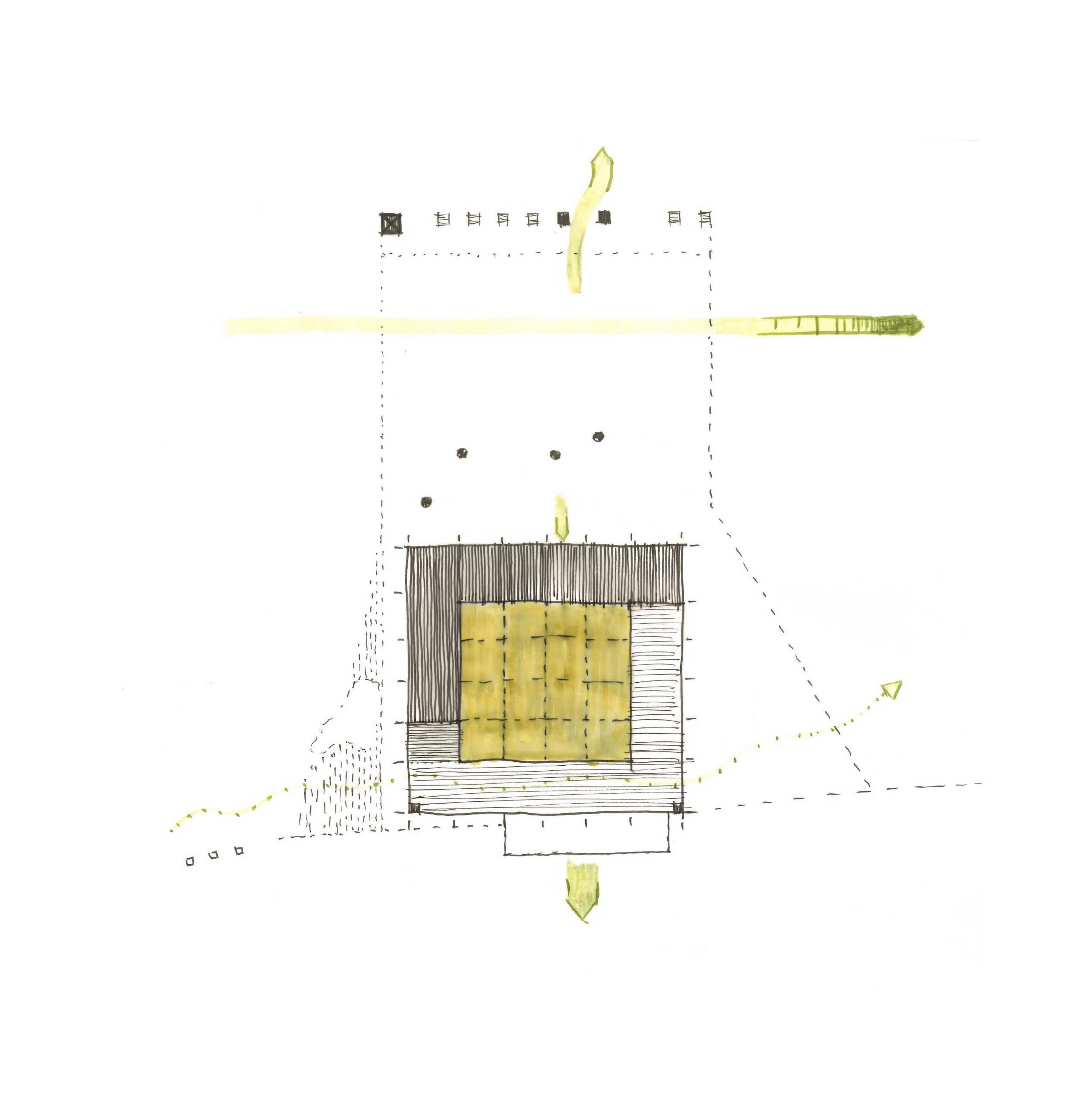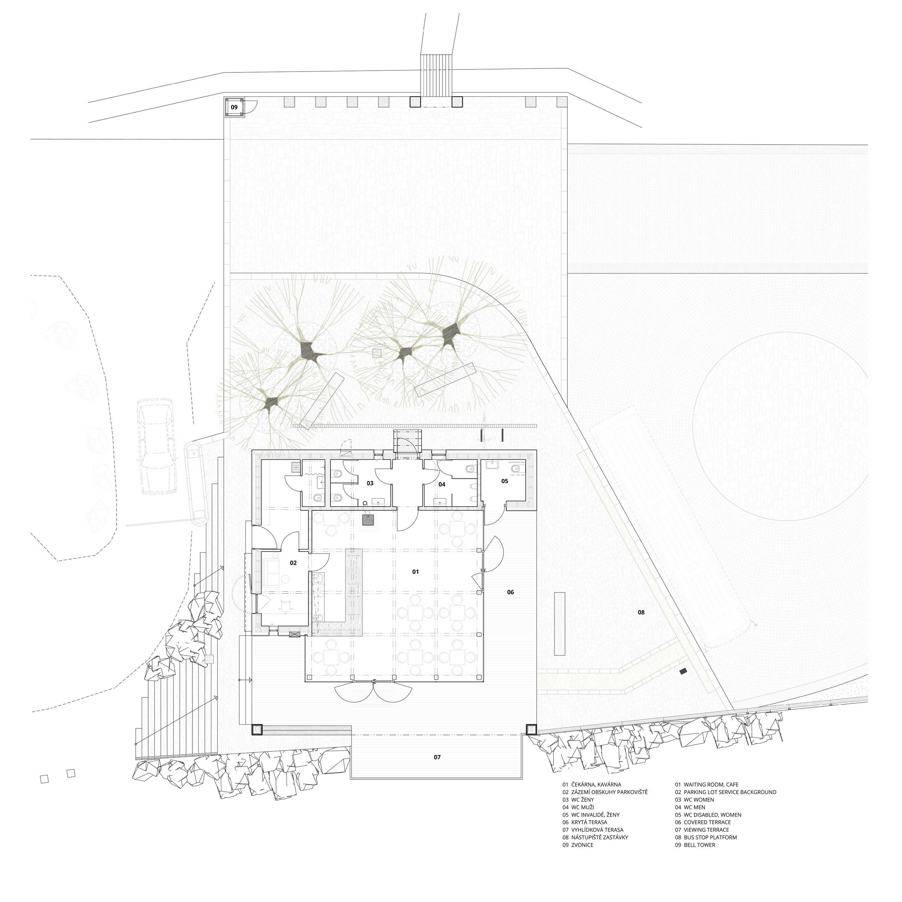 The proposed layout spreads across both sides of the access road to the saddle. On one side, the main building—"the house"— adjoins the parking lot and bus stop with a turnaround, serving as their facility and enrichment. On the other side, stands a new bell tower and the portal of a forest path connecting to the route leading to the Radhošť ridge. The bell tower symbolizes human presence in the landscape and embodies a spiritual dimension, summarizing the historical and contemporary relationship between people and this place. It also symbolizes the anchoring of the created place in the landscape. The paved area between the bell tower and the house offers seating under mature beeches. The entrance building integrates a small information center with a waiting room-café, facilities for parking lot staff, a bus stop shelter, toilets, and a terrace with a landscape view. It is situated on the edge of a slope, opening towards a view of Čertův mlýn (Devil’s Mill). The interior square central space of the waiting room and info-café is half bounded by a roofed terrace and half by the solid mass of the interior layout of auxiliary rooms. The bus turnaround adjoins the building, which automatically forms a shelter for the bus stop, allowing waiting inside during bad weather. The terrace with a viewpoint forms an interconnected whole with the interior, suitable for sitting in the summer months.