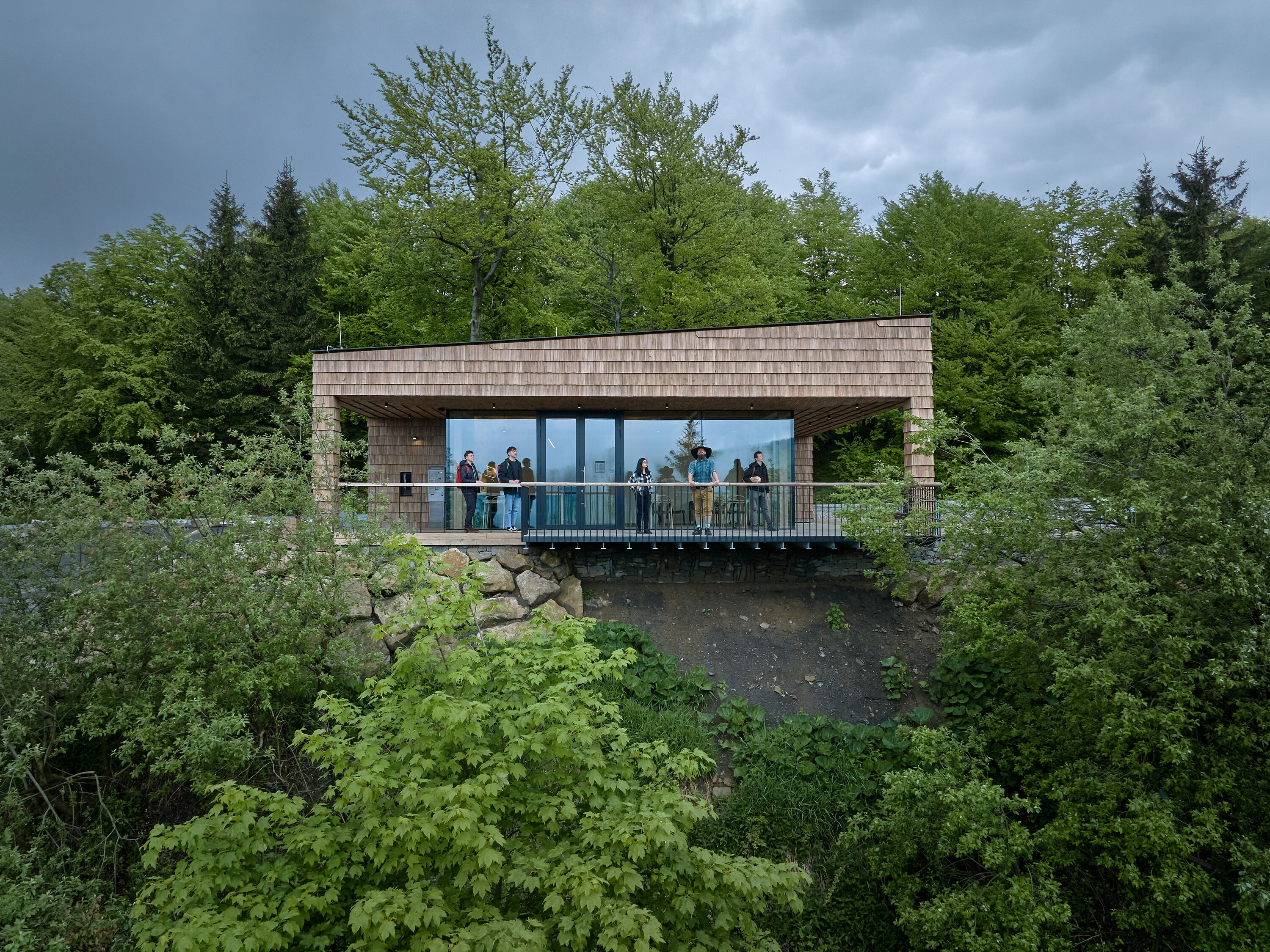 The project focuses on the entry point from Prostřední Bečva, where a large parking lot is situated along the access road. The parking lot includes an area on an embankment created during road construction. Previously, a small service building for parking lot staff stood here. Together with the cable car building on the northern side, this site is a significant entry point for Pustevny visitors.