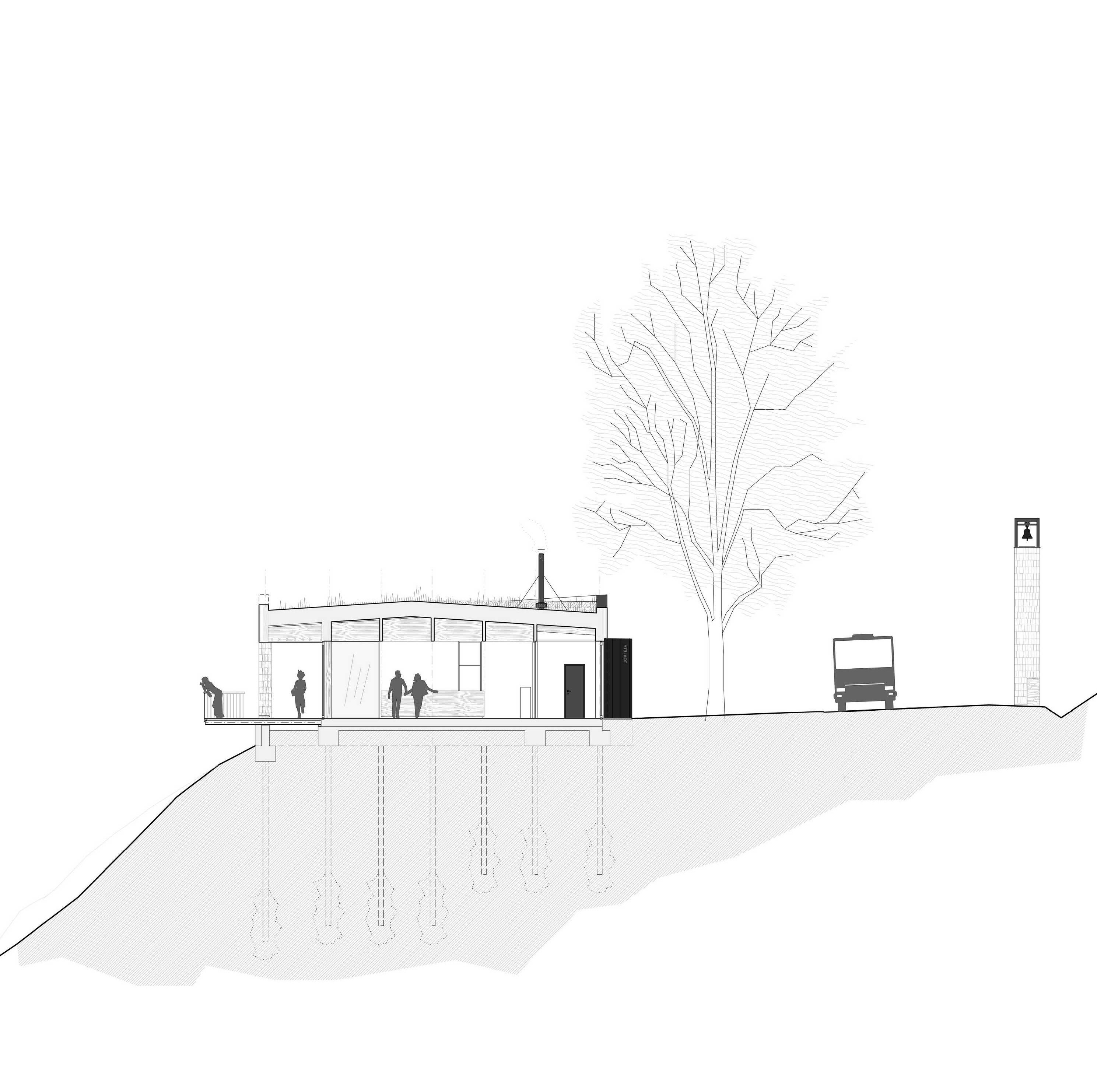 The proposed layout spreads across both sides of the access road to the saddle. On one side, the main building—"the house"— adjoins the parking lot and bus stop with a turnaround, serving as their facility and enrichment. On the other side, stands a new bell tower and the portal of a forest path connecting to the route leading to the Radhošť ridge. The bell tower symbolizes human presence in the landscape and embodies a spiritual dimension, summarizing the historical and contemporary relationship between people and this place. It also symbolizes the anchoring of the created place in the landscape. The paved area between the bell tower and the house offers seating under mature beeches. The entrance building integrates a small information center with a waiting room-café, facilities for parking lot staff, a bus stop shelter, toilets, and a terrace with a landscape view. It is situated on the edge of a slope, opening towards a view of Čertův mlýn (Devil’s Mill). The interior square central space of the waiting room and info-café is half bounded by a roofed terrace and half by the solid mass of the interior layout of auxiliary rooms. The bus turnaround adjoins the building, which automatically forms a shelter for the bus stop, allowing waiting inside during bad weather. The terrace with a viewpoint forms an interconnected whole with the interior, suitable for sitting in the summer months.