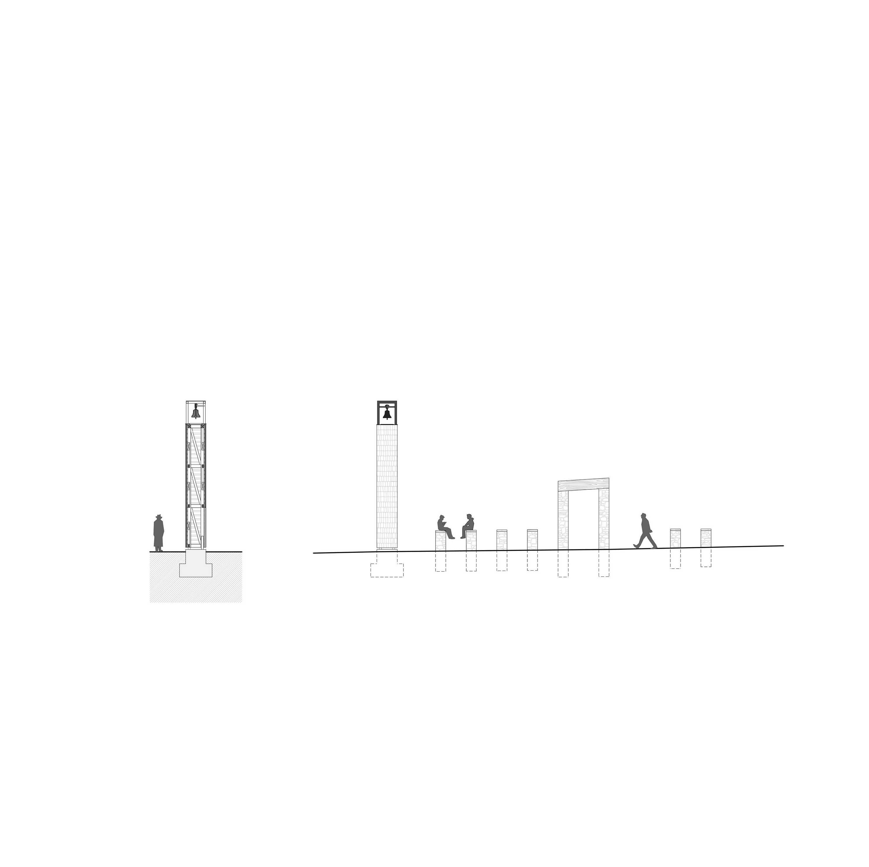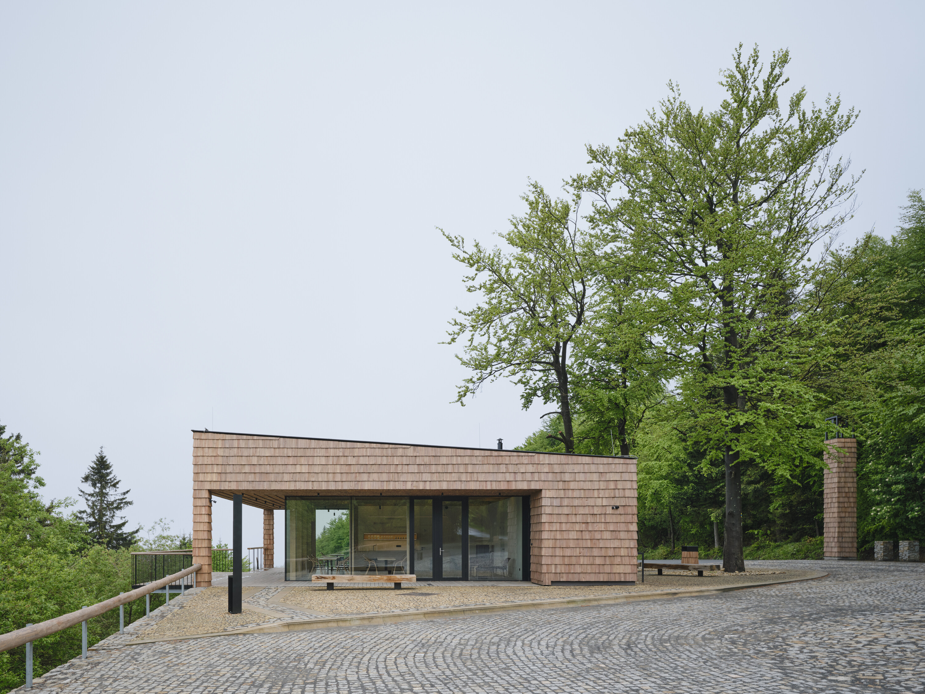 The proposed wooden building on one side, the vertical accent of the bell tower on the other side, the stone-paved carpet between them, and the existing mature beeches growing from the hardstand form a clear landscape point. This place marks an entrance to a significant site, as an imaginary gateway to Pustevny.
