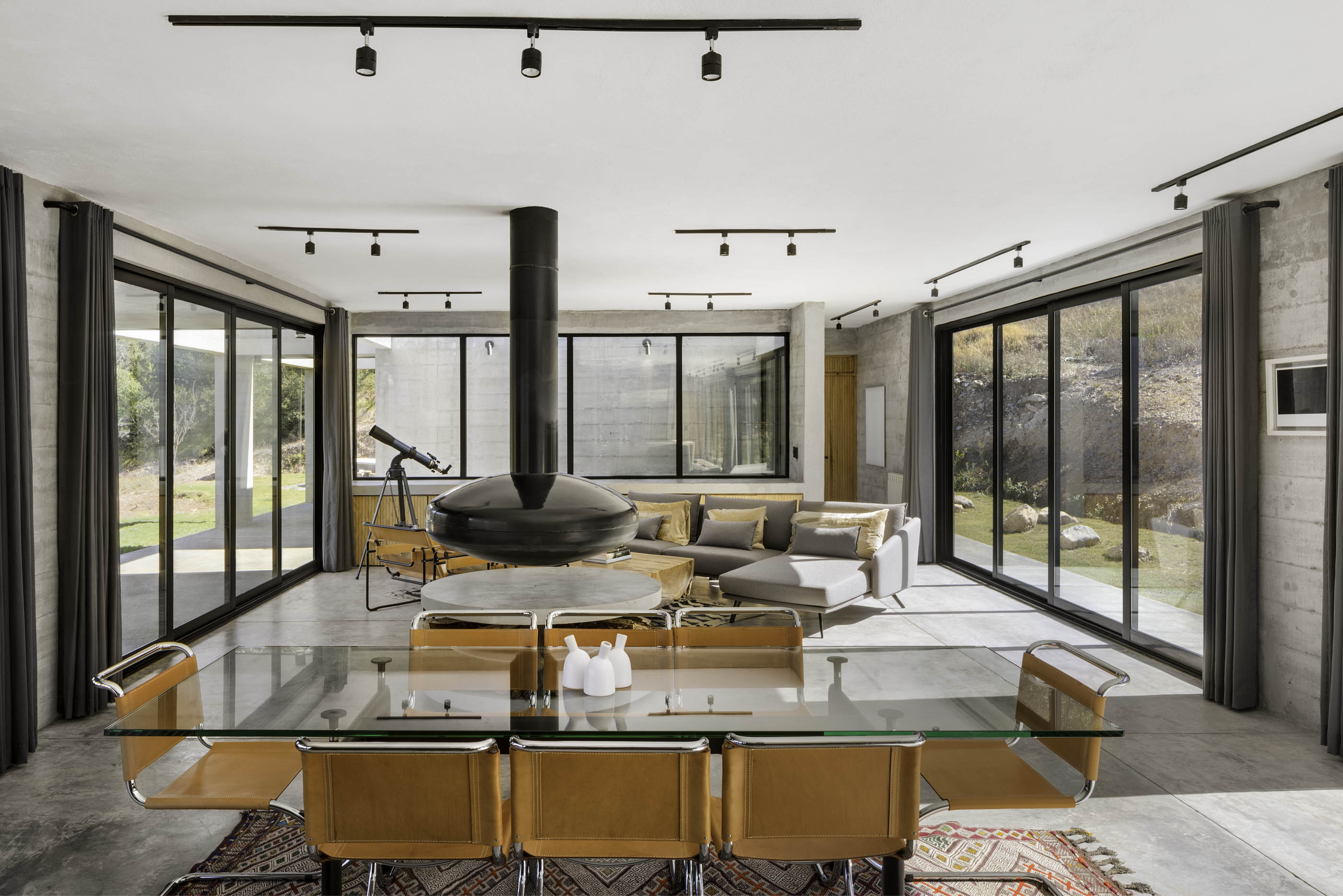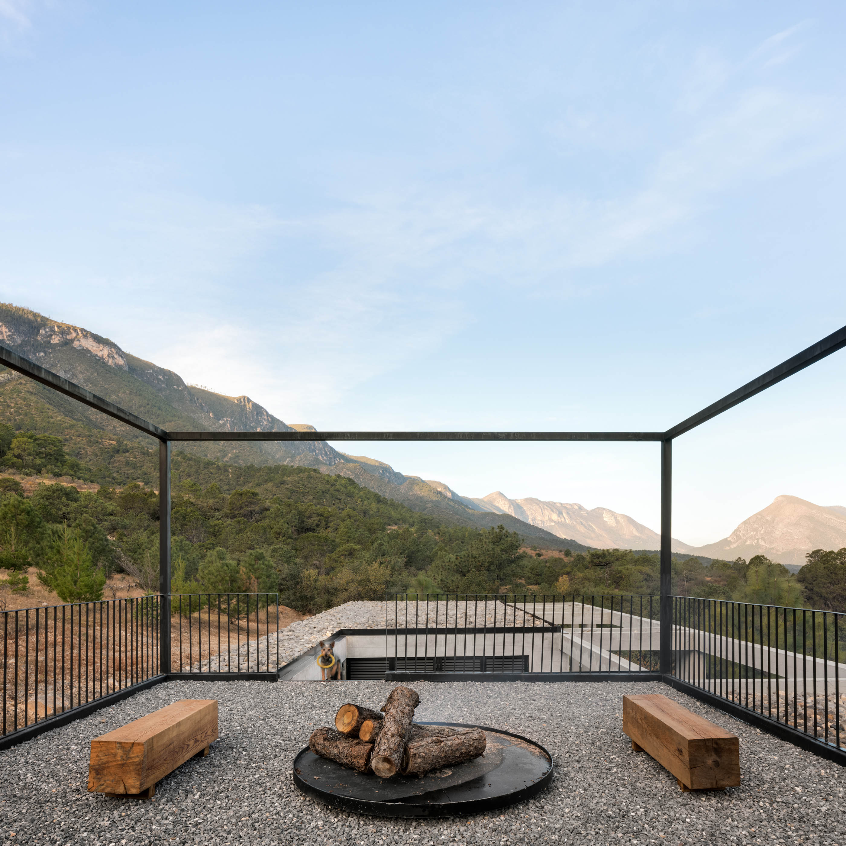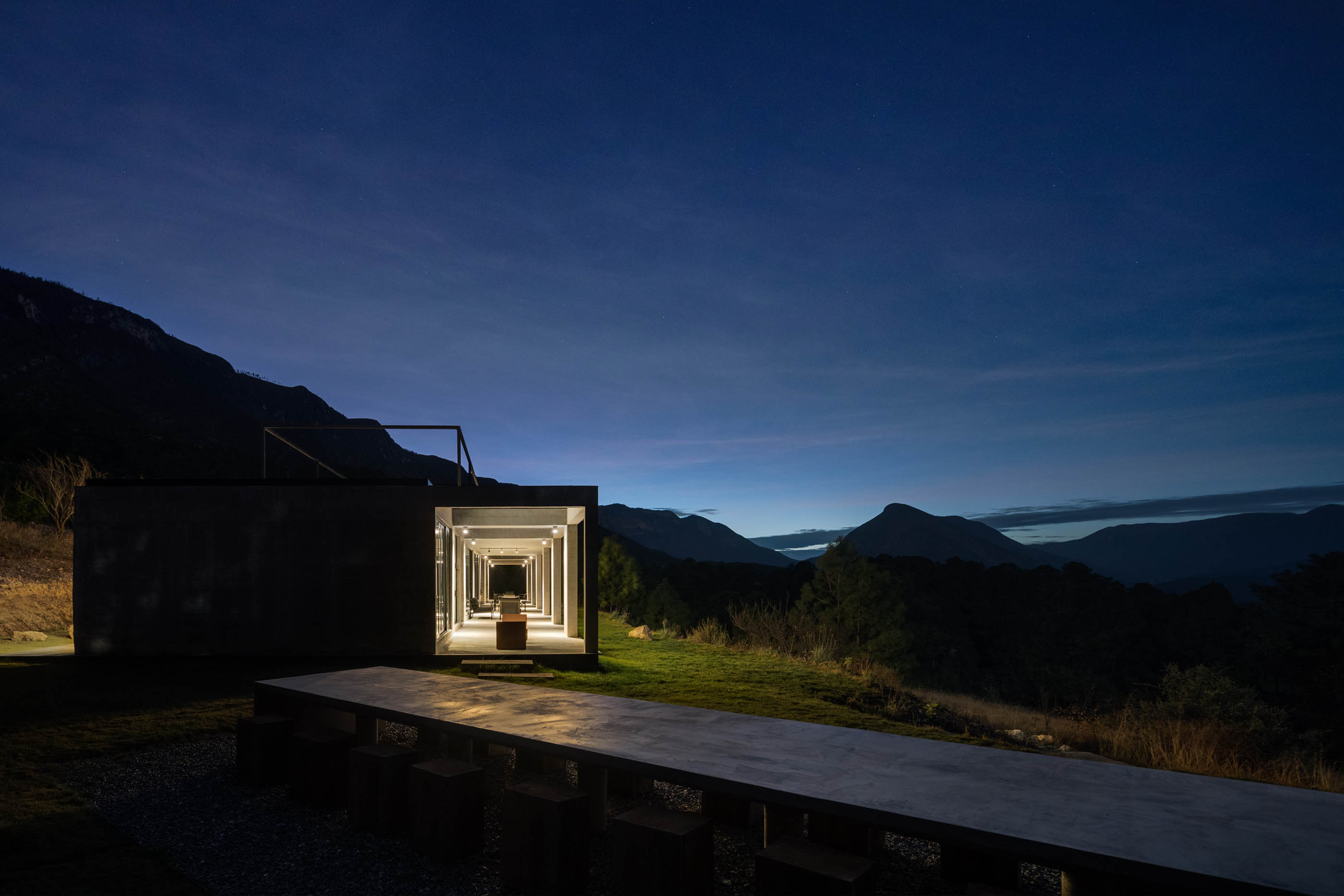 The volume is perforated with courtyards that break up the program and bring natural light inside. The largest of these contains a staircase leading up to the roof, where there are 360-degree views over the valley and the mountains. The construction comprises exposed concrete walls, pillars and beams poured with horizontal formwork, metalwork details, and large glass panels with aluminum frames. The site also contains a viewpoint and firepit that is independent of the house and an outdoor table seating up to 20, both constructed as concrete monoliths.