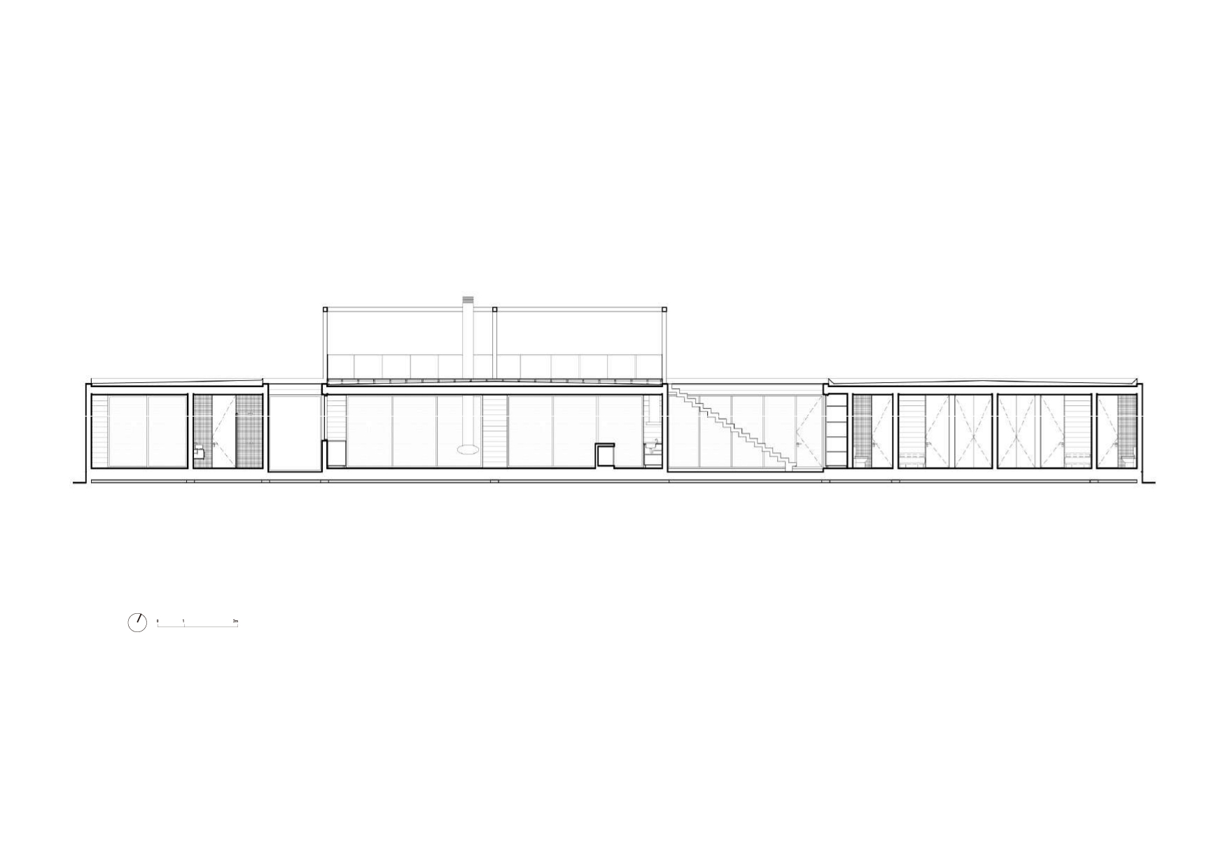 The house is divided into three parts: an elongated, 40 m × 10 m rectangle defining enclosed areas of shelter, the services at each end, and a central social area around the fireplace. All these areas are connected by a long terrace looking directly towards the mountains through a sequence of beams and pillars forming the external structure of the house while framing the natural landscape.