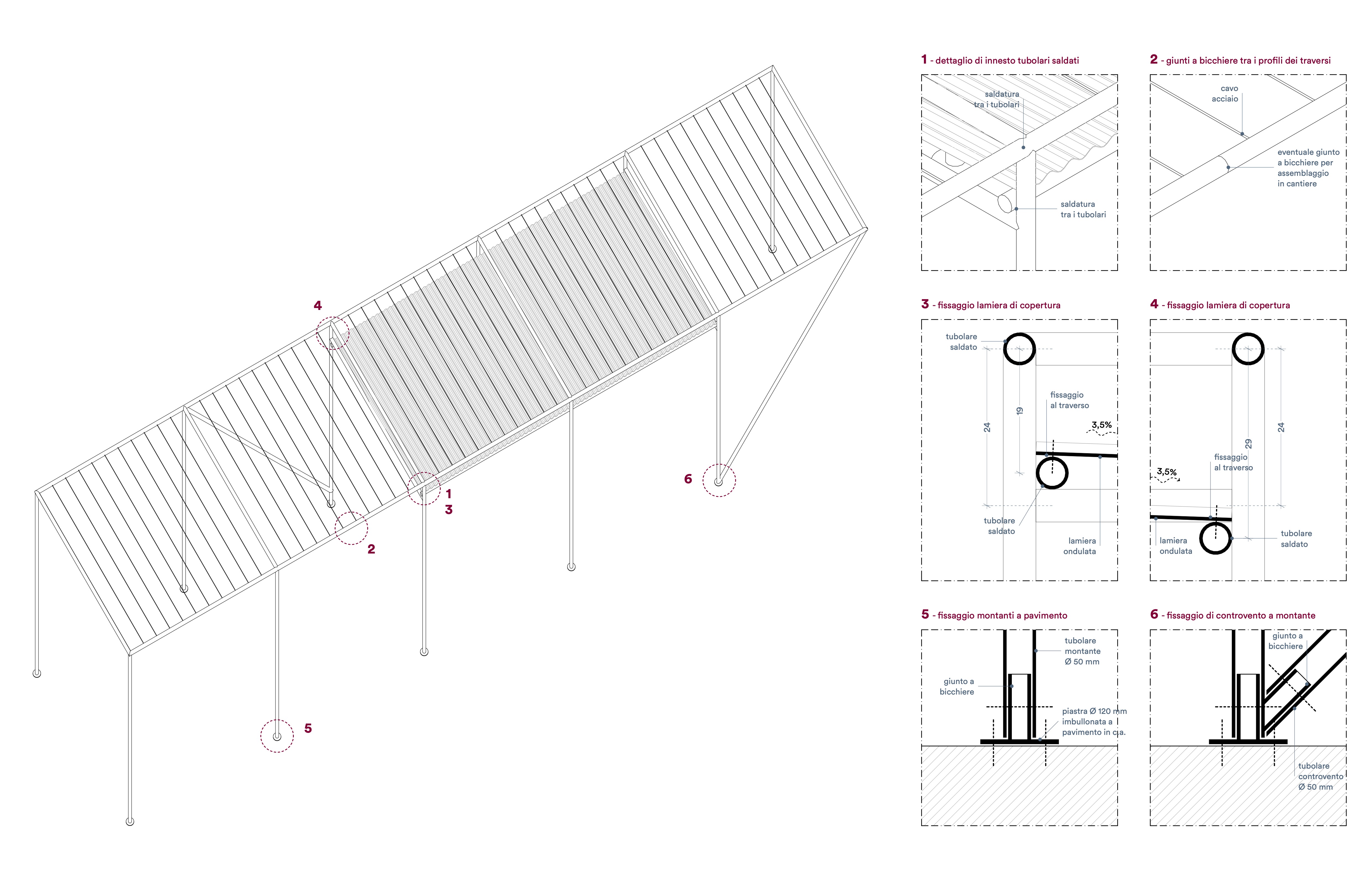 The pergola, located on the edge of the concrete plateau, perpendicular to the cabin, is built with tubular profiles in galvanized steel arranged in 5 spans with a regular pitch of 2.6 m. The first two spans can accommodate a lounge or dining area, while a custom-made long kitchen counter, made of stone and sheet metal, occupies other two spans and is protected by a roof made of light corrugated iron panels.