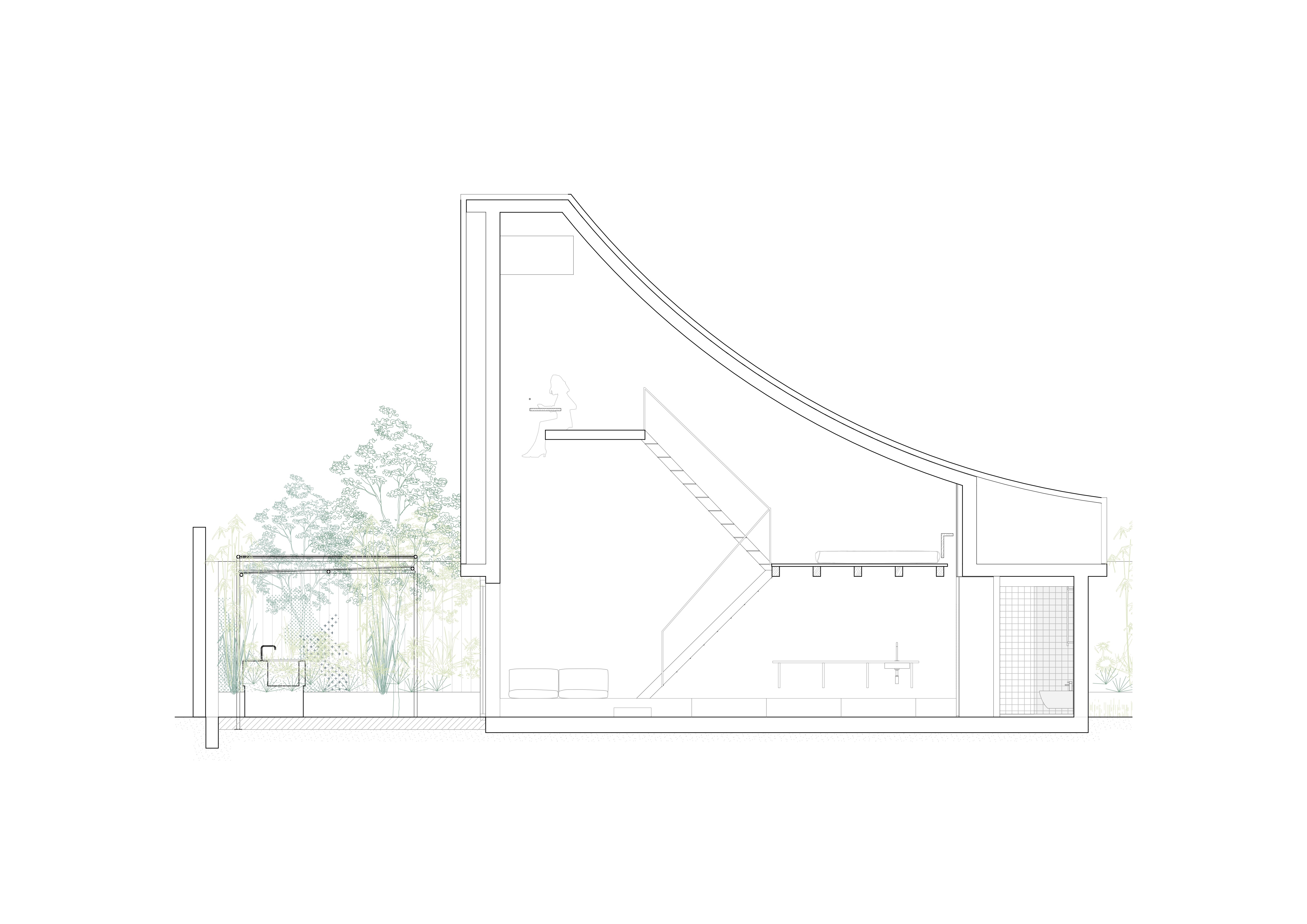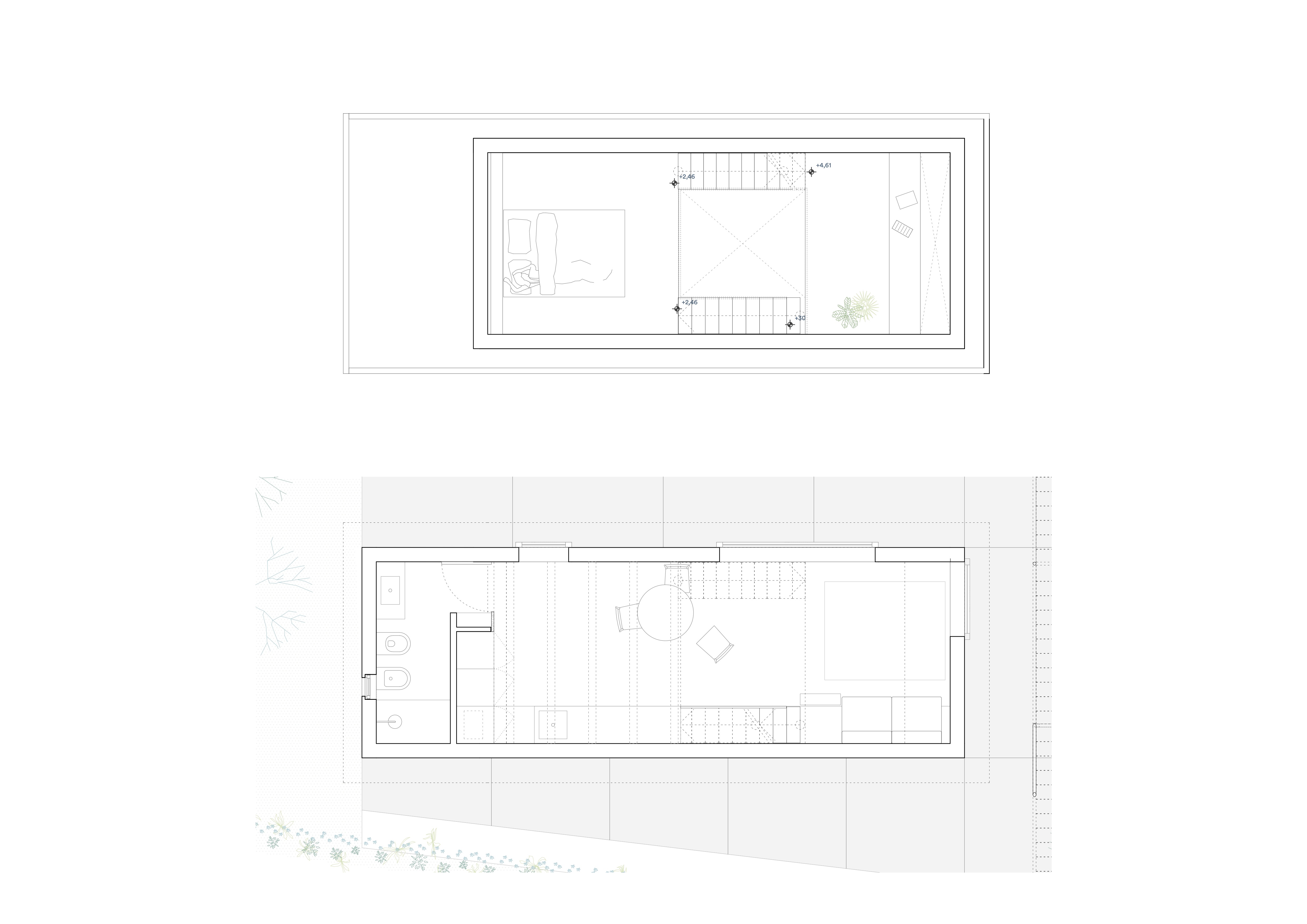 The renovation and reuse of the abandoned electrical cabin, given its unusual shape for an inhabited space, becomes an opportunity for spatial experimentation.