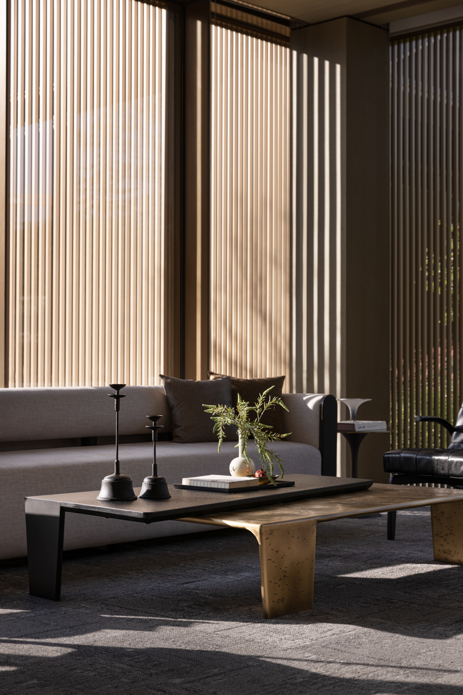 로비는 차가운 금속과 대리석, 따듯한 나무 베니어의 분위기로 병치되어 다양한 질감 사이에서 고객을 맞이한다. 로비의 아트리움은 단순한 선과 부드러운 빛이 혼합되어 공간에 활력을 불어넣는다. 로비에 마련된 넓은 프레임은 정원의 녹지를 내부로 끌어들여 경계를 모호하게 만든다. 내부의 장식적인 천은 금속 광택과 부드럽게 얽혀 생생한 질감을 보여주고, 방문객의 시선을 사로잡는 긴장감을 한층 부여한다. 안뜰의 독립적인 공간은 동양적인 매력과 현대적인 미학이 어우러진 VIP 공간이다. 자연 경관은 대형 유리 창을 통해 내부에 매끄럽게 통합되어 창가의 낮은 높이의 가구와 조화를 이룬다.