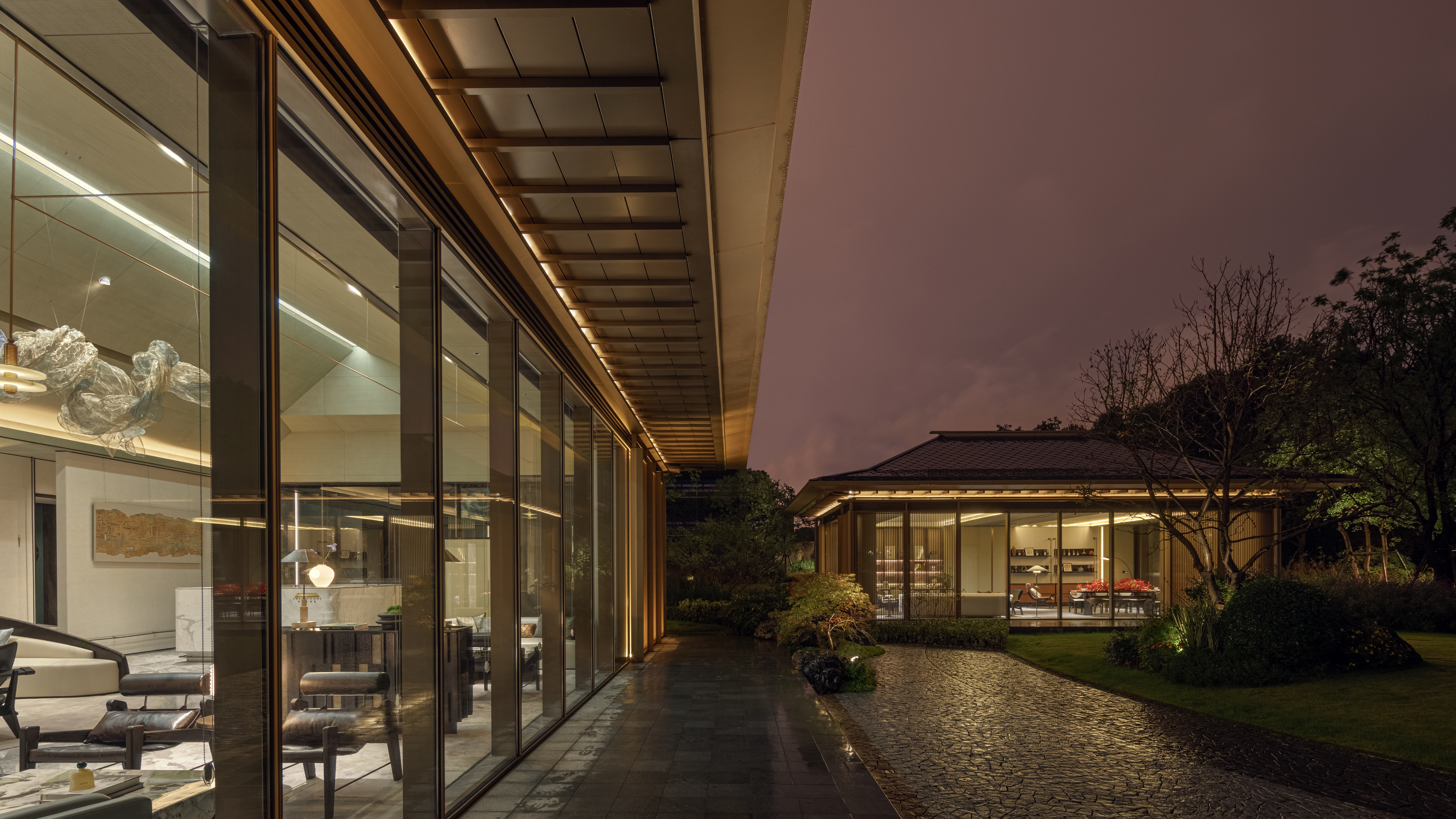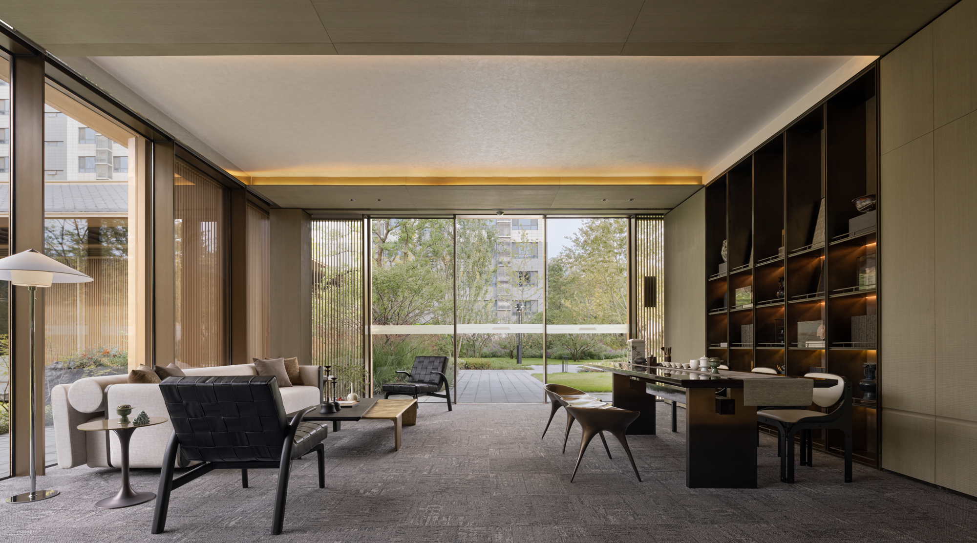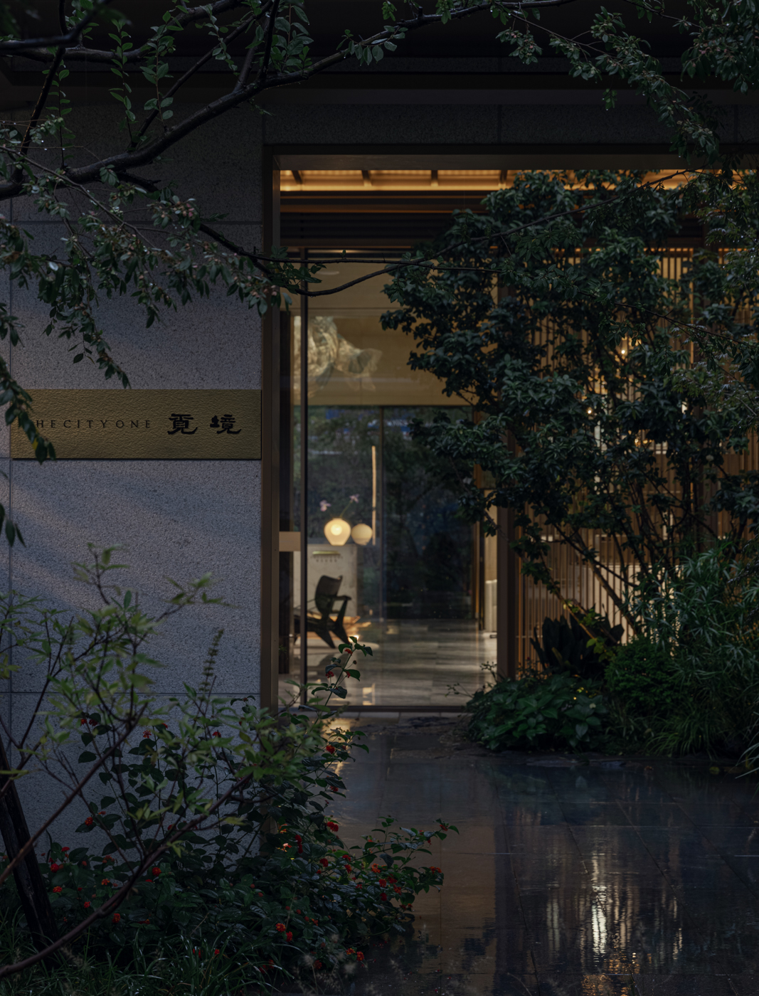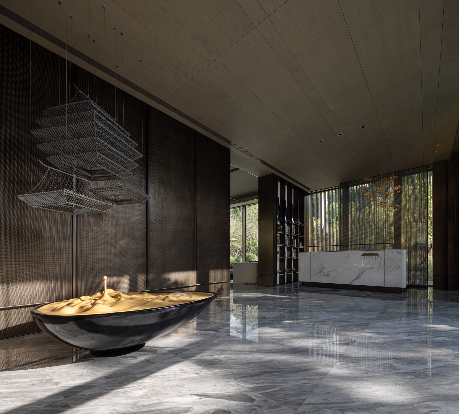 로비는 차가운 금속과 대리석, 따듯한 나무 베니어의 분위기로 병치되어 다양한 질감 사이에서 고객을 맞이한다. 로비의 아트리움은 단순한 선과 부드러운 빛이 혼합되어 공간에 활력을 불어넣는다. 로비에 마련된 넓은 프레임은 정원의 녹지를 내부로 끌어들여 경계를 모호하게 만든다. 내부의 장식적인 천은 금속 광택과 부드럽게 얽혀 생생한 질감을 보여주고, 방문객의 시선을 사로잡는 긴장감을 한층 부여한다. 안뜰의 독립적인 공간은 동양적인 매력과 현대적인 미학이 어우러진 VIP 공간이다. 자연 경관은 대형 유리 창을 통해 내부에 매끄럽게 통합되어 창가의 낮은 높이의 가구와 조화를 이룬다.