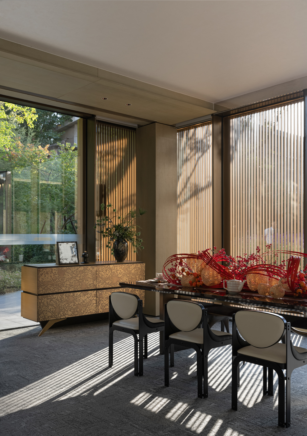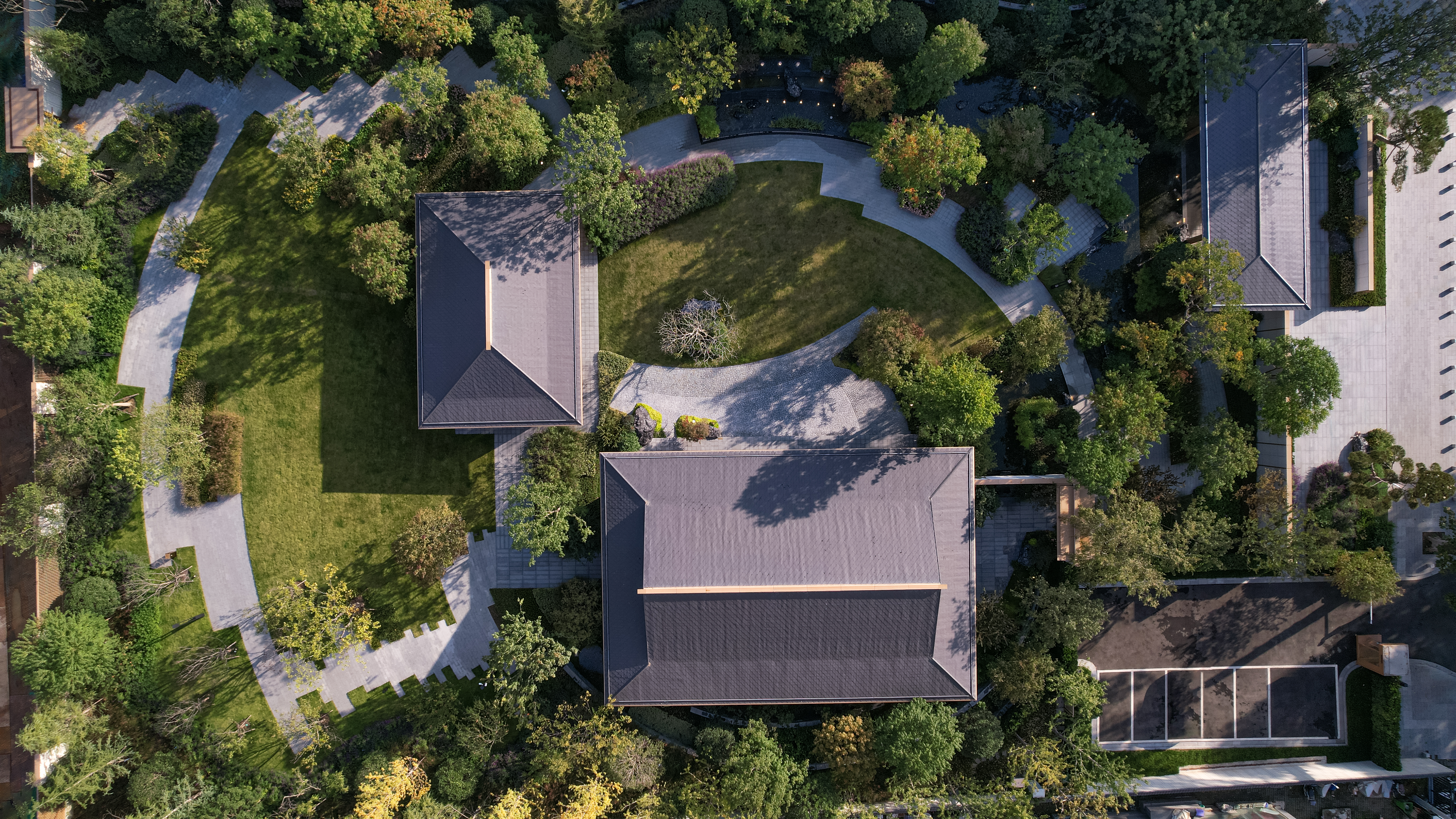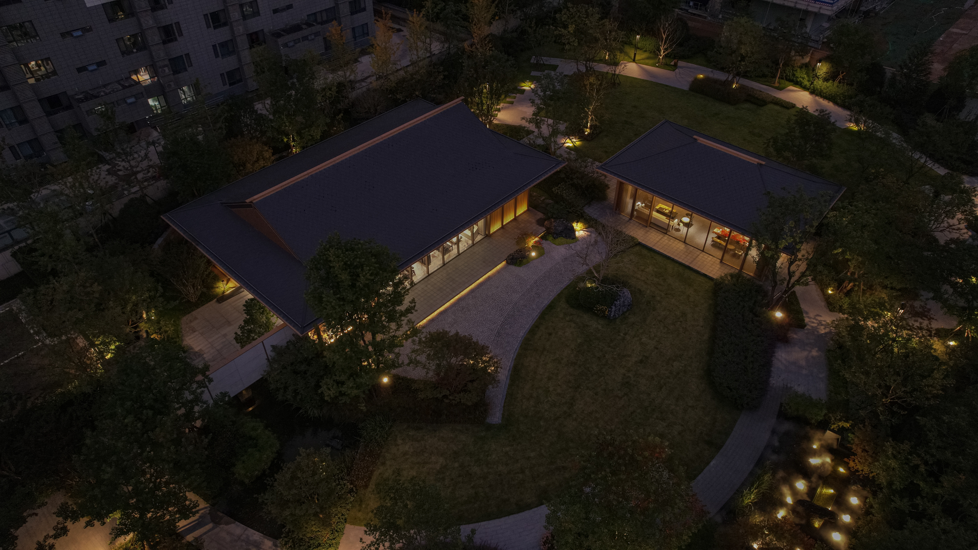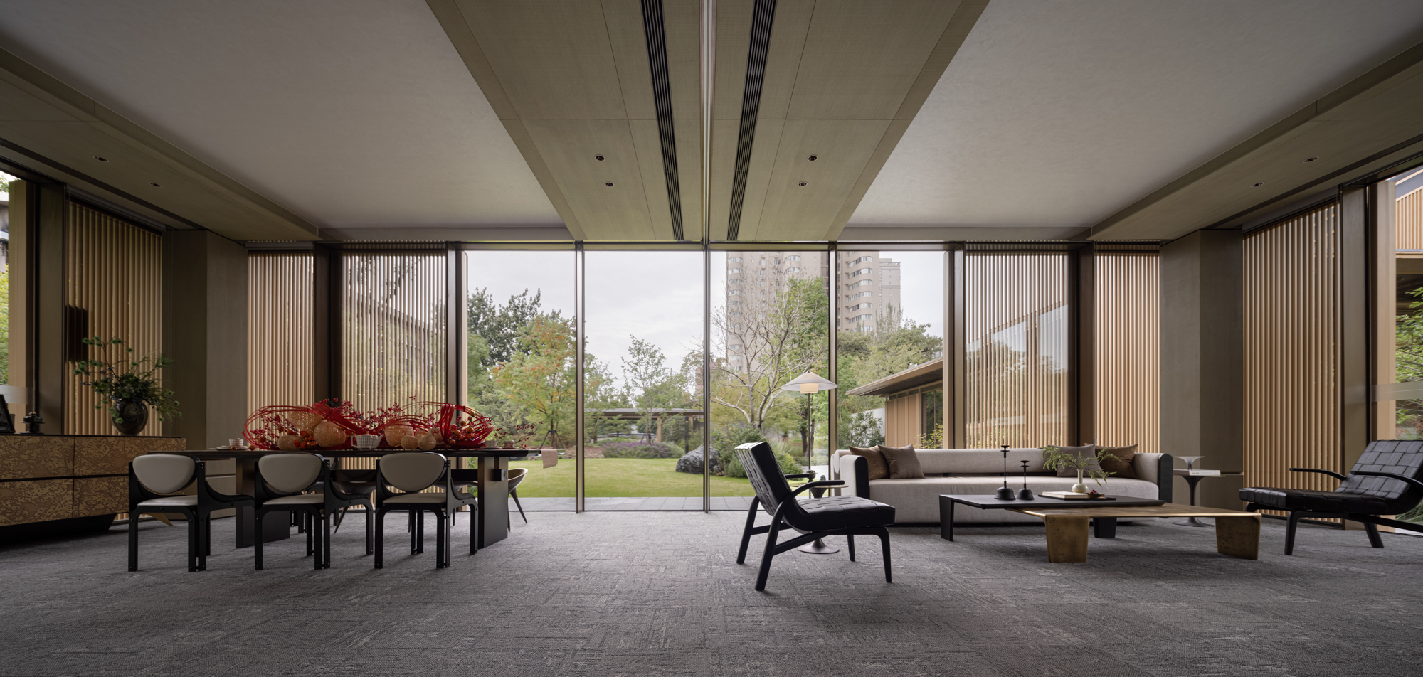 로비는 차가운 금속과 대리석, 따듯한 나무 베니어의 분위기로 병치되어 다양한 질감 사이에서 고객을 맞이한다. 로비의 아트리움은 단순한 선과 부드러운 빛이 혼합되어 공간에 활력을 불어넣는다. 로비에 마련된 넓은 프레임은 정원의 녹지를 내부로 끌어들여 경계를 모호하게 만든다. 내부의 장식적인 천은 금속 광택과 부드럽게 얽혀 생생한 질감을 보여주고, 방문객의 시선을 사로잡는 긴장감을 한층 부여한다. 안뜰의 독립적인 공간은 동양적인 매력과 현대적인 미학이 어우러진 VIP 공간이다. 자연 경관은 대형 유리 창을 통해 내부에 매끄럽게 통합되어 창가의 낮은 높이의 가구와 조화를 이룬다.