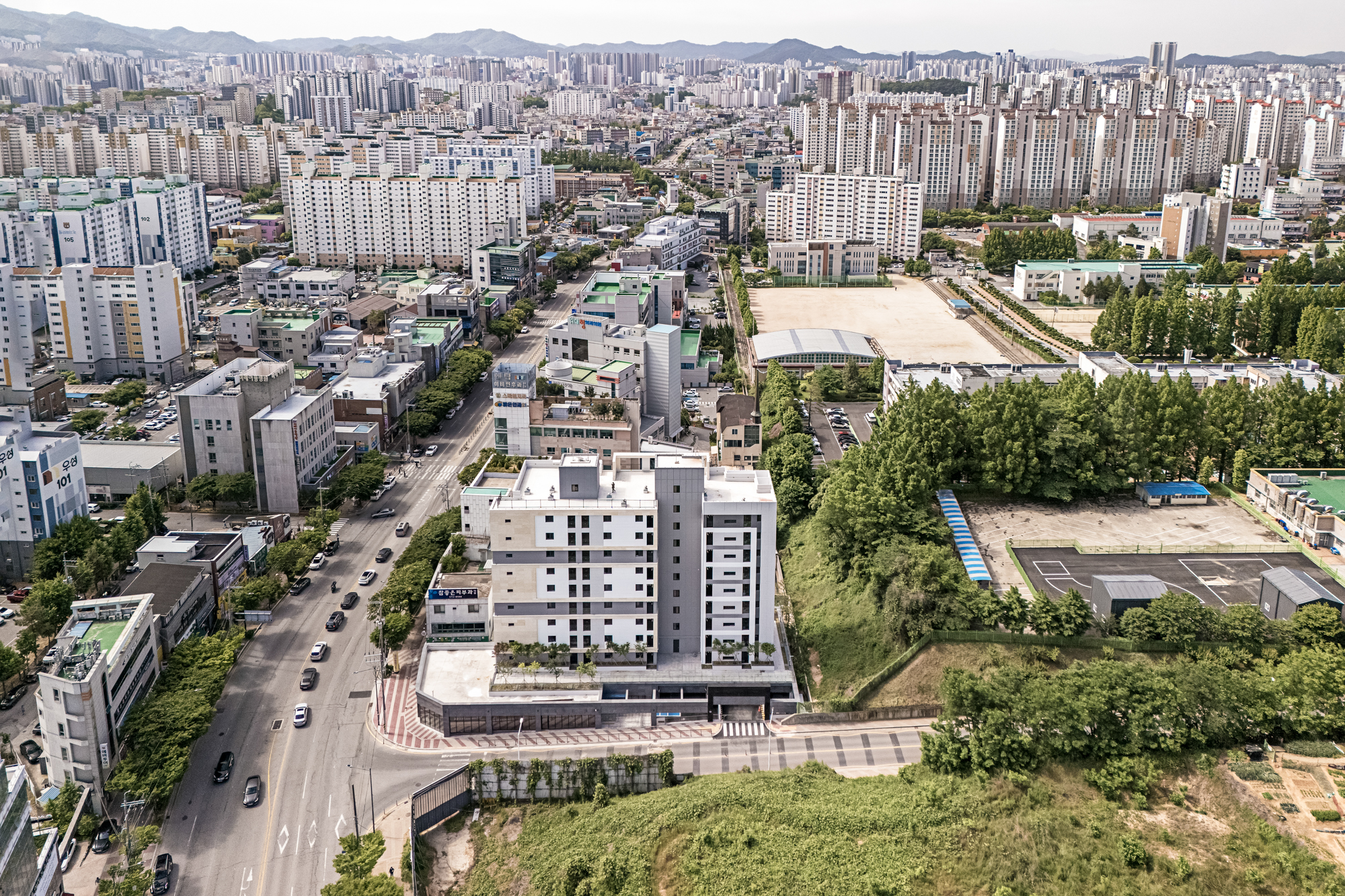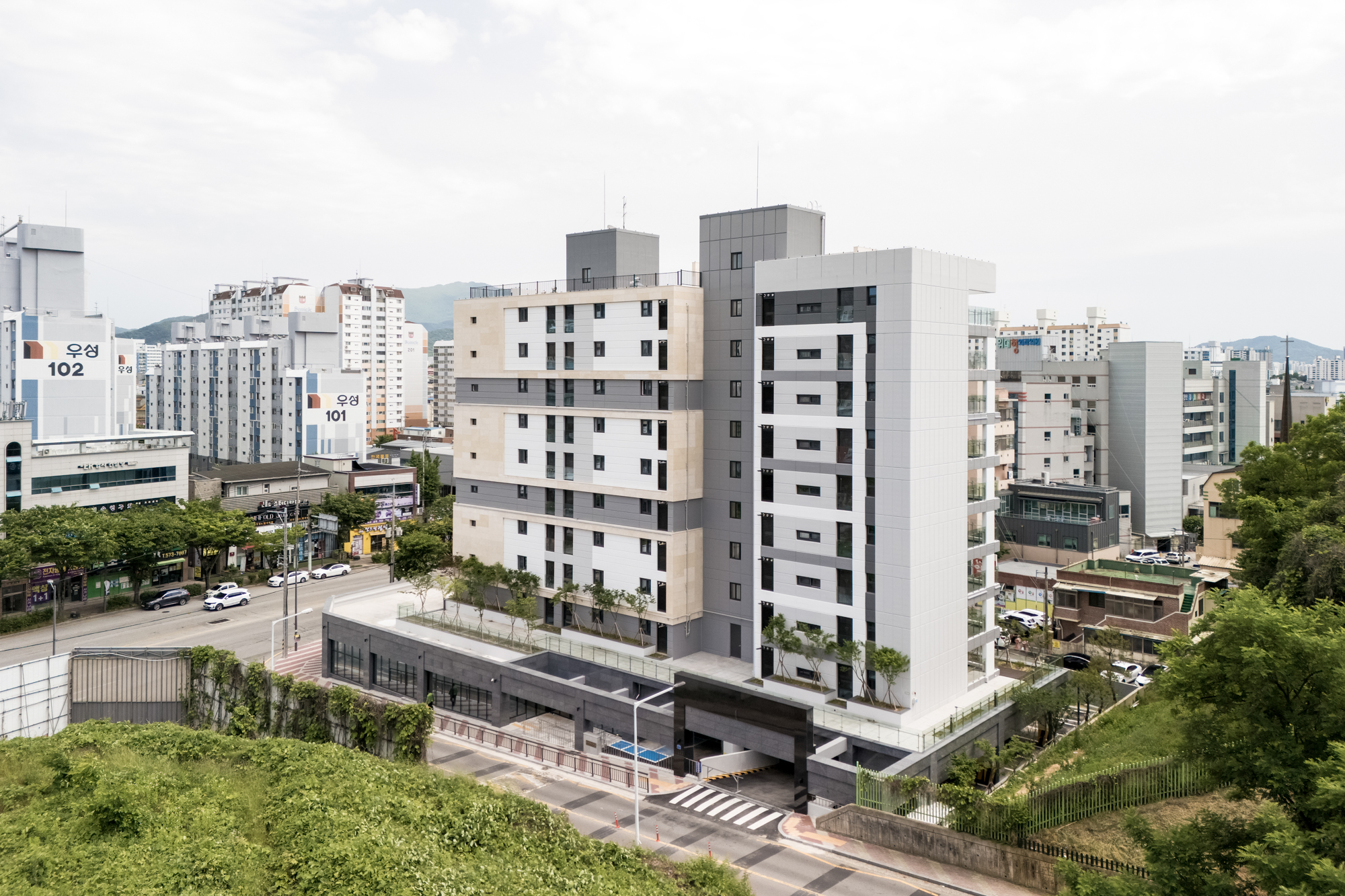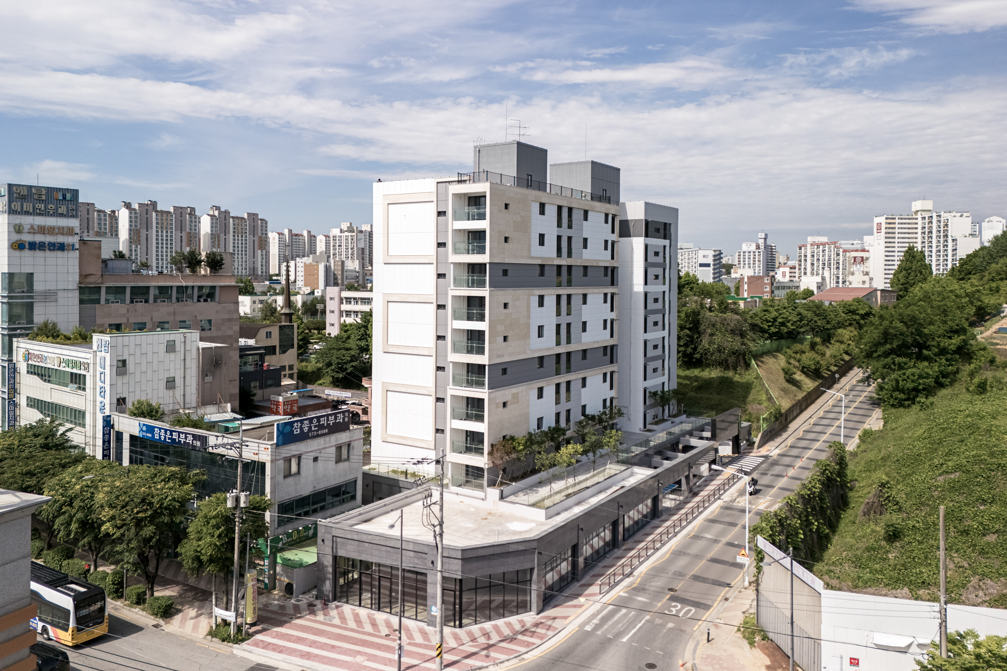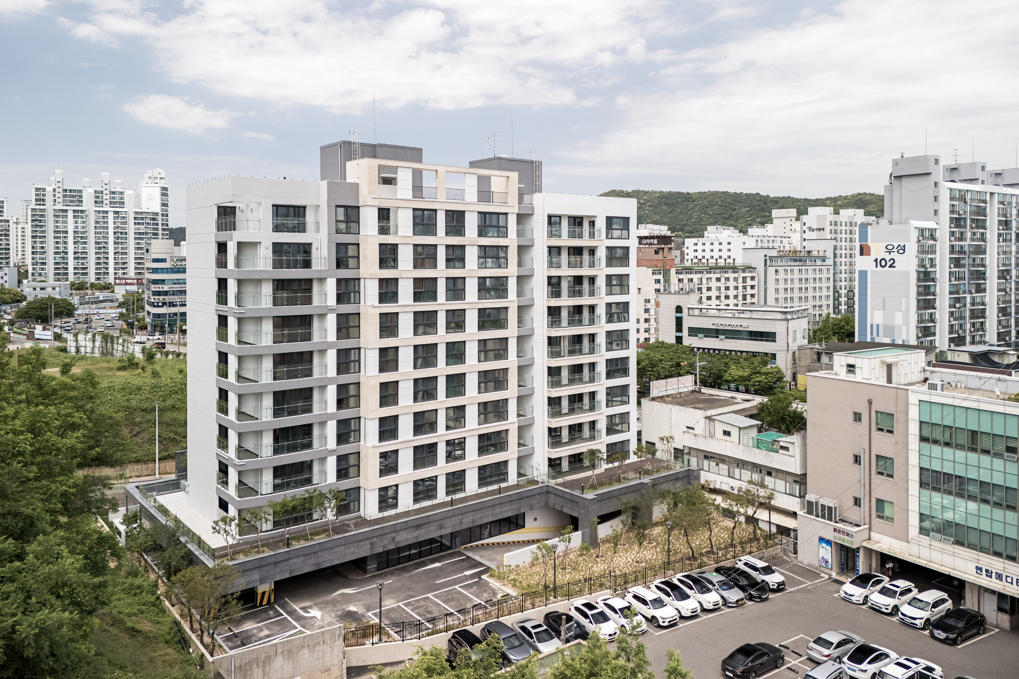 도로에 면한 북측과 동측은 채광 확보를 위해 주거 공간을 뒤로 이동시키며 옥상 정원을 만들고 도로변 이용자의 스케일에 적합한 볼륨을 설정했다. 대로변에서 보이는 건축물의 입면은 일반적인 공동주택과는 차별을 두어 실제 용도를 모호하게 알아보게끔 의도했다.