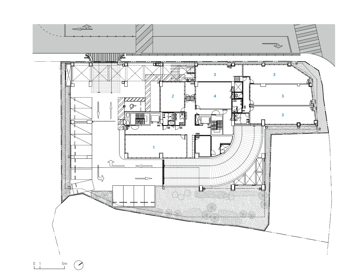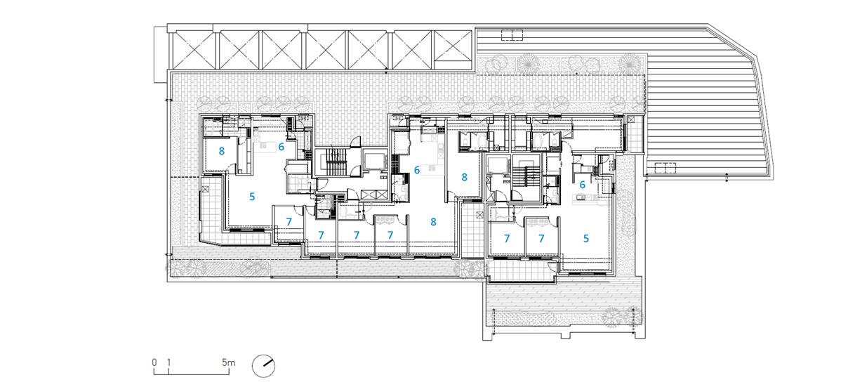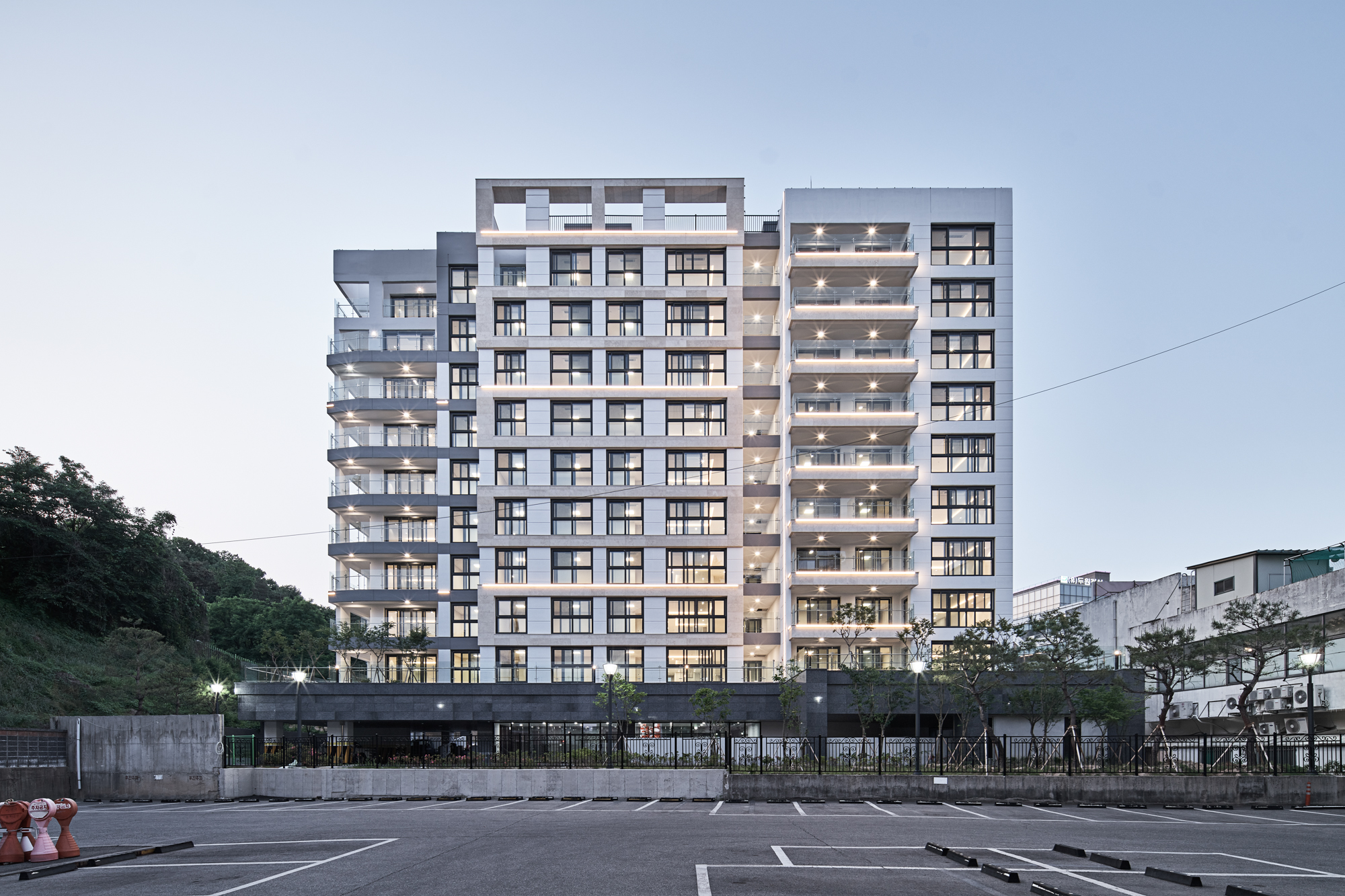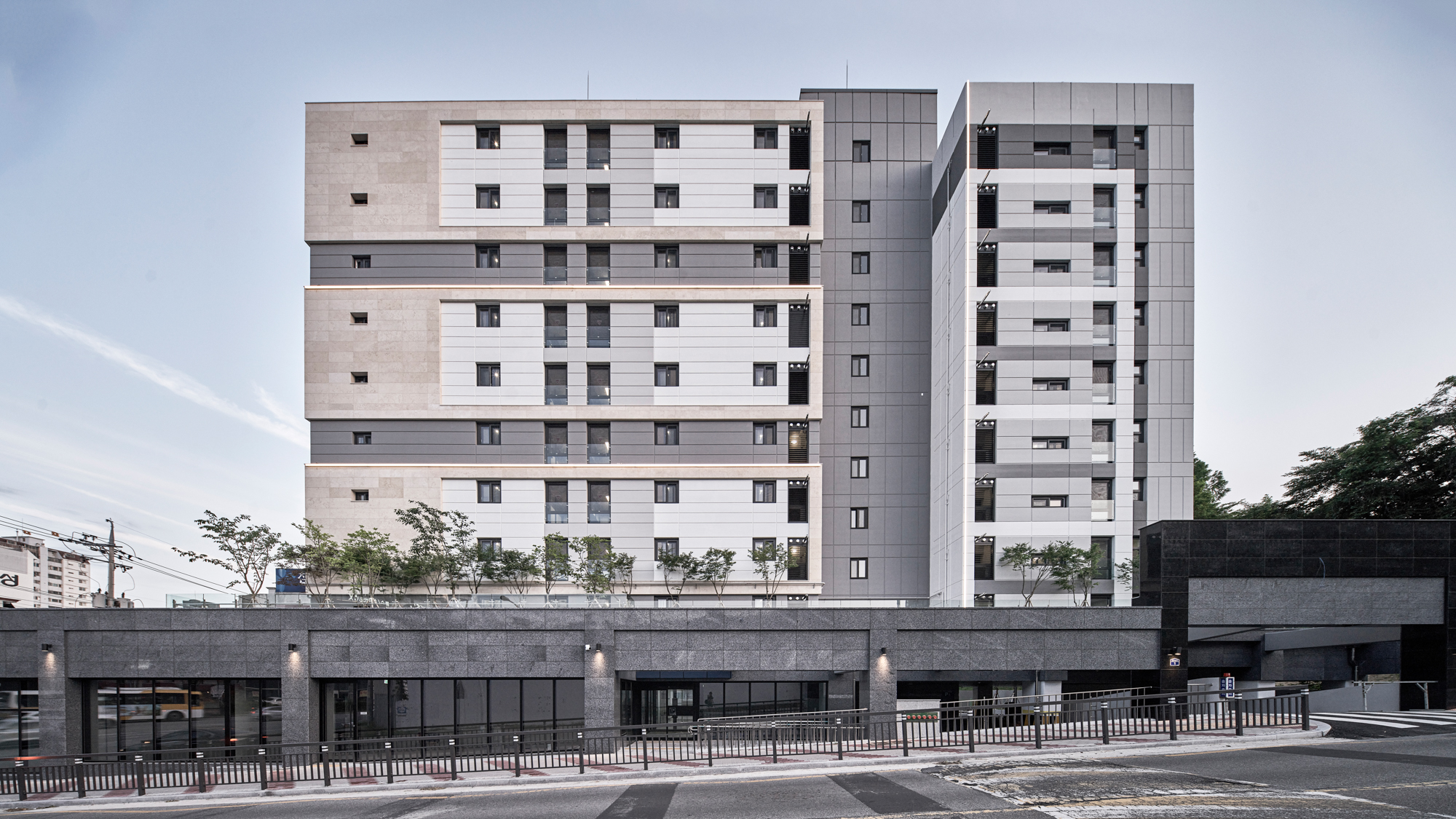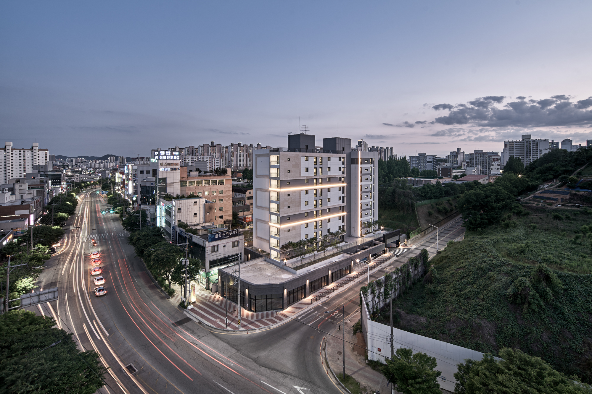 도로에 면한 북측과 동측은 채광 확보를 위해 주거 공간을 뒤로 이동시키며 옥상 정원을 만들고 도로변 이용자의 스케일에 적합한 볼륨을 설정했다. 대로변에서 보이는 건축물의 입면은 일반적인 공동주택과는 차별을 두어 실제 용도를 모호하게 알아보게끔 의도했다.