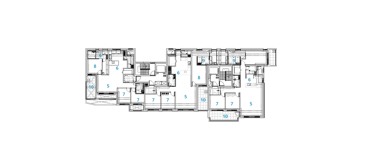 대로변에 면한 세대는 남측 폭이 좁지만 동측으로 주침실의 발코니가 있으며 거실과 자녀 침실에서 완전히 분리된다. 전용 파우더룸과 드레스룸은 욕실 공간과 함께 침실과 연결했다. 남북으로 열린 세대는 주침실 남측으로 전용 발코니가 있으며, 1호 세대와 동일한 서비스 공간이 구성되고 연결된다. 북서로 열린 세대는 가장 작은 단위세대지만, 거실과 주침실에 전용 발코니가 있어 서측의 광주공업고등학교 방향의 조망이 가능하게 계획했다.