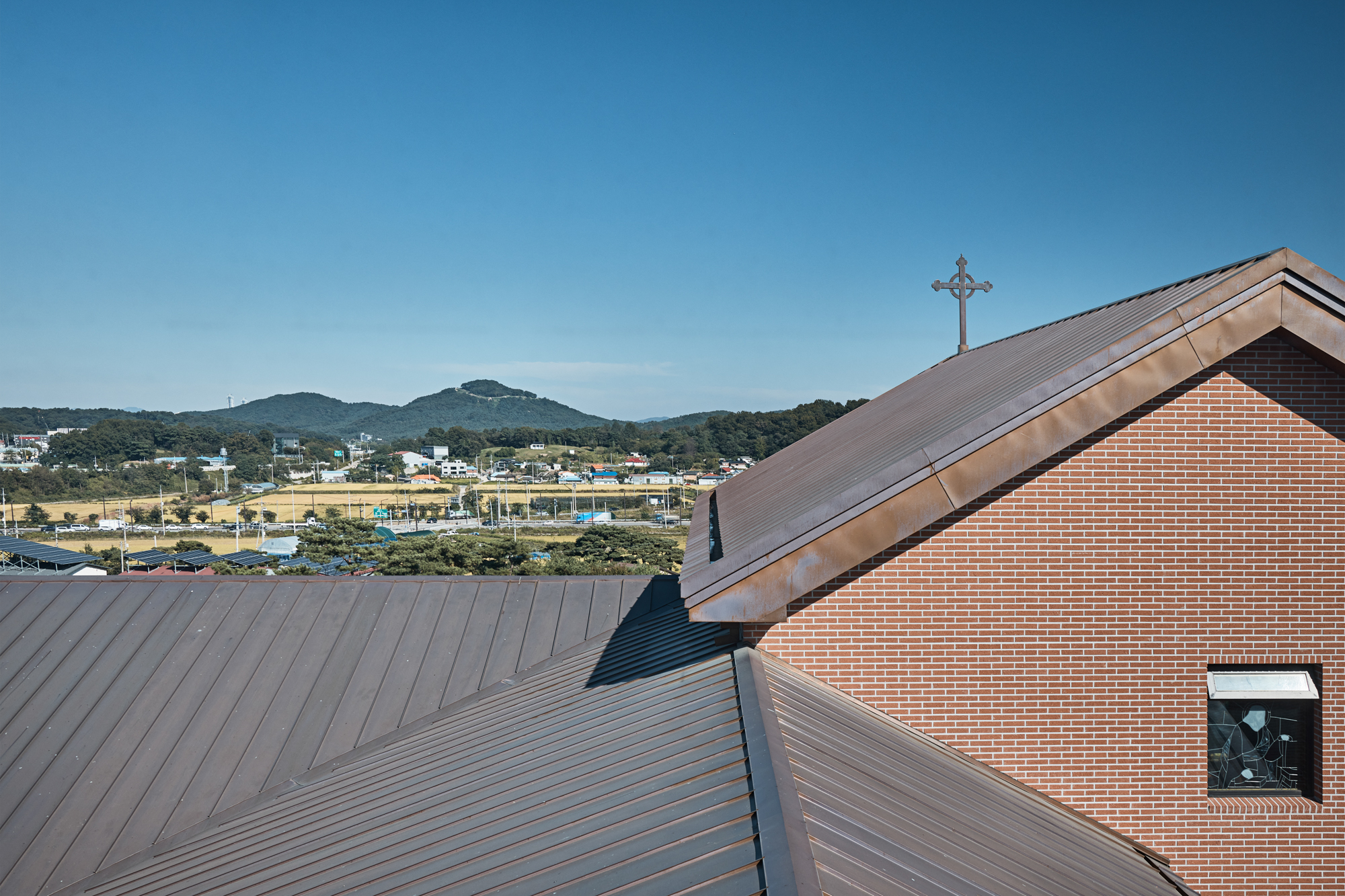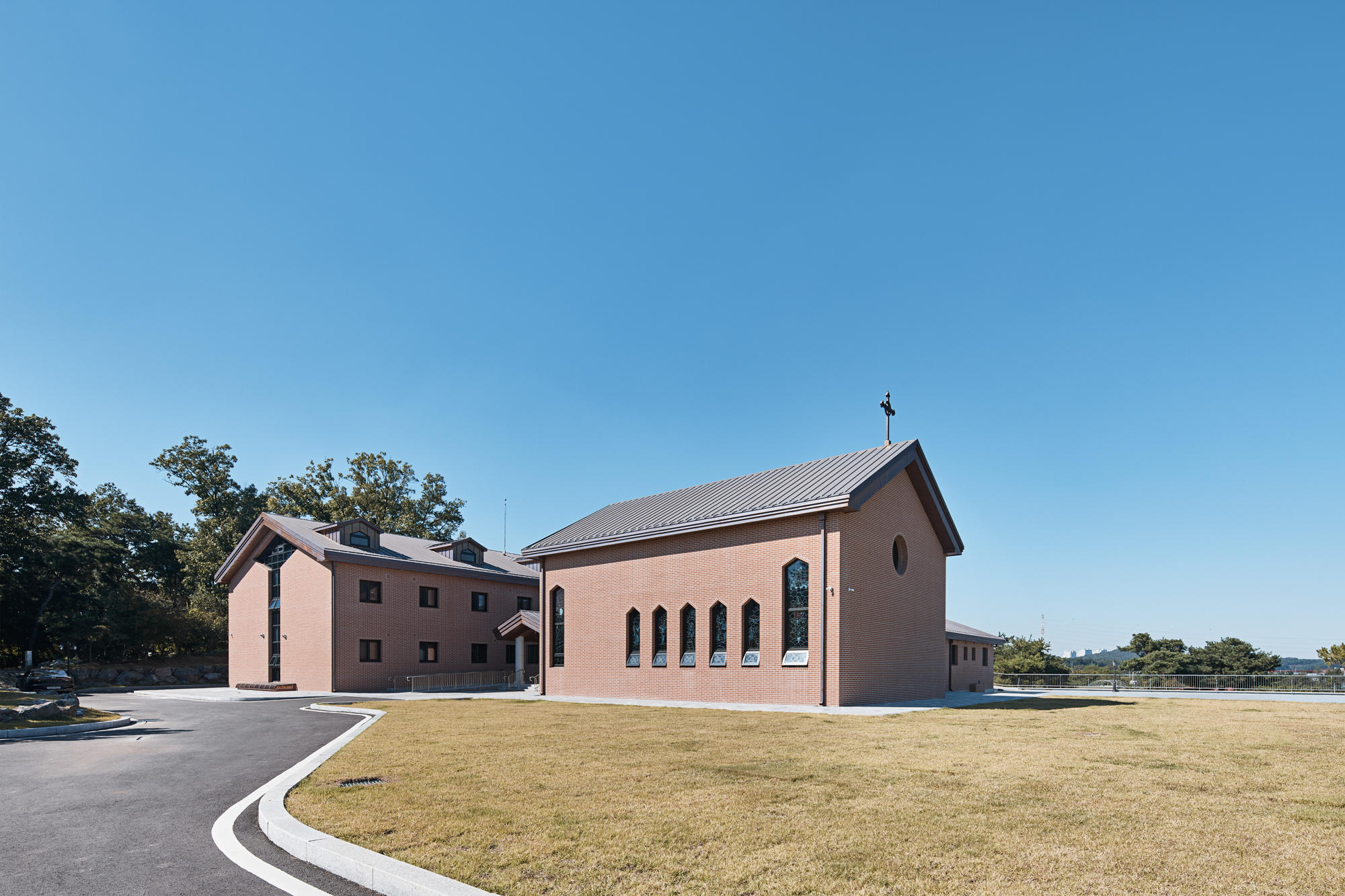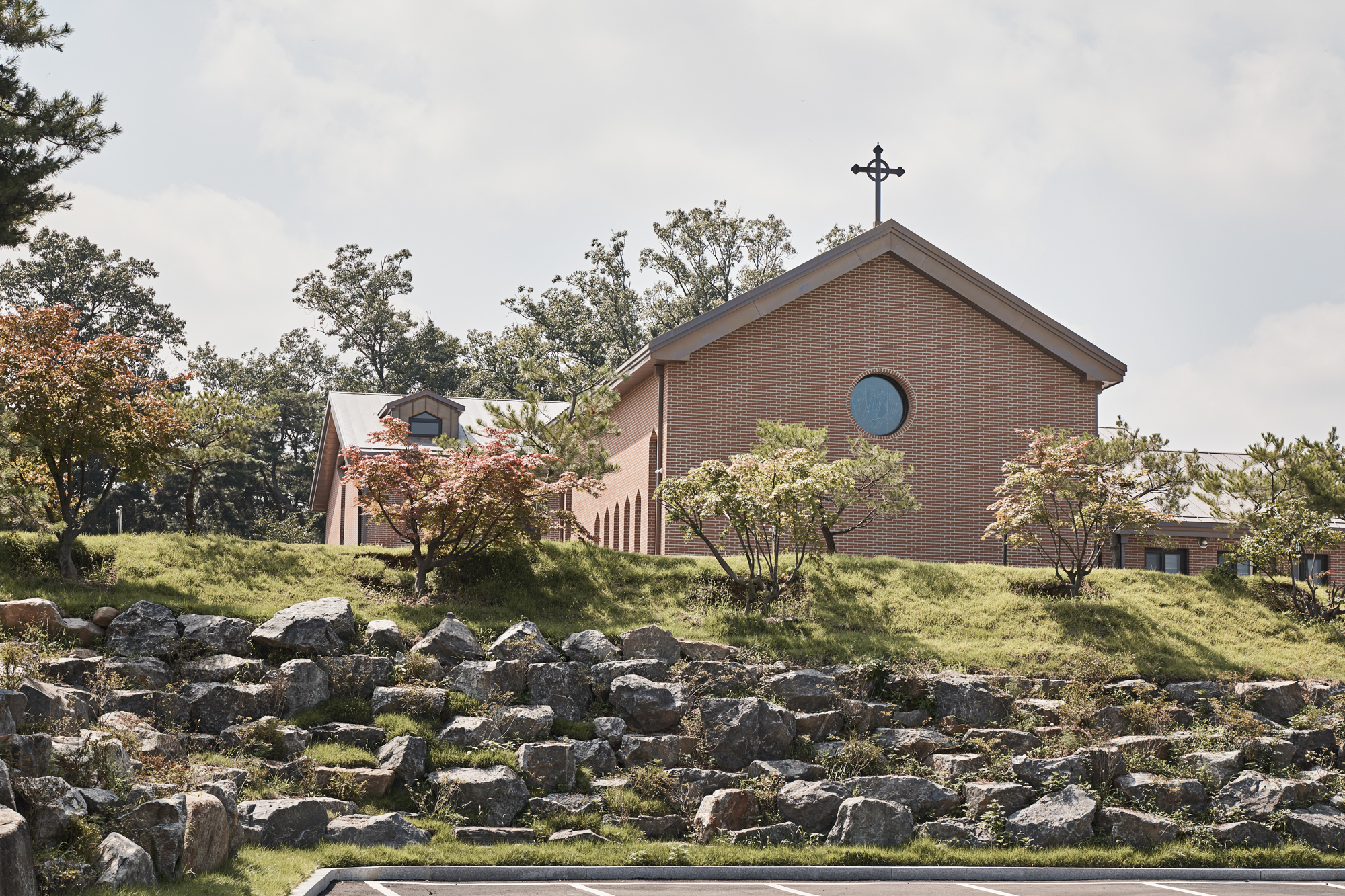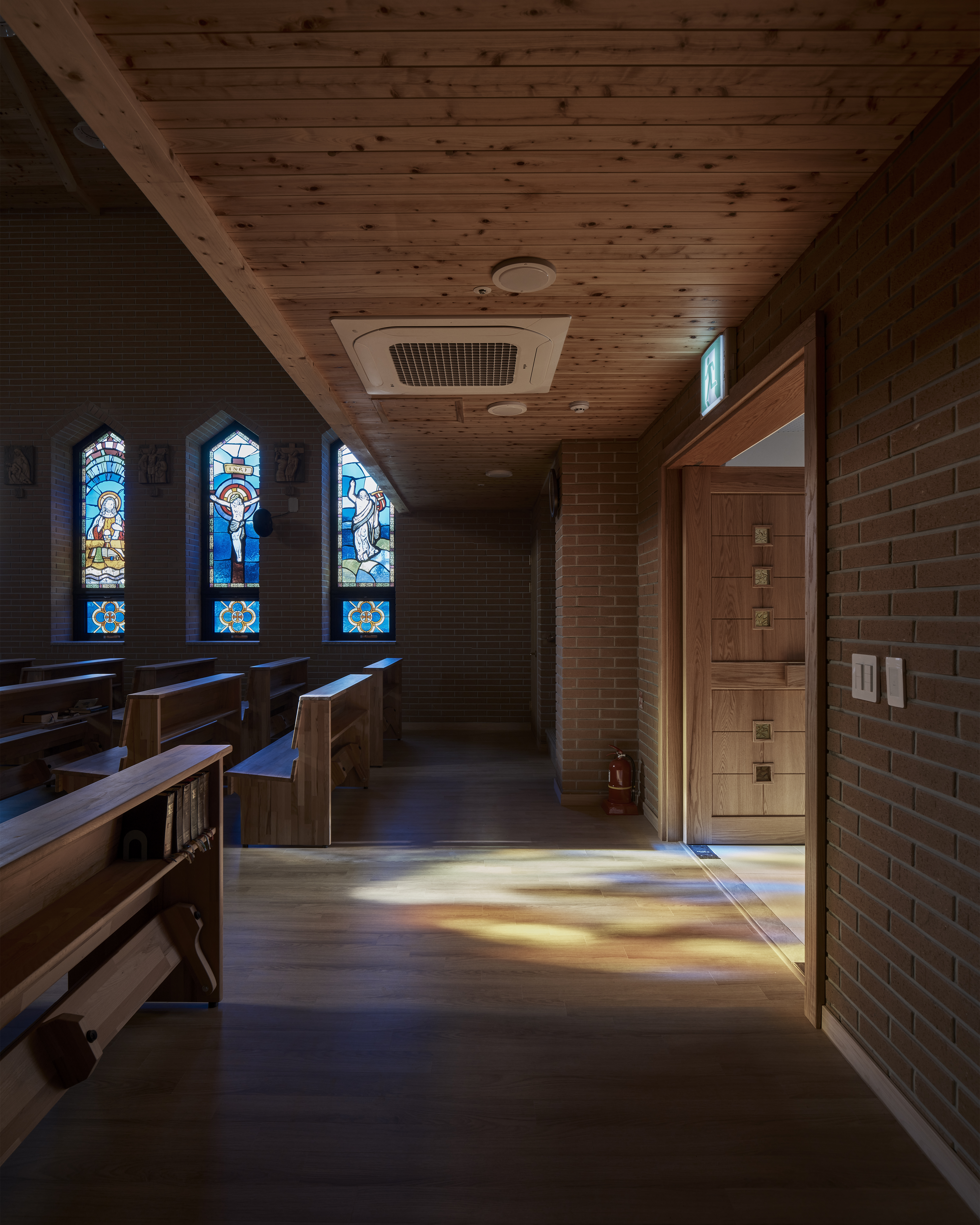 주요 외장재는 벽체는 점토벽돌, 지붕에는 동판을 사용하였다. 여기에 외부에서 보이는 벽돌 모듈과 내부 공간에도 벽돌을 사용하여, 종교시설 사용자의 요구사항을 만족할 수 있는 입면으로 계획했다. 평면에서 벽돌 장변 240mm를 잘라서 쓰지 않고 온장으로 사용하기 위해 평면과 단면의 전체 길이와 개구부를 벽돌 모듈에 맞췄다. 성당의 내부 마감재도 벽돌을 사용하였는데, 통일된 마감재가 실내 공간에서도 일체된 공간의 경험을 만든다.