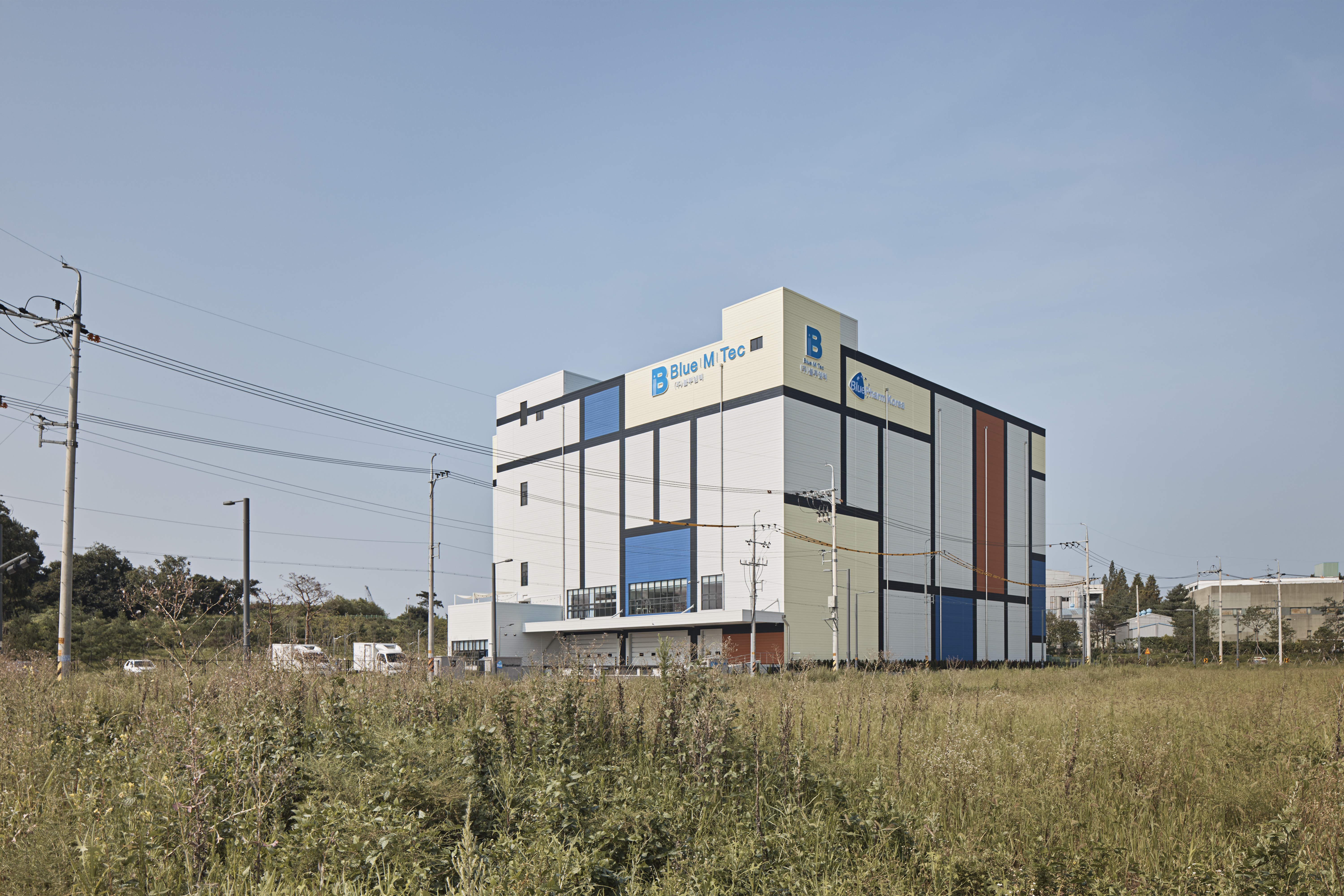 한편, 경관심의 과정에서 건축주의 요구사항에 따라 가장 많은 변경 사항이 적용된 부분은 입면 계획이었다. 당초 제안은 알약의 다양한 색상을 입면에 적용하여 의약품 물류창고로서 아이덴티티를 확보하는 것이었다. 건축주는 홍보효과를 위해 공장 외벽면에 몬드리안 회화를 적용할 것을 요구했다. 이에 따라 건축가는 회화를 건축적으로 적용할 수 있는 방안을 고민해야 했다. 그 결과, 몬드리안 구성을 건축물 외벽에 적용하였고 정육면체의 매스가 하나의 회화처럼 보이도록 두 면을 연결하여 입체적인 구성으로 계획했다.