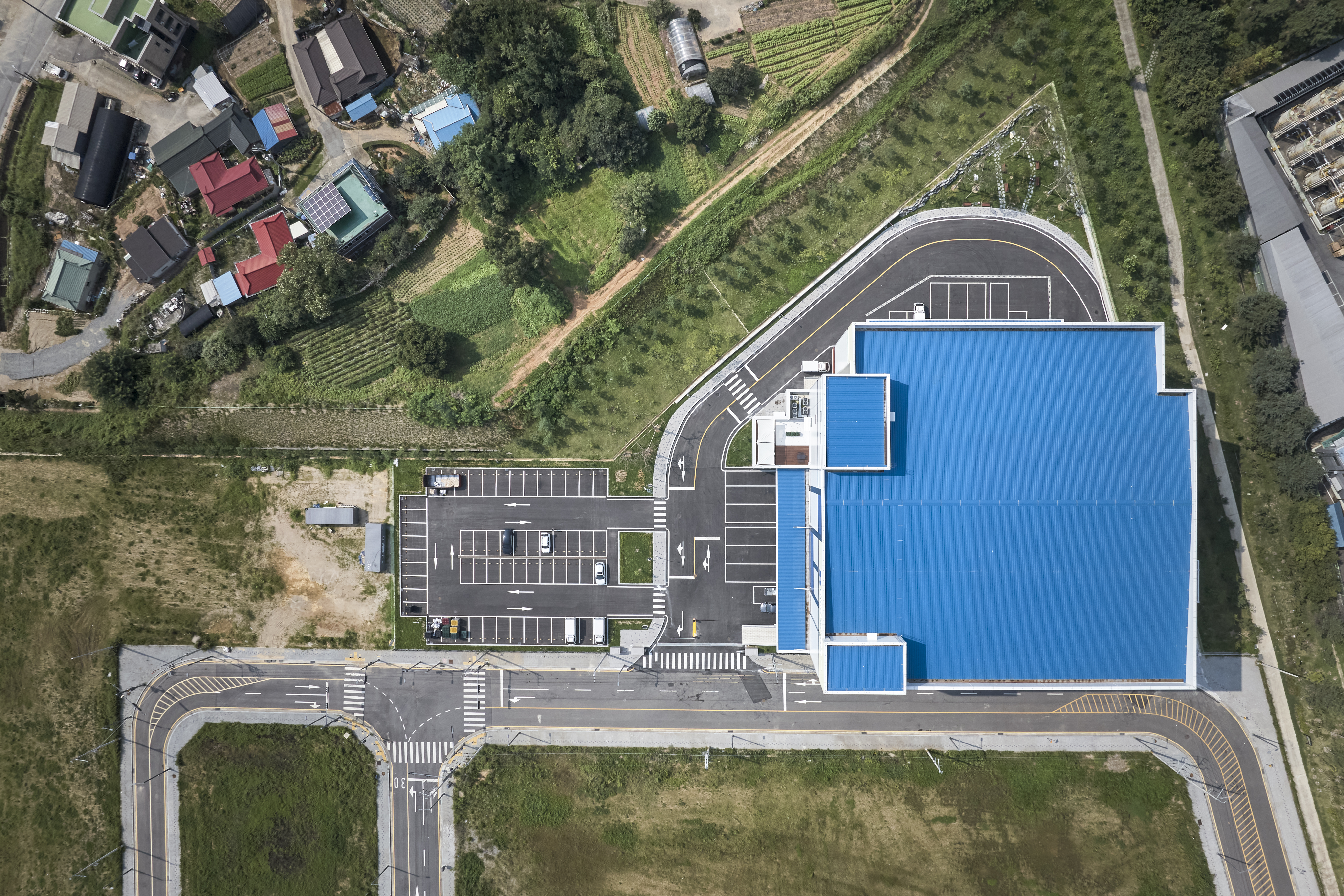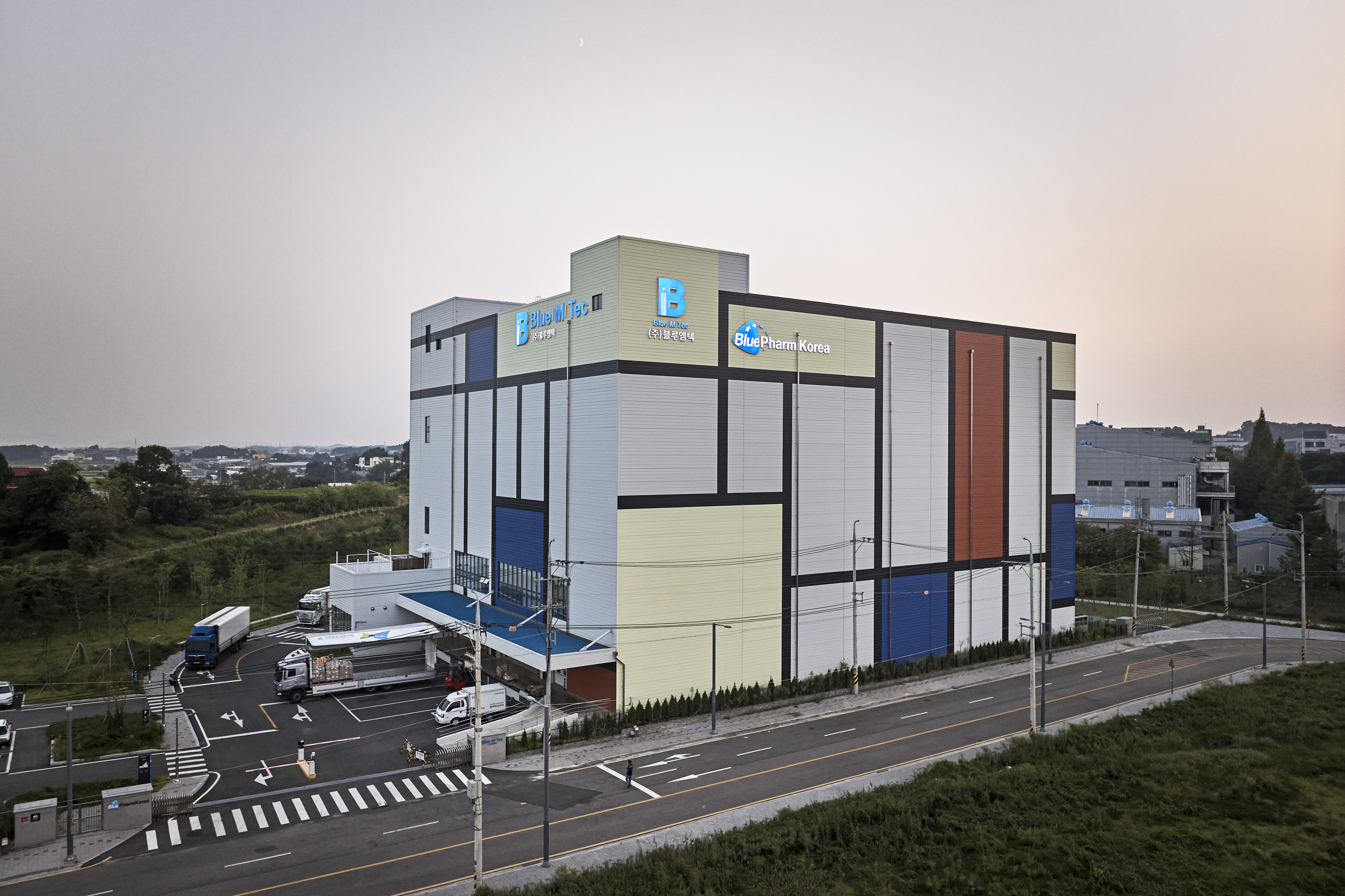 블루엠텍 평택물류센터 드림 1호는 의약품 전문 물류센터로 평택드림테크 산업단지 내에 위치해 있으며, 평택파주고속도로 어연IC를 통해 접근이 가능하다. 대지의 북측은 드림산단로에 면하고 남측은 마을과 접하는 동서로 긴 삼각형의 형태이다. 이러한 대지의 형태를 반영하여 도로에 면한 서측으로는 수평 증축을 고려한 유보 대지에 주차 공간을 만들었고, 서측과 남측에는 화물 차량이 접근 가능한 로딩 데크를 계획했다. 남측의 삼각형 모서리에 해당하는 대지에는 효과적인 조경 계획을 통해 운송 노동자들의 휴게 공간을 마련했다.