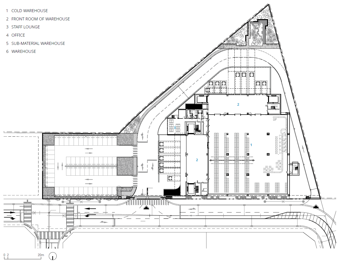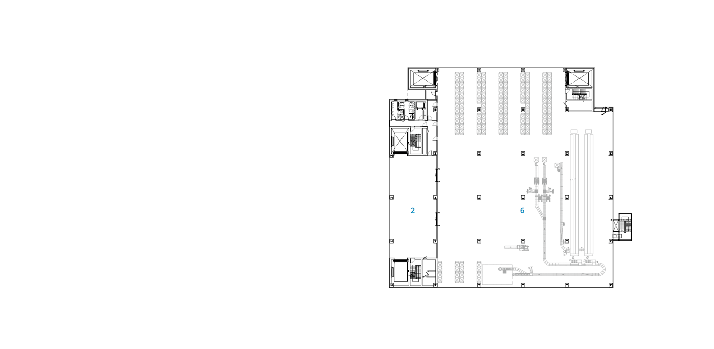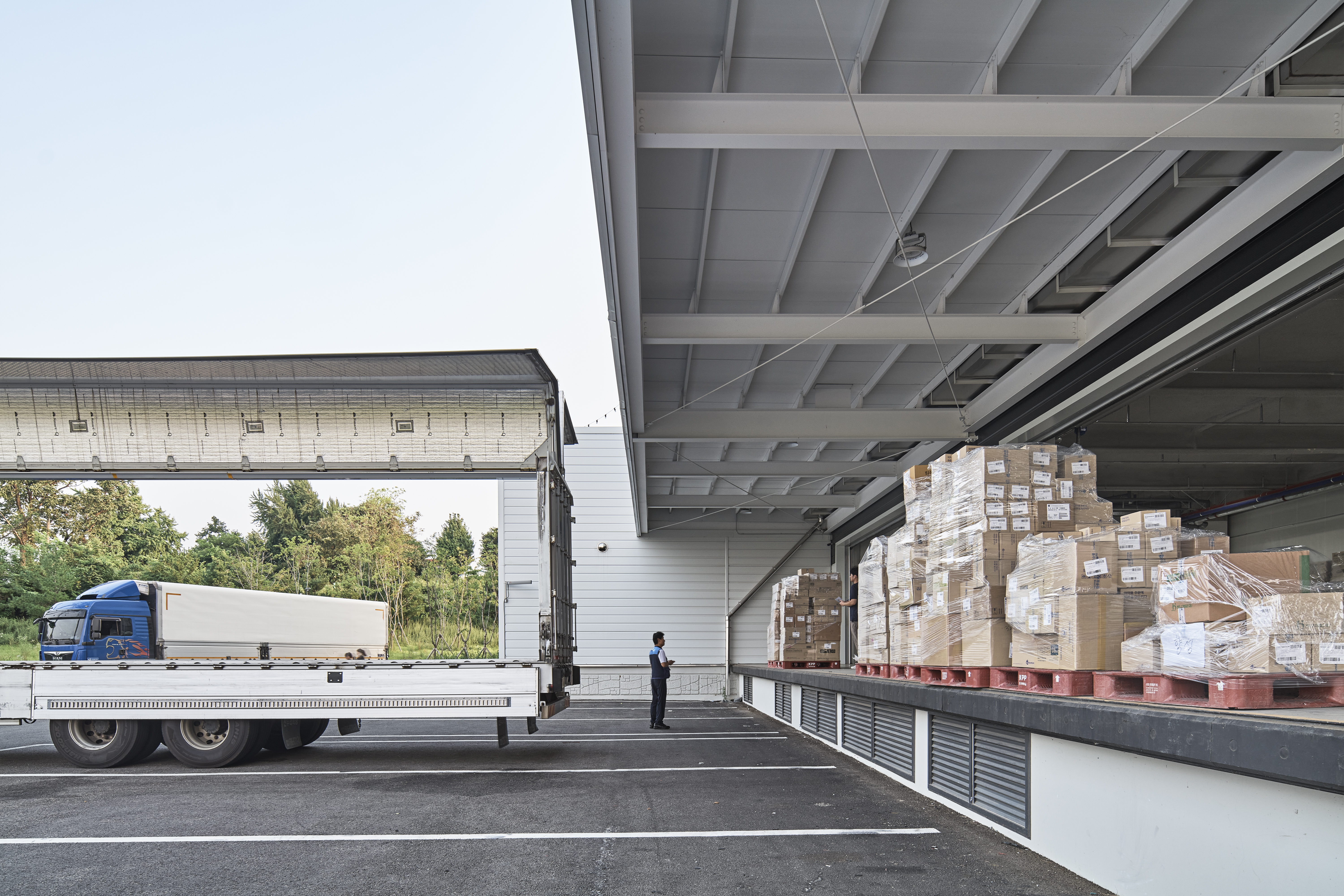일반적인 물류창고는 화물 차량의 직접 접근을 고려한 로딩 데크를 각층에 설치한다. 블루엠텍 평택물류센터 드림 1호는 의약품 전문 물류창고로, 반입 시에는 대형 물품, 반출 시에는 소형 물품이 된다는 특징을 지닌다. 건축가는 이러한 특징을 고려하여 반입과 반출 로딩 데크와 화물용 대형 엘리베이터를 각각 분리하여 원활한 화물 반출입이 가능하게 했다. 지상 1층과 2층에는 중층을 설치해 업무시설로 활용하였는데, 지상 4층 규모의 정육면체 형태의 공간 안에 지상 3층 규모의 층을 형성하며 대공간을 형성하였다.
