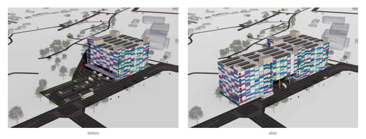 한편, 경관심의 과정에서 건축주의 요구사항에 따라 가장 많은 변경 사항이 적용된 부분은 입면 계획이었다. 당초 제안은 알약의 다양한 색상을 입면에 적용하여 의약품 물류창고로서 아이덴티티를 확보하는 것이었다. 건축주는 홍보효과를 위해 공장 외벽면에 몬드리안 회화를 적용할 것을 요구했다. 이에 따라 건축가는 회화를 건축적으로 적용할 수 있는 방안을 고민해야 했다. 그 결과, 몬드리안 구성을 건축물 외벽에 적용하였고 정육면체의 매스가 하나의 회화처럼 보이도록 두 면을 연결하여 입체적인 구성으로 계획했다.