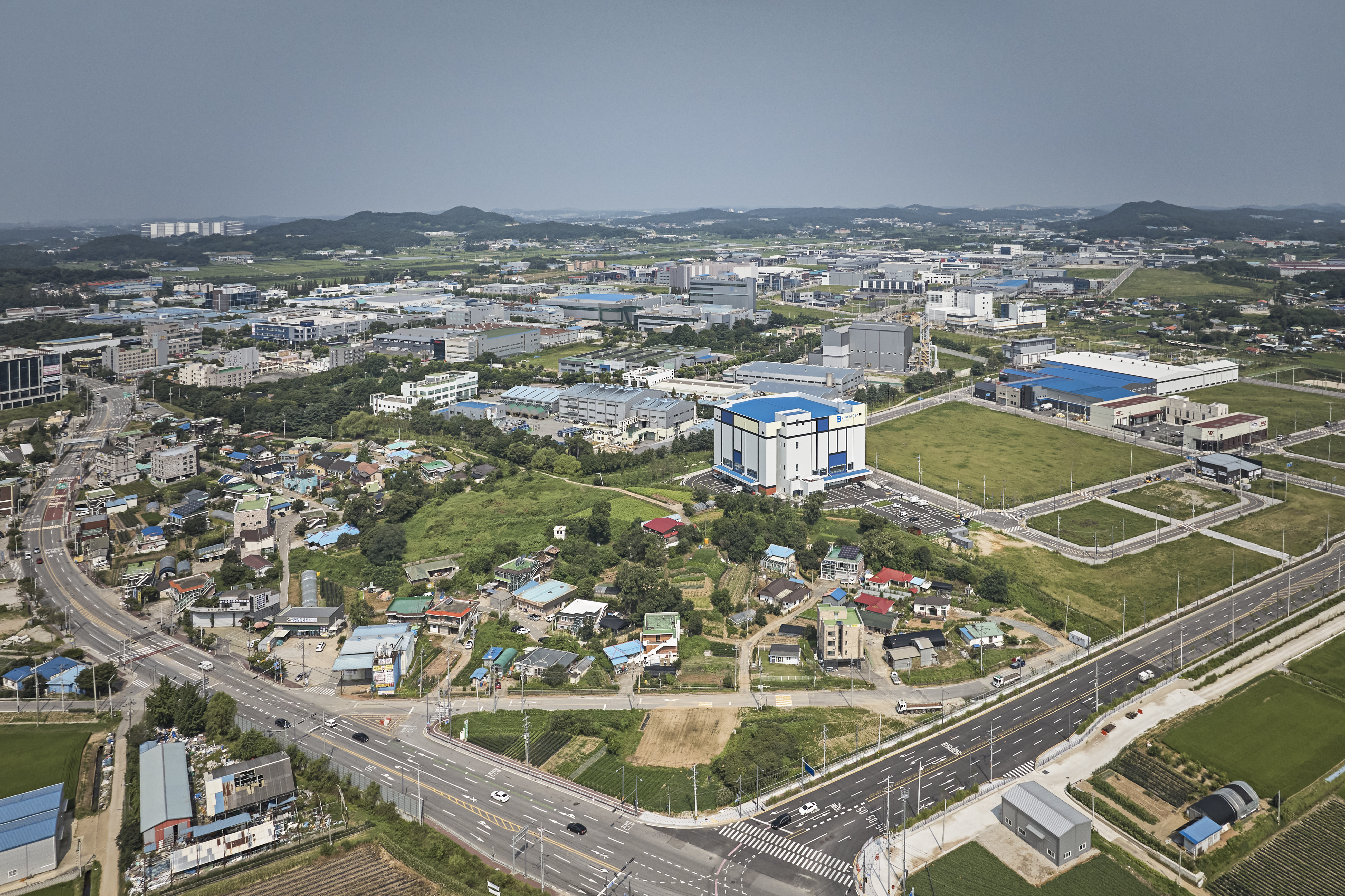 블루엠텍 평택물류센터 드림 1호는 의약품 전문 물류센터로 평택드림테크 산업단지 내에 위치해 있으며, 평택파주고속도로 어연IC를 통해 접근이 가능하다. 대지의 북측은 드림산단로에 면하고 남측은 마을과 접하는 동서로 긴 삼각형의 형태이다. 이러한 대지의 형태를 반영하여 도로에 면한 서측으로는 수평 증축을 고려한 유보 대지에 주차 공간을 만들었고, 서측과 남측에는 화물 차량이 접근 가능한 로딩 데크를 계획했다. 남측의 삼각형 모서리에 해당하는 대지에는 효과적인 조경 계획을 통해 운송 노동자들의 휴게 공간을 마련했다.