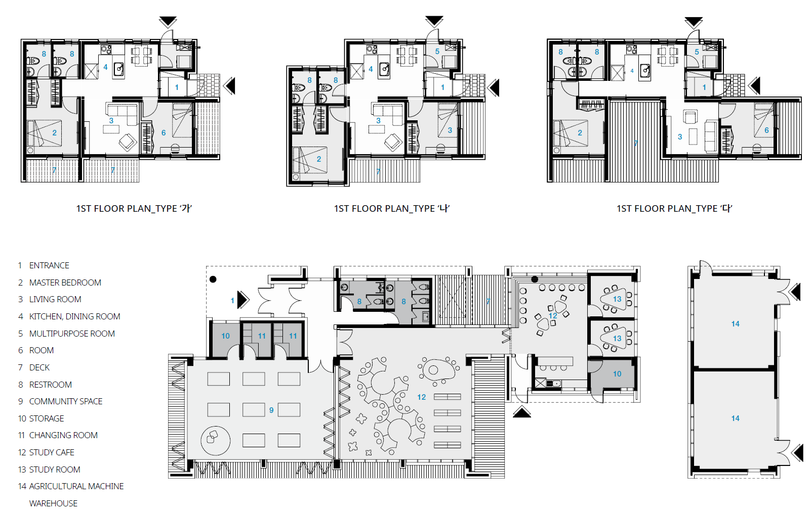 단독주택은 모듈러 방식 제작을 고려하여, 3개 모듈의 조합을 통해 다양한 평면을 만들었다. 커뮤니티센터는 학생들을 위한 스터디카페, 주민들의 평생교육 수업 공간으로 쓰이며, 행사 시 융통적으로 실을 사용할 수 있도록 폴딩도어를 적용하였다.