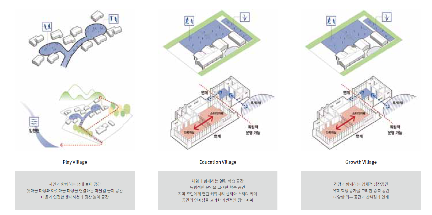 프로그램 계획에서 학생과 가족이 거주할 단독주택 10동, 마을 주민들이 함께 사용할 커뮤니티센터, 농기구 보관을 고려한 창고시설을 계획하며 주택과 공용시설 간 유기적인 연계를 고려했다. 배치는 주택 10동을 2개 마을로 분리하였다. 주민들의 편의성과 거주지의 독립성을 위해 단지 북측에 커뮤니티센터를 배치하였다. 두 개의 마을은 전통마을 마을길을 차용하여 길과 마당을 공유한다.