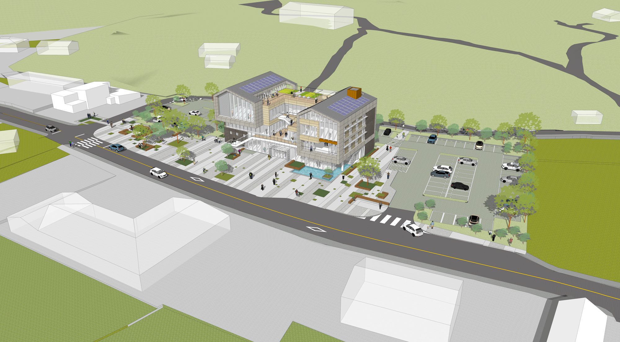 배치 계획에서 서측의 보건지소와의 연계를 고려하면서 부족한 주차공간 확보와 추후 시설 확장을 고려하여 주차장을 계획했고, 보행자와 차량 진출입을 분리하고 보행 약자와 하역을 고려하여 북쪽으로 차량 접근로와 주차장을 추가하였다.