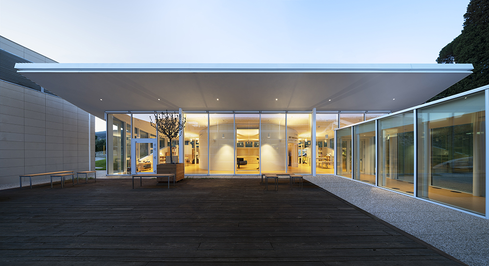 The iconic feature is a lightweight, upwardly curving roof that harmonizes with the hospital’s latest expansion. Beneath this roof, all facilities are gathered in a complex that provide a 360° view of the surrounding sensory gardens, which have been redesigned for various activities, including a school garden.