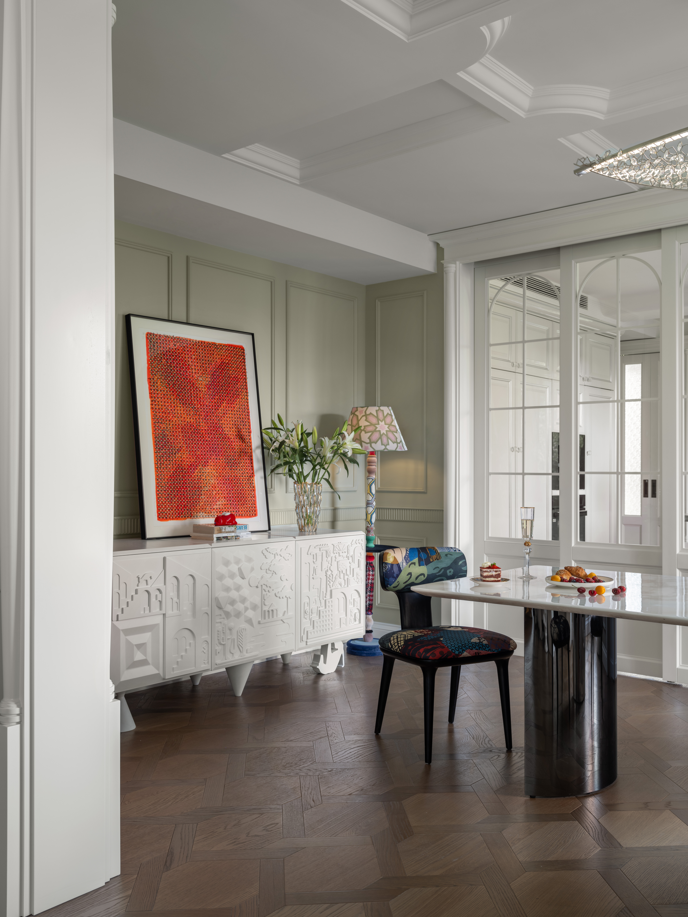 Compared to the formal French style of Lisa’s previous home, designer Fu Xia hoped to infuse more relaxation into the space this time, creating a sense of effortless elegance within the refined urban lifestyle. Compared to traditional luxury apartments, this renovation breaks away from the fixed layout of a standard flat by reorganizing the space. In the original structure, a long corridor separated the living area from the functional areas, making the space narrow and lacking in natural light. Fu Xia merged two smaller rooms to create a piano room for the daughter. This open space meets the emotional needs of the family of three to spend time together and significantly increases the natural light, making the living environment more comfortable.