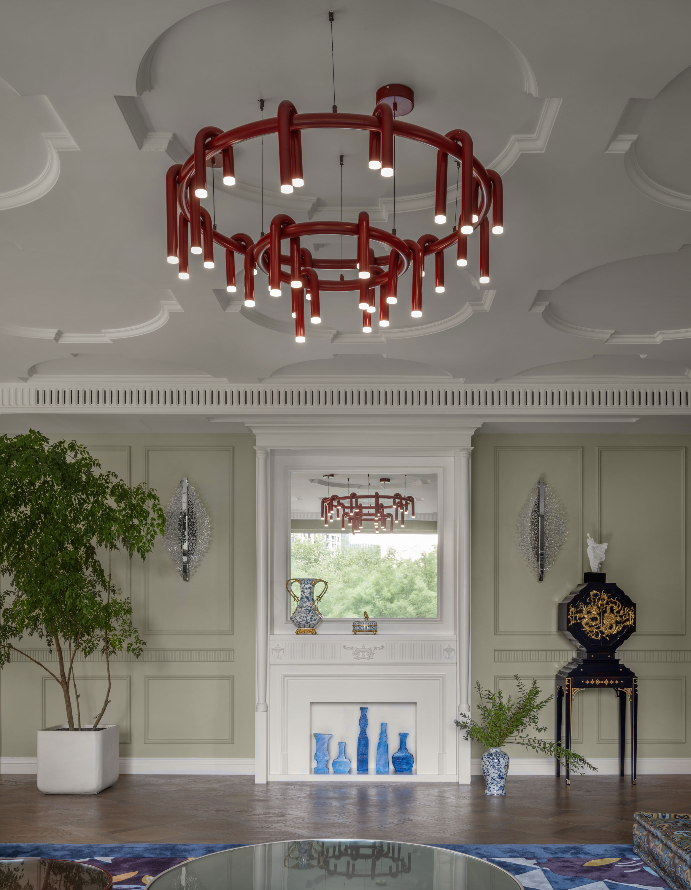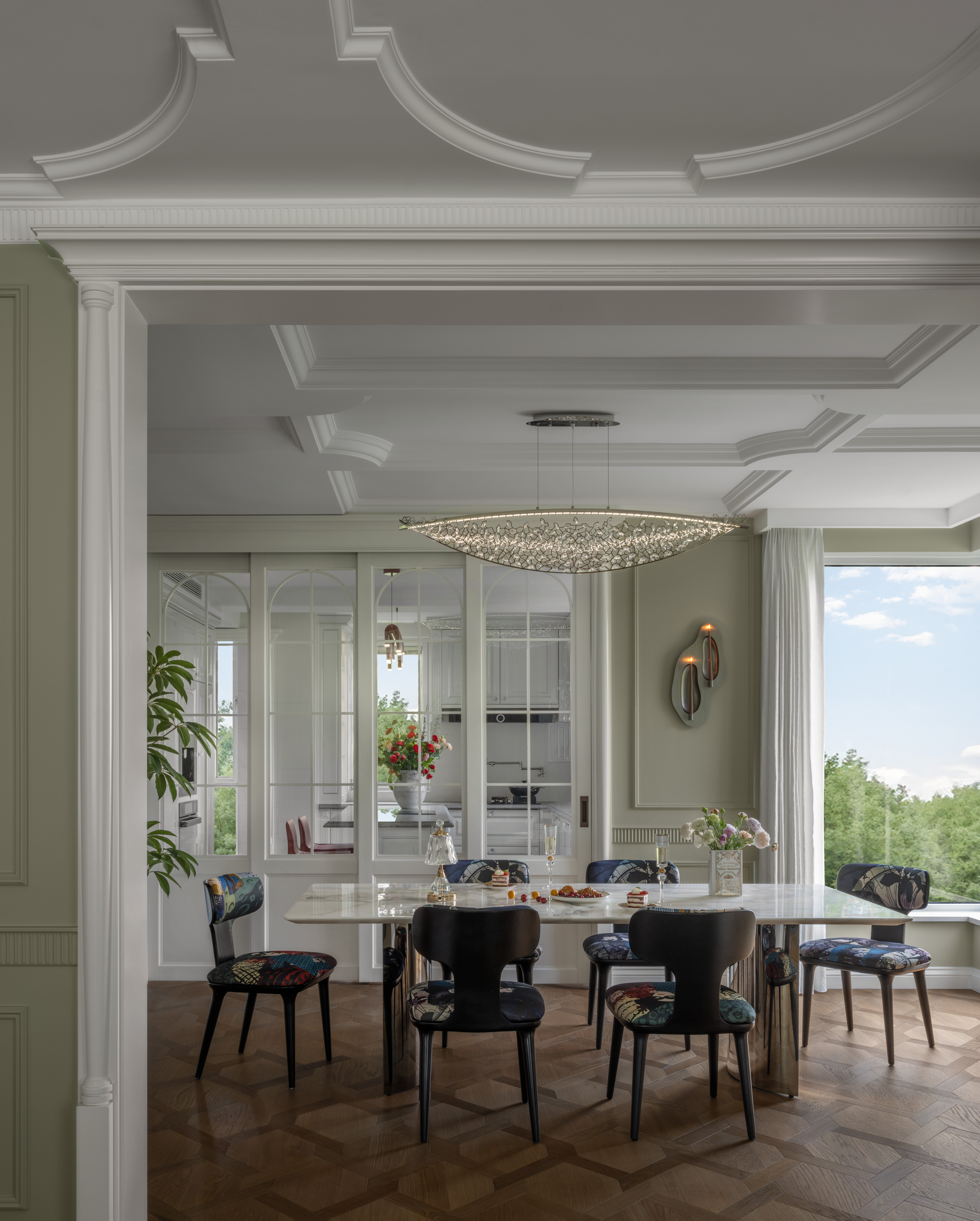 After the renovation, the dining room became bright and airy, with the fragrance of food carried on the breeze. The natural scenery outside resembles a continuous painting, leaving beautiful reflections through the different windows. In the Chinese kitchen, the combination of the island and bar counter meets the need for preparing breakfast for the family in the early morning. In the dining room, a long table awaits the evening, when family members return home. The slightly ritualistic dinner time becomes a moment of love and energy amidst the busyness of life.