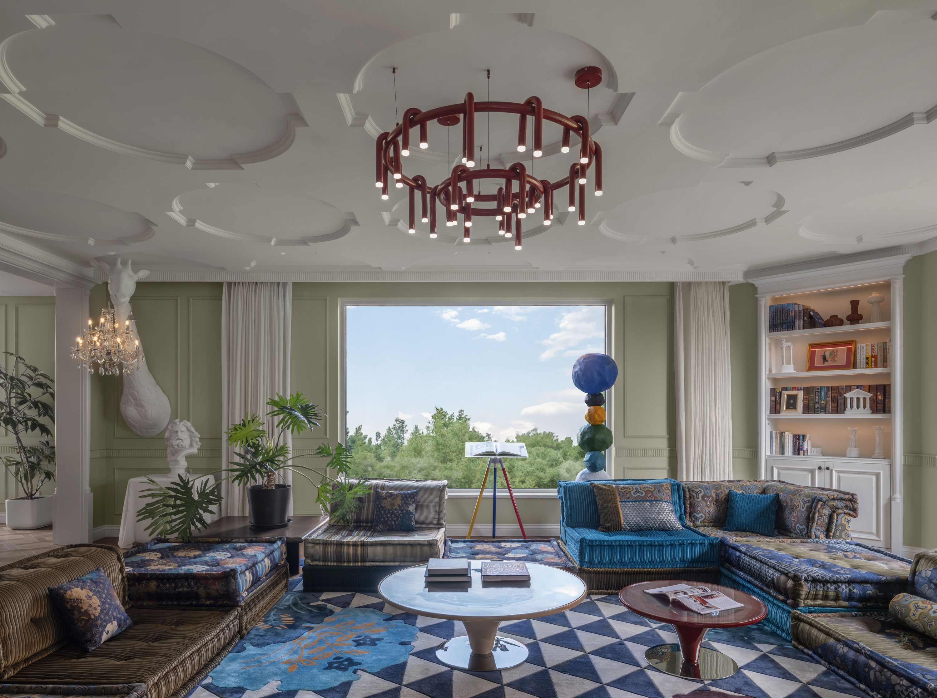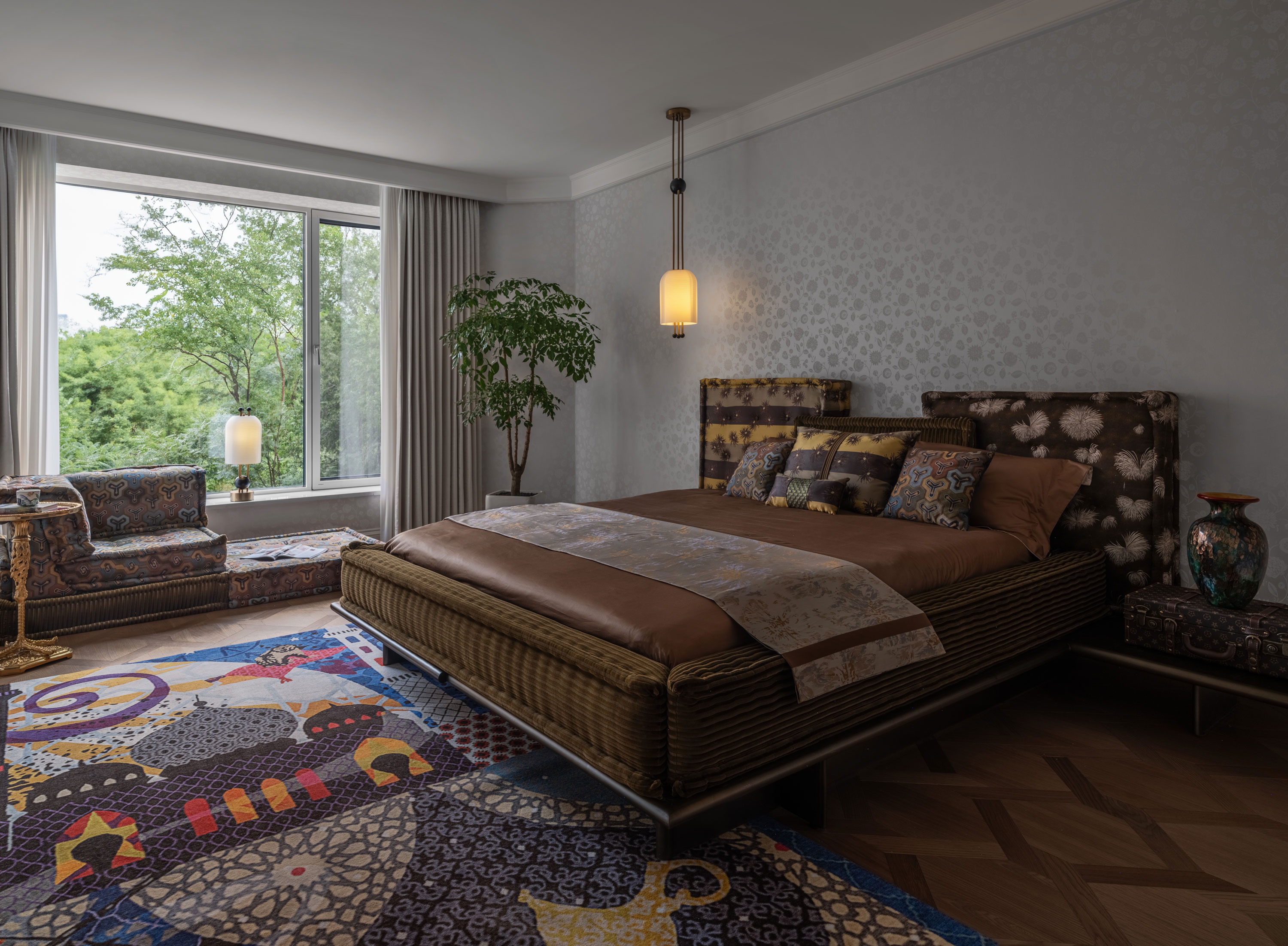 In the living room, with its bright light and open layout, the entire space radiates a sense of vibrant beauty. Breaking away from the conventional single-function sofa, the modular design allows for free combination, arrangement, and stacking. Inspired by traditional Japanese kimonos, the colors and patterns are reinterpreted to create an elegant and refined harmony, symbolizing the changes throughout the day—morning, noon, and evening. Through the windows, you can feel the four seasons, crafting a living space that is refined, elegant, natural, and comfortable. The fresh color palette resembles a light breeze and mist, or the tender buds of a forest, brimming with freely flowing vitality. Immersed in such an ideal home environment, the spirit is equally relaxed and liberated. No matter where you sit, you are always facing the infinite beauty of nature. Everything indoors blooms like flowers, adorning the vast and pure sky.