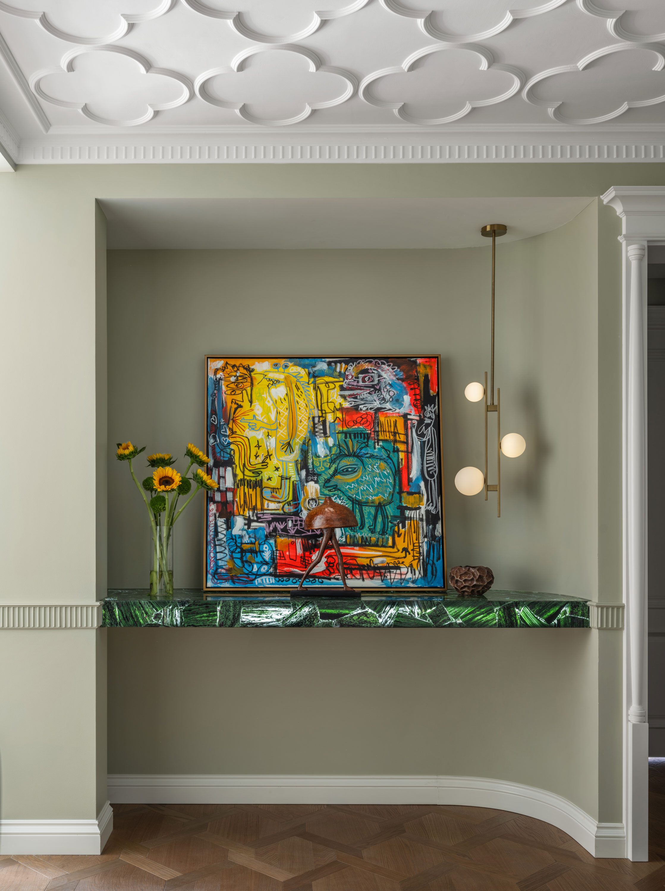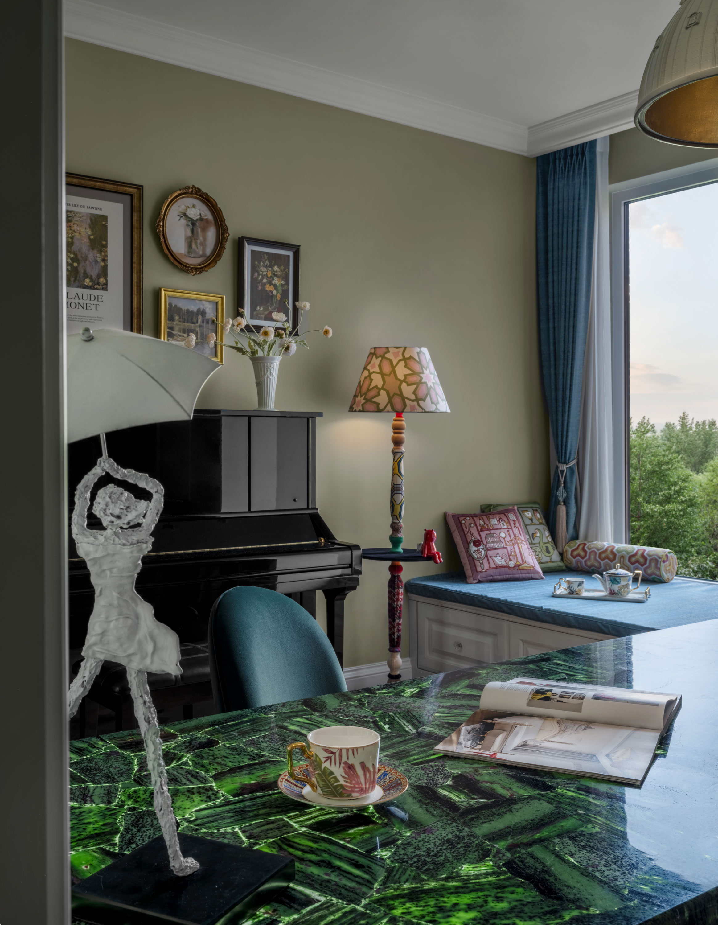In the living room, with its bright light and open layout, the entire space radiates a sense of vibrant beauty. Breaking away from the conventional single-function sofa, the modular design allows for free combination, arrangement, and stacking. Inspired by traditional Japanese kimonos, the colors and patterns are reinterpreted to create an elegant and refined harmony, symbolizing the changes throughout the day—morning, noon, and evening. Through the windows, you can feel the four seasons, crafting a living space that is refined, elegant, natural, and comfortable. The fresh color palette resembles a light breeze and mist, or the tender buds of a forest, brimming with freely flowing vitality. Immersed in such an ideal home environment, the spirit is equally relaxed and liberated. No matter where you sit, you are always facing the infinite beauty of nature. Everything indoors blooms like flowers, adorning the vast and pure sky.