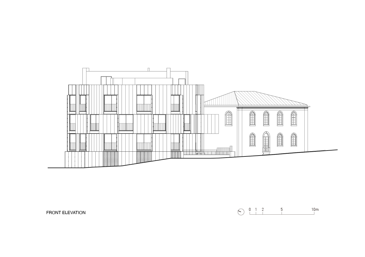 Inside the building, each apartment has its own identity which is reinforced either by features such as surrounding views or the architectural details of the pre-existing house. Some of the apartments are cosy and intimate, with small windows connecting to the interior backyard of the building. Some are generously open to the outside with big windows and roof terraces.