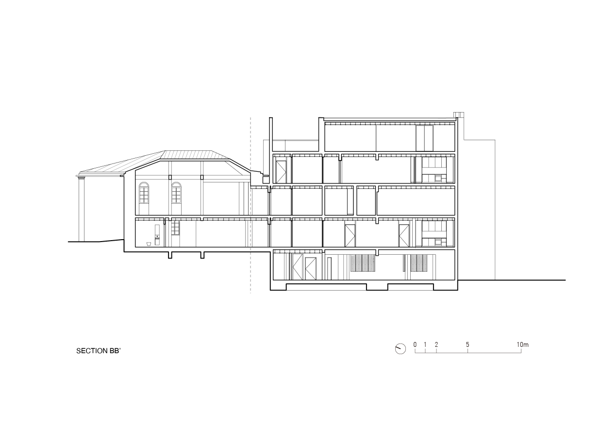 The pre-existing building, an early 20th century house with a characteristic tiled roof and yellow façade, has been transformed into two apartments, a two-bedroom apartment on the ground floor and a one-bedroom apartment above. Meanwhile the new extension includes five apartments, two four-bedroom apartments, two-bedroom apartments and one three-bedroom apartment. The old and new parts of the project are connected by a common stairwell.